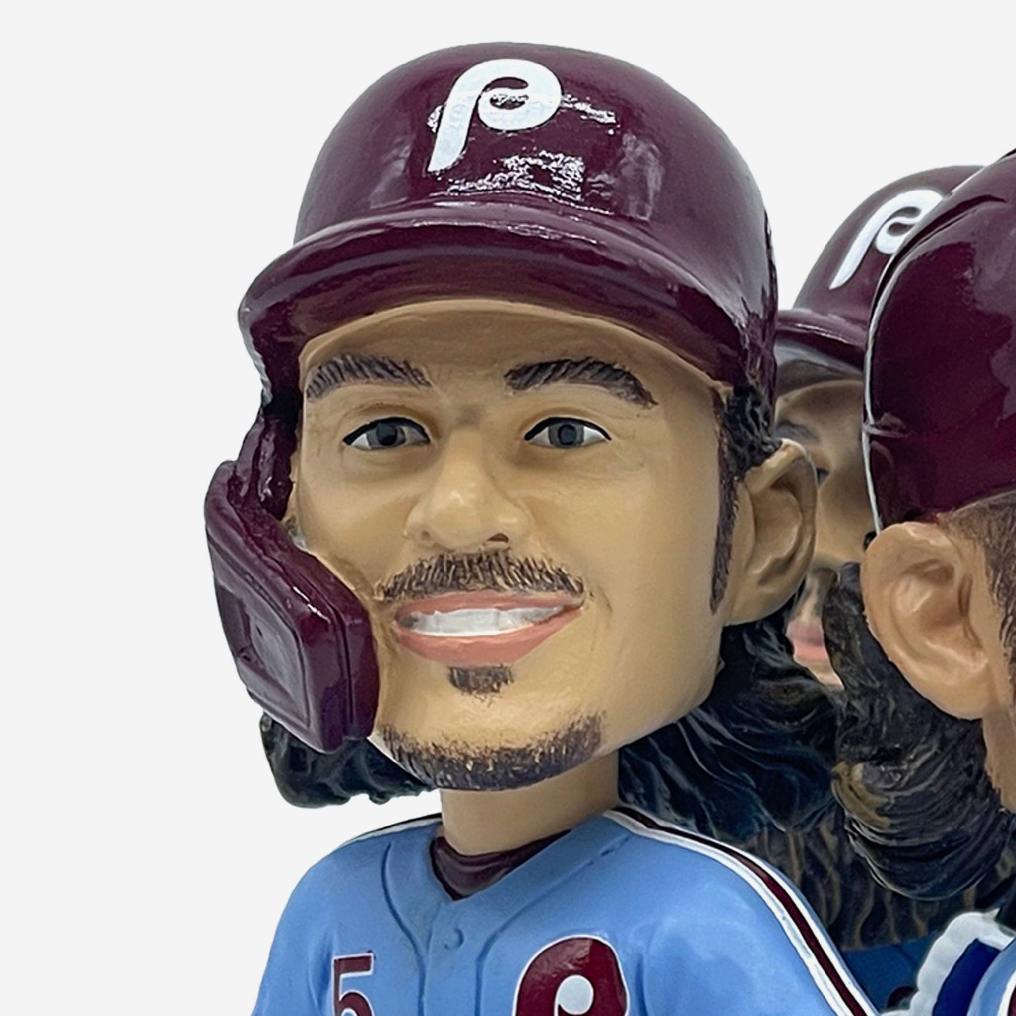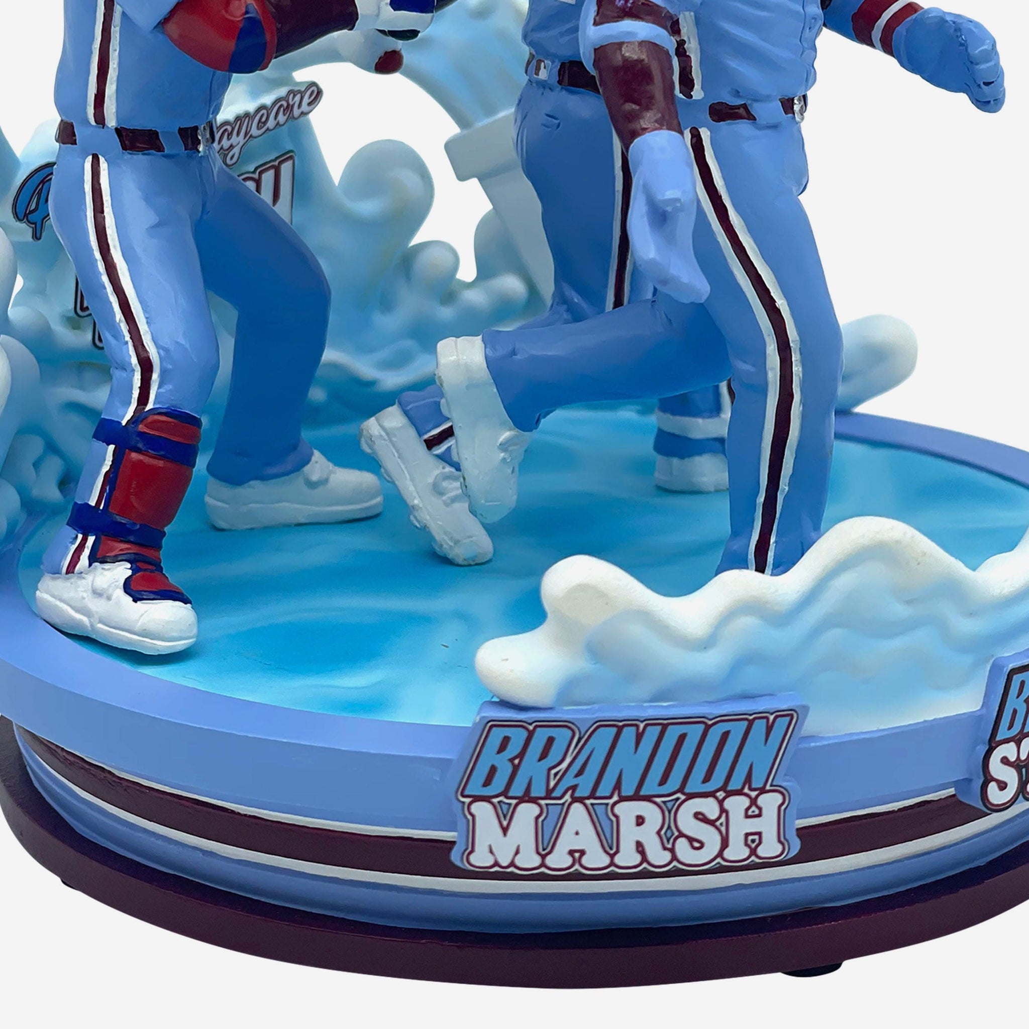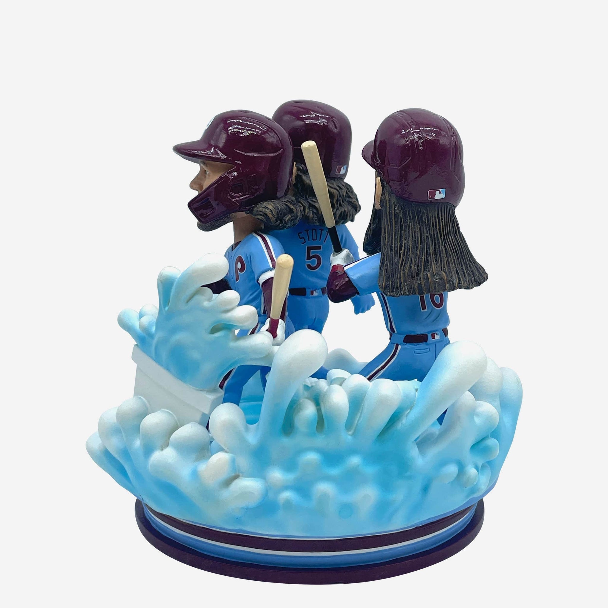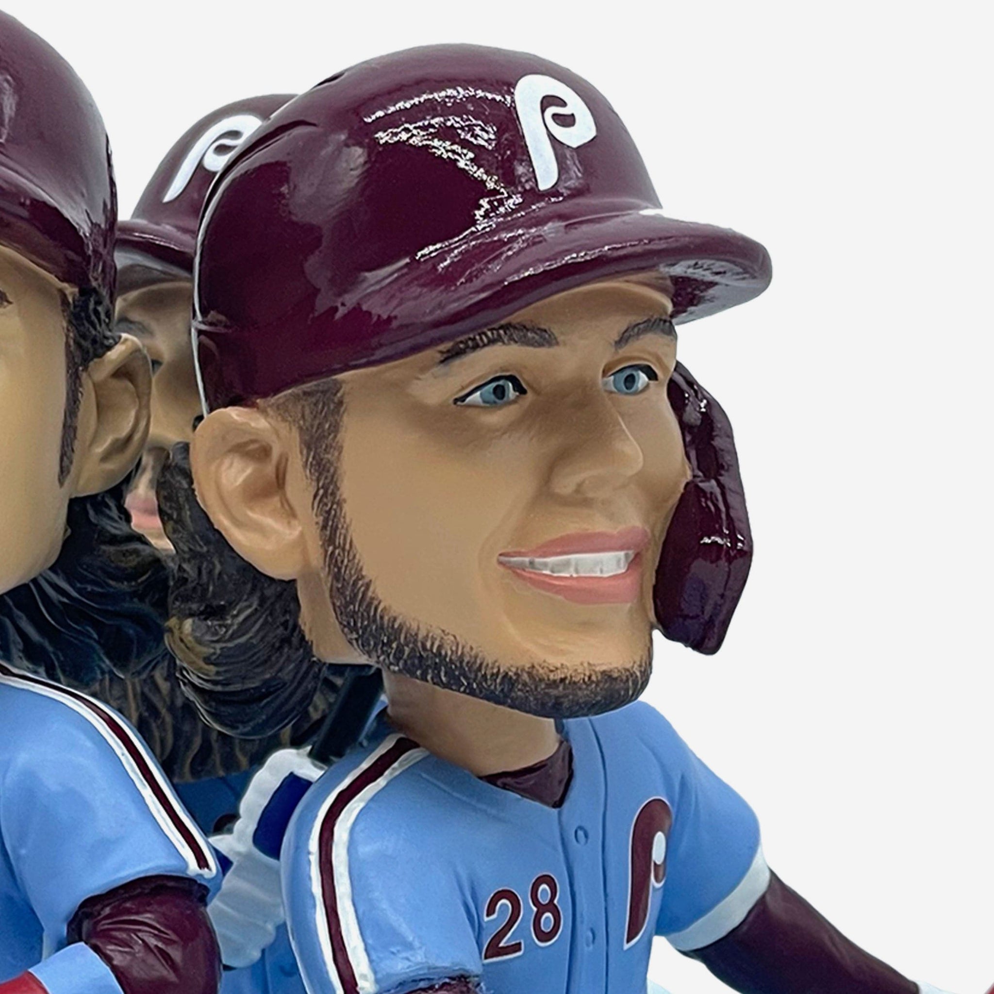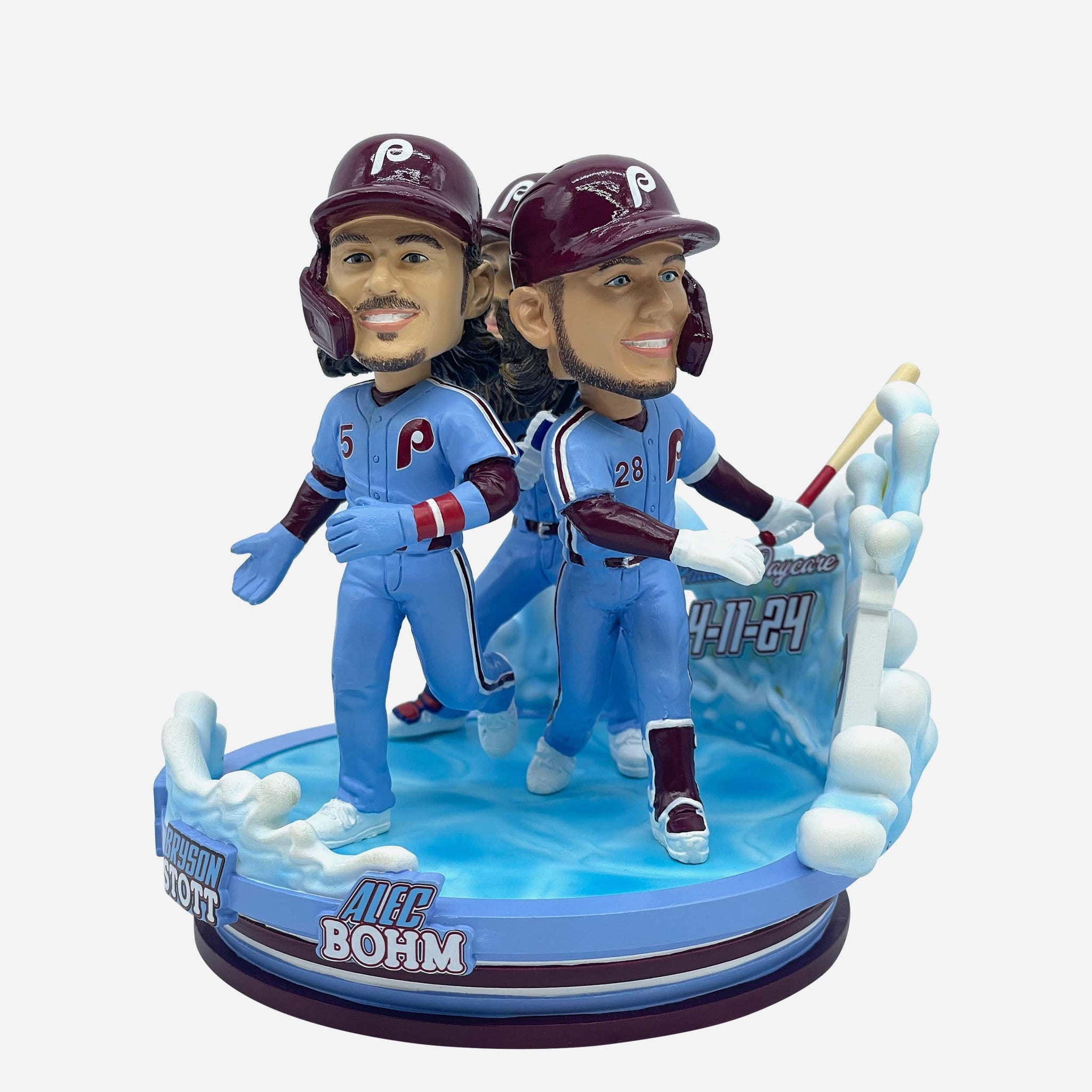 • Portrays Brandon Marsh, Bryson Stott, and Alec Bohm wearing their blue gameday uniforms in an action pose, ready to splash it up