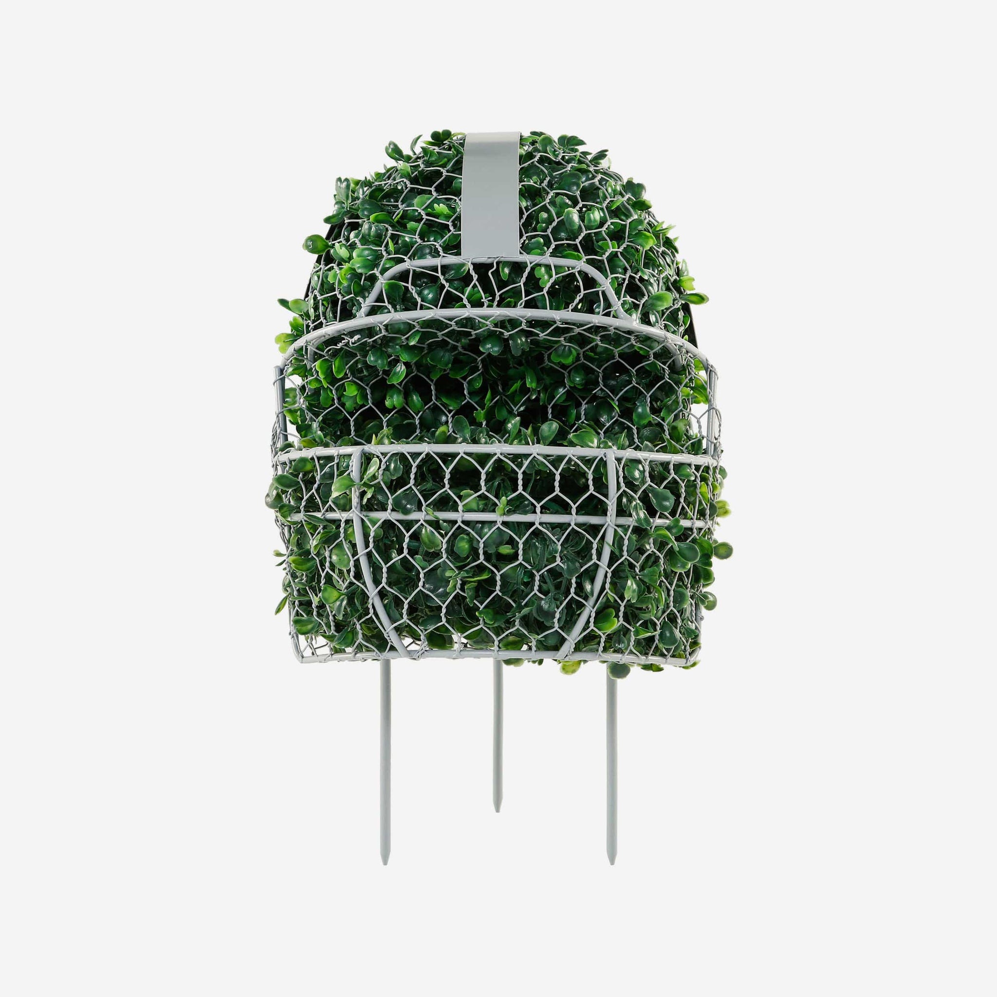 - Helmet-shaped topiary frame with interior faux leaves that will look great in your garden