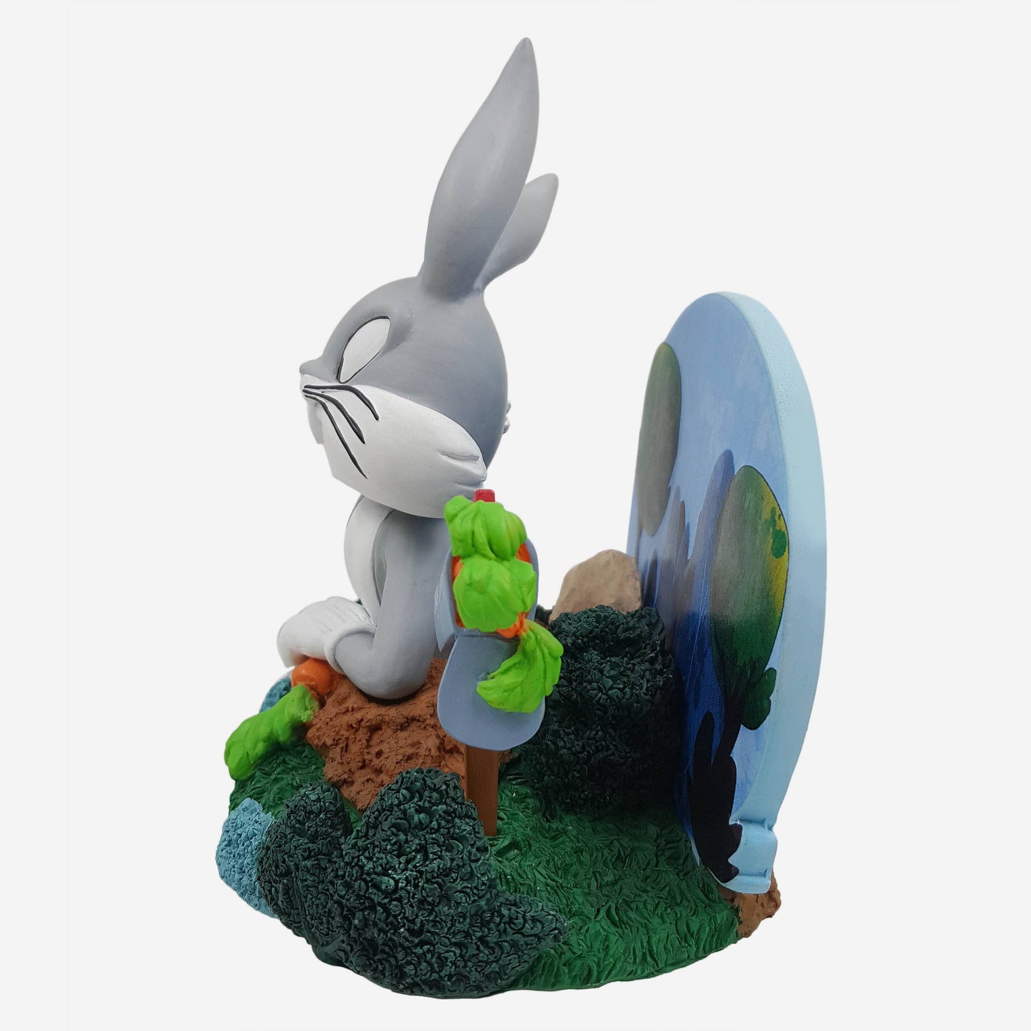 - Portrays Bugs Bunny posing while holding a carrot in front of a cartoon forest backdrop, welcoming you to the world of Looney Tunes