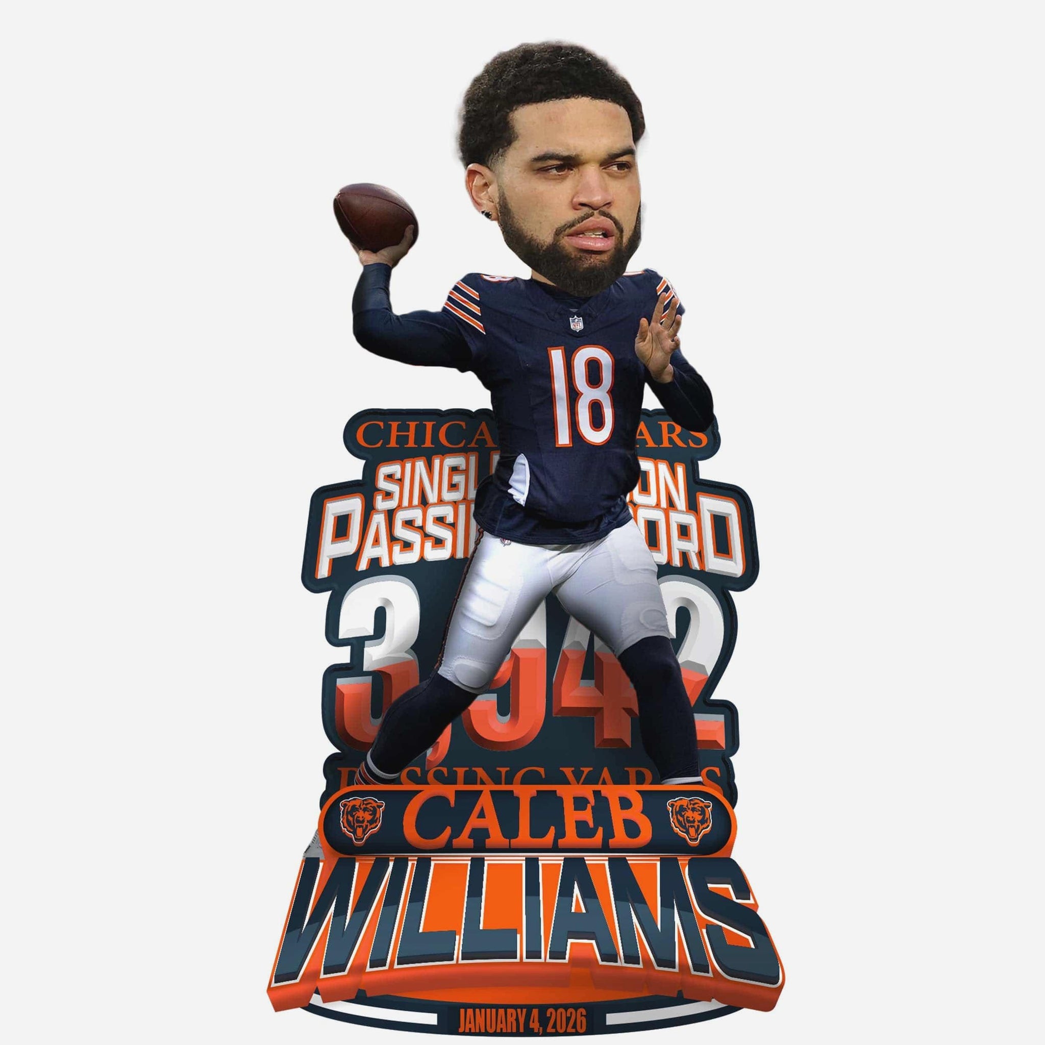 A franchise record. A new era under center. Celebrate a historic moment in Chicago Bears history with this Caleb Williams Chicago Bears Franchise Single Season Passing Yards Record Bobblehead.