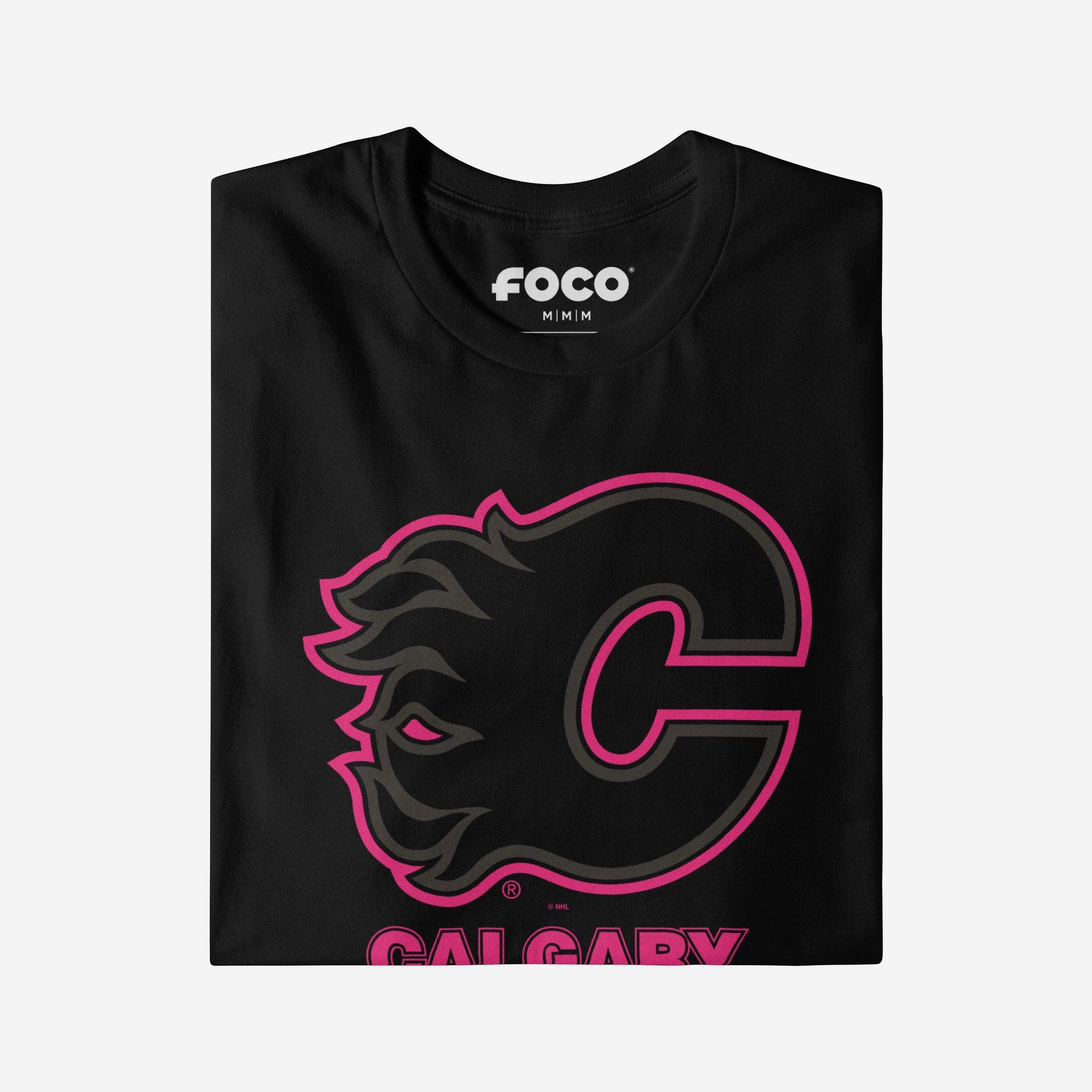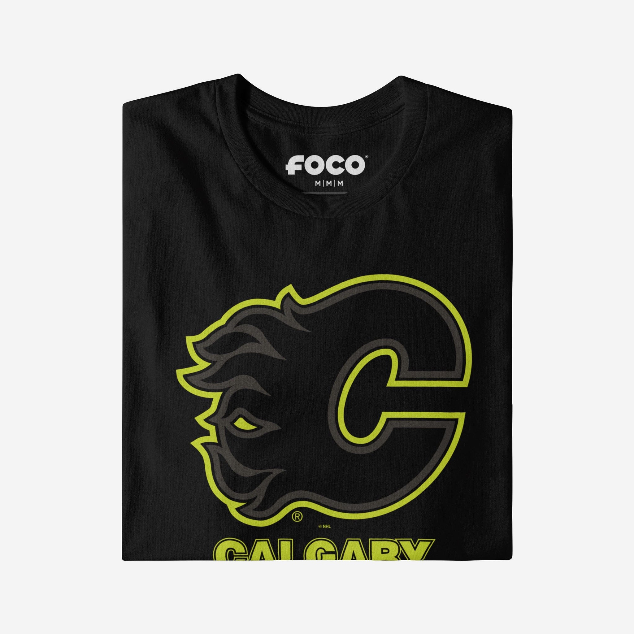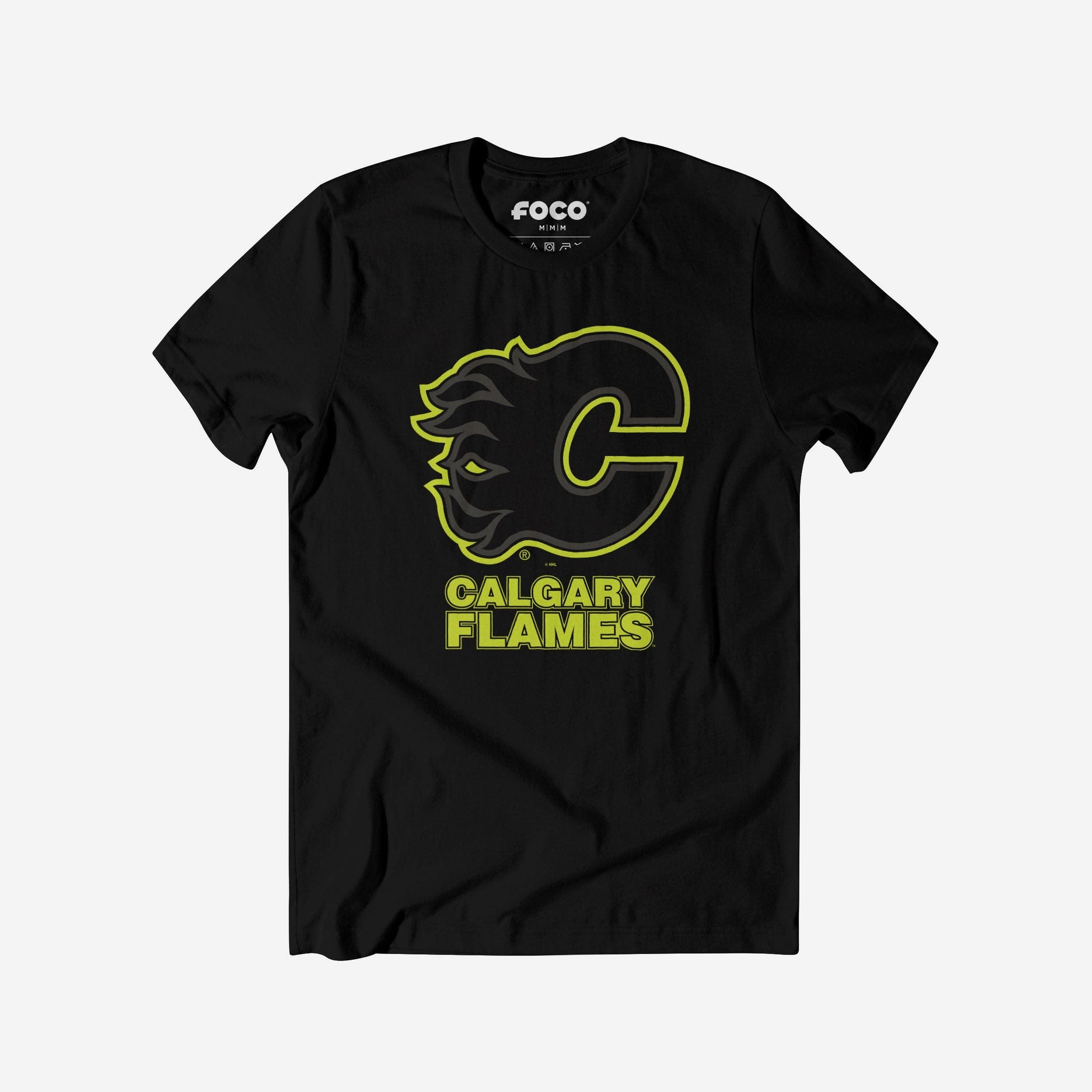 - Team logo display with highlight outline: The front of this apparel features a black Calgary Flames team logo display outlined in neon, and a neon wordmark team name display