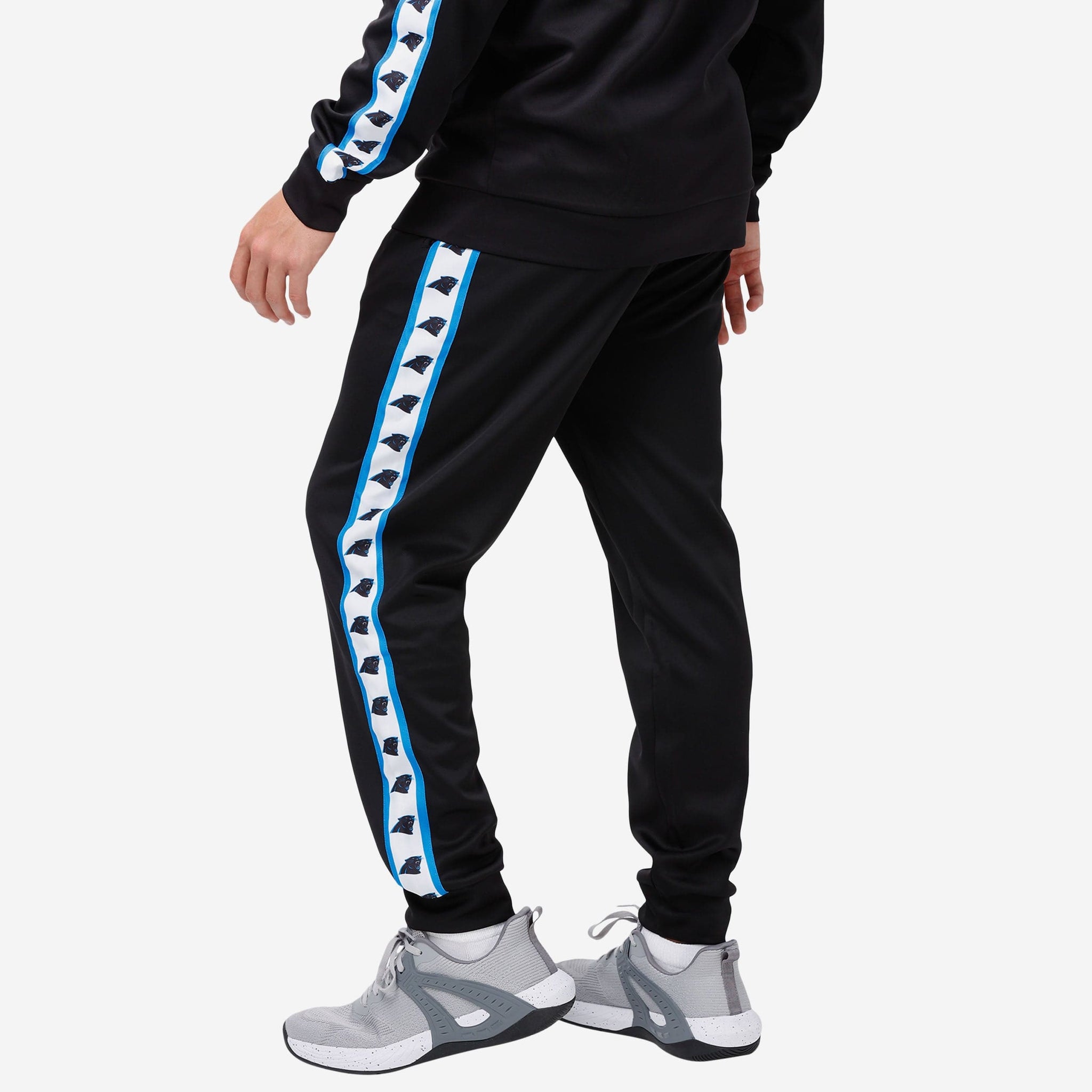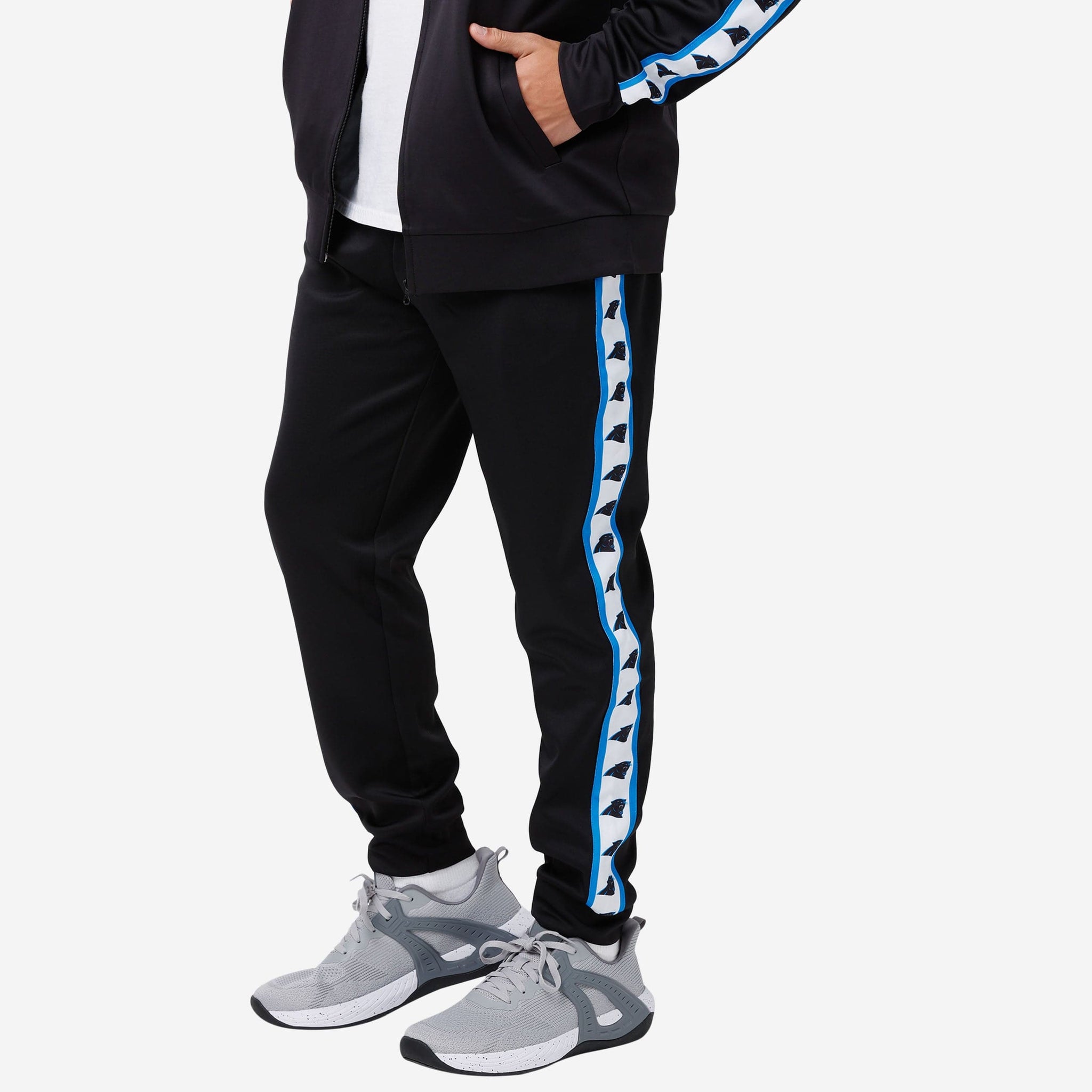You put your pants on one leg at a time, just like any fan. Your pants are just a lot more stylish than most. Make sure you're the most fashionable fan at the tailgate or the gym with these Carolina Panthers Stripe Logo Track Pants.
