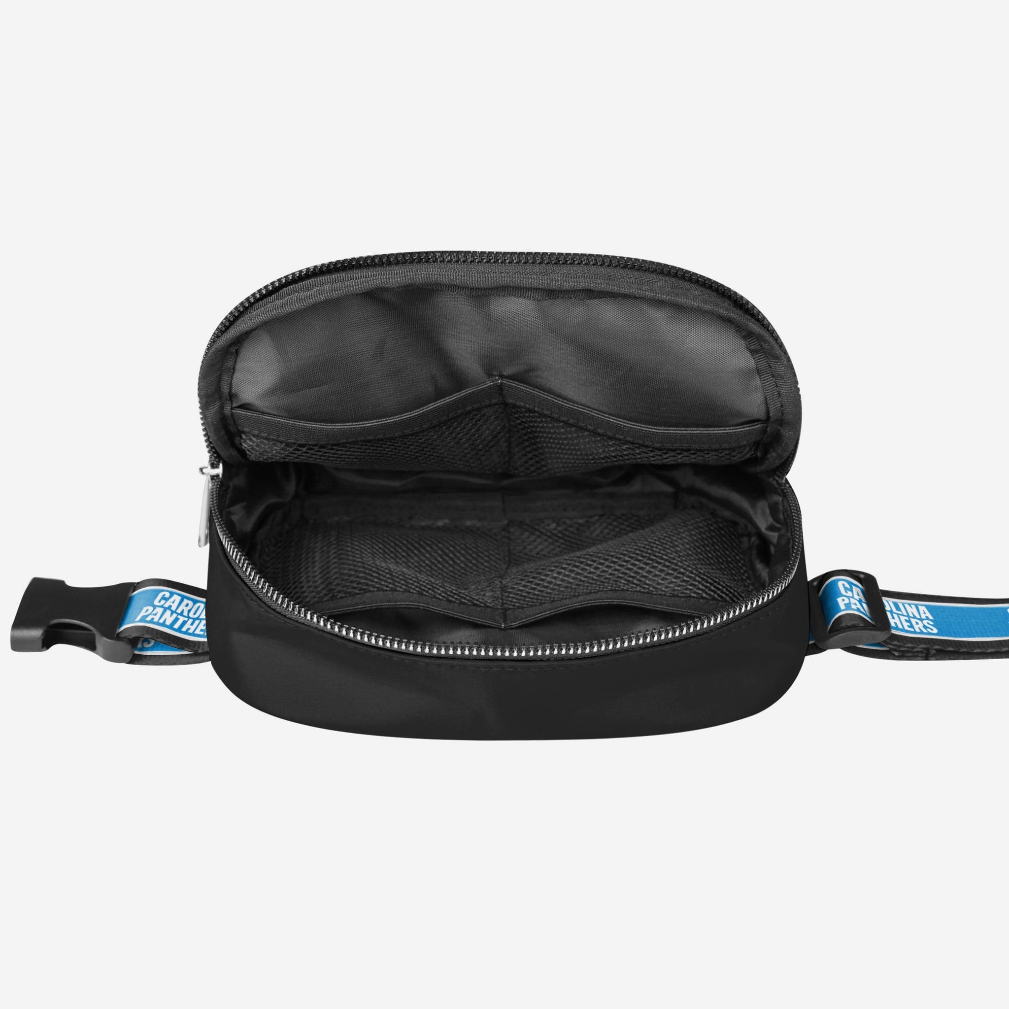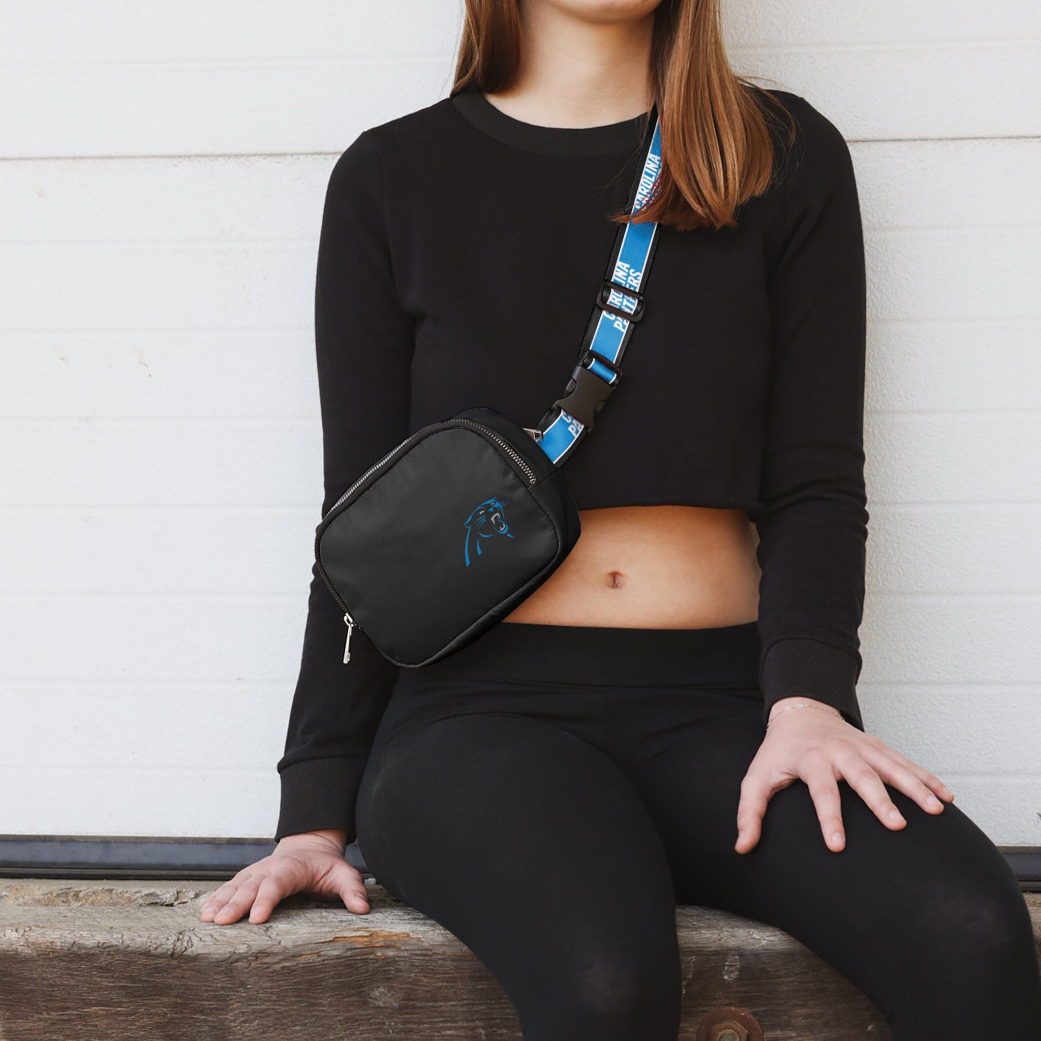 Keys. Wallet. Team spirit. Yep, you've got everything you need right here in this Carolina Panthers Team Wordmark Crossbody Belt Bag, whether you're running some errands or running things at the tailgate.