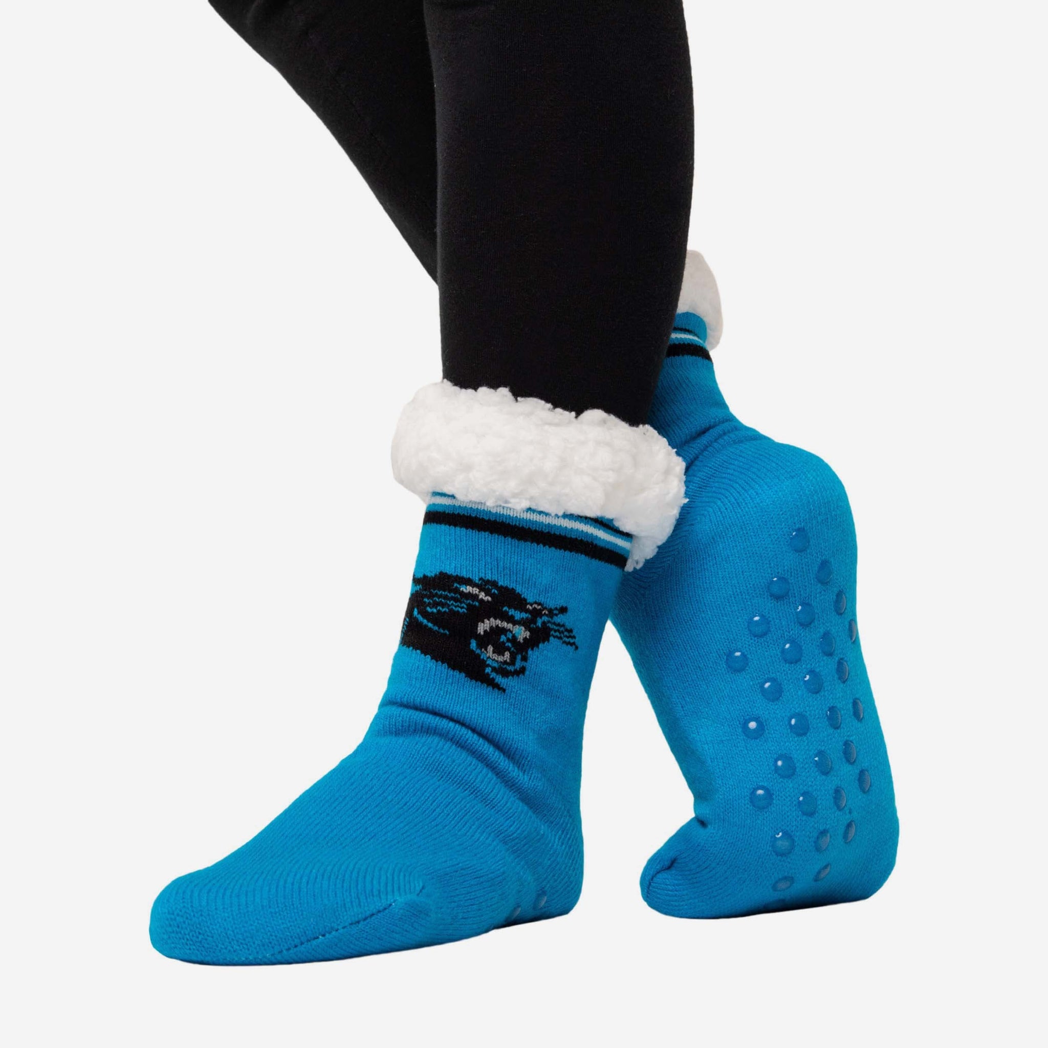 Name a more dynamic duo than the comfort and team spirit on display in these Carolina Panthers Stripe Logo Tall Footy Slipper Socks. We'll wait.