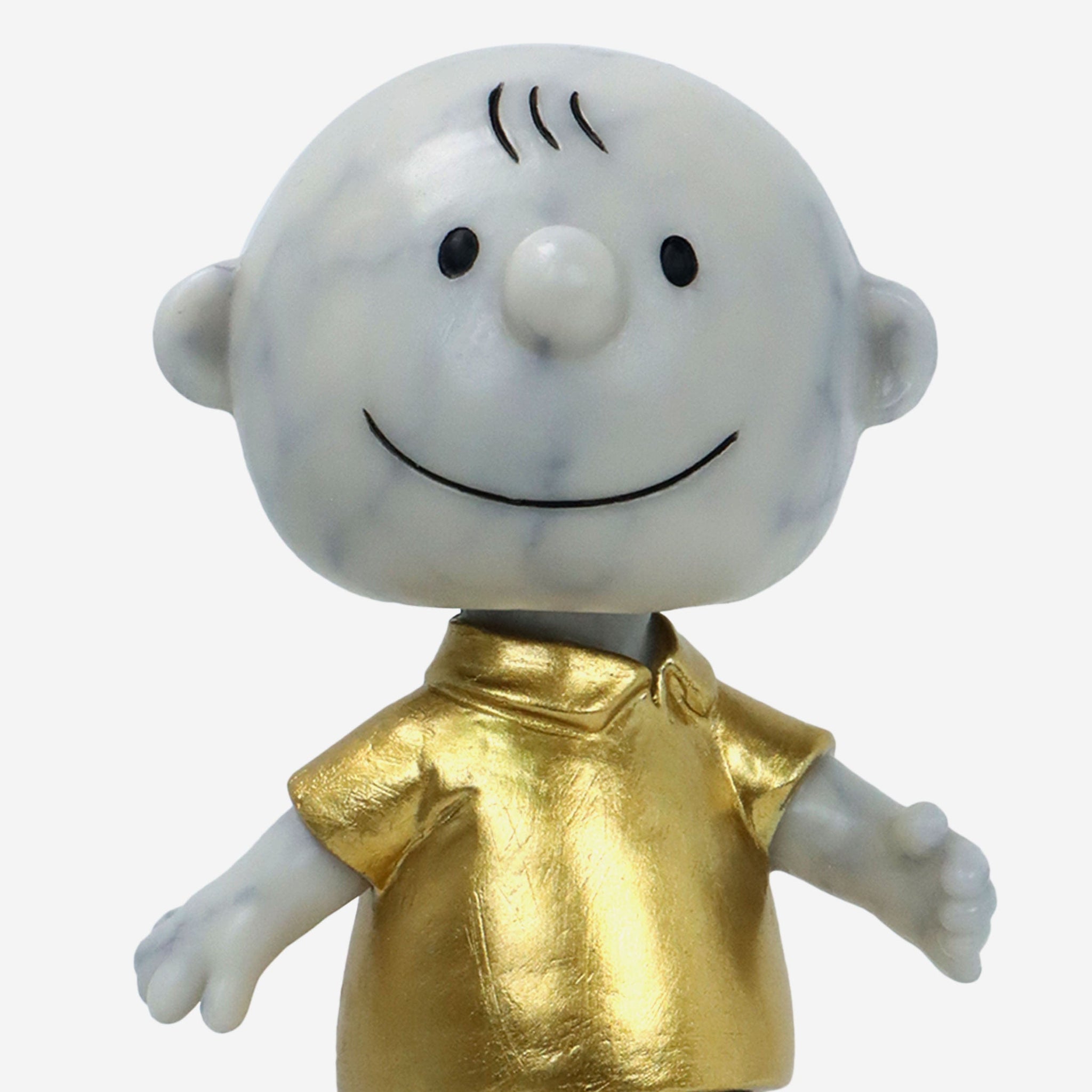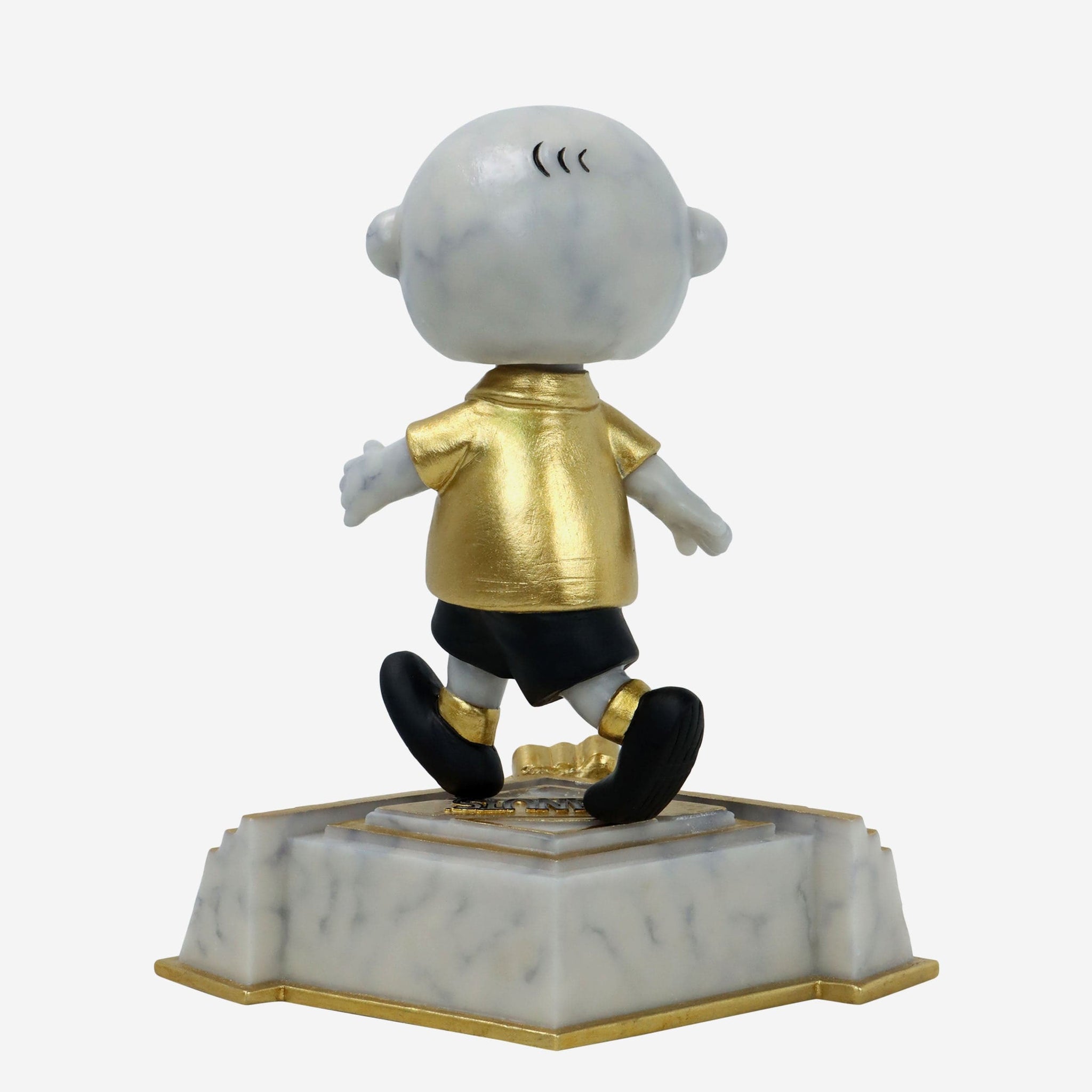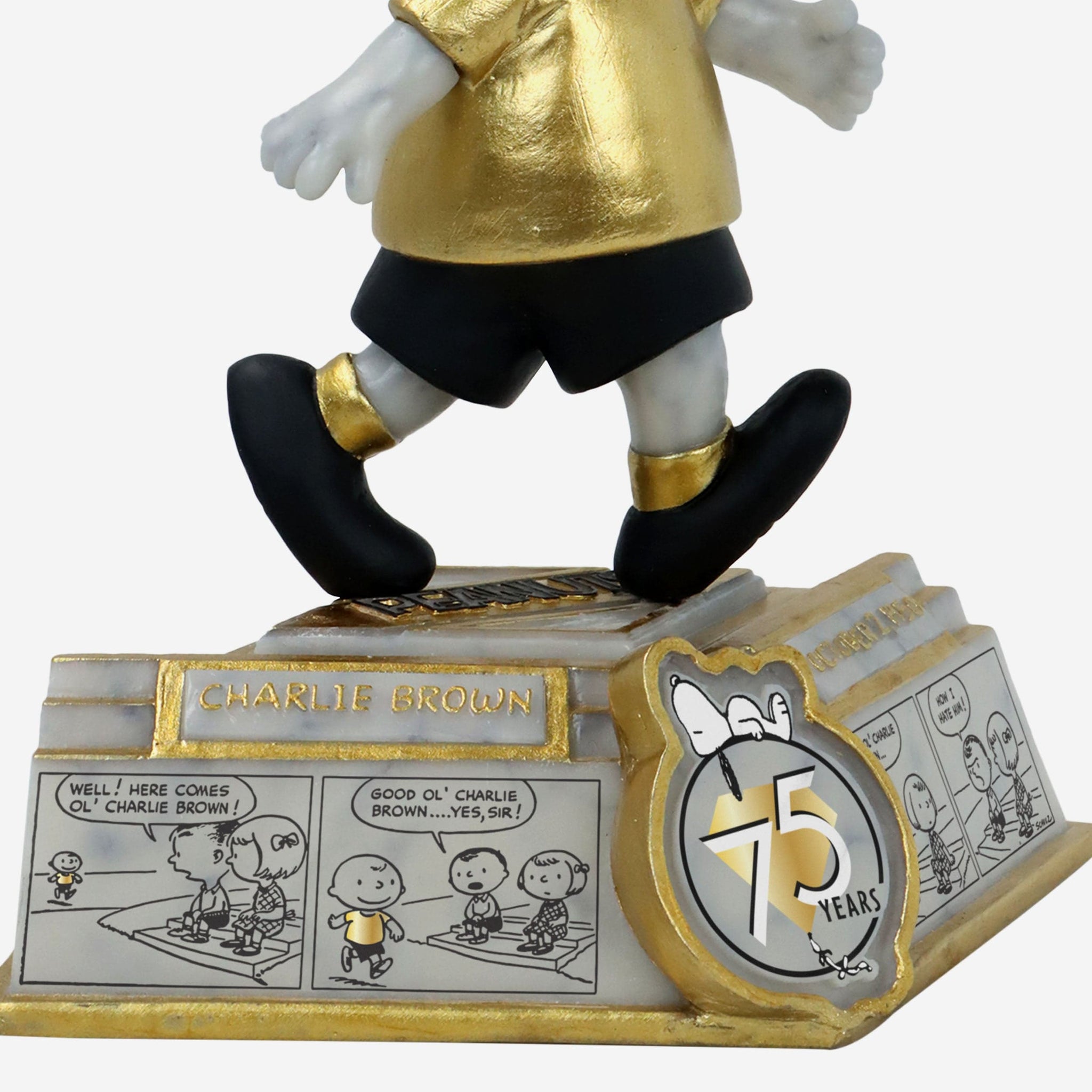 • Portrays Charlie Brown wearing a gold shirt and black pants, ready to celebrate 75 years since his first comic appearance