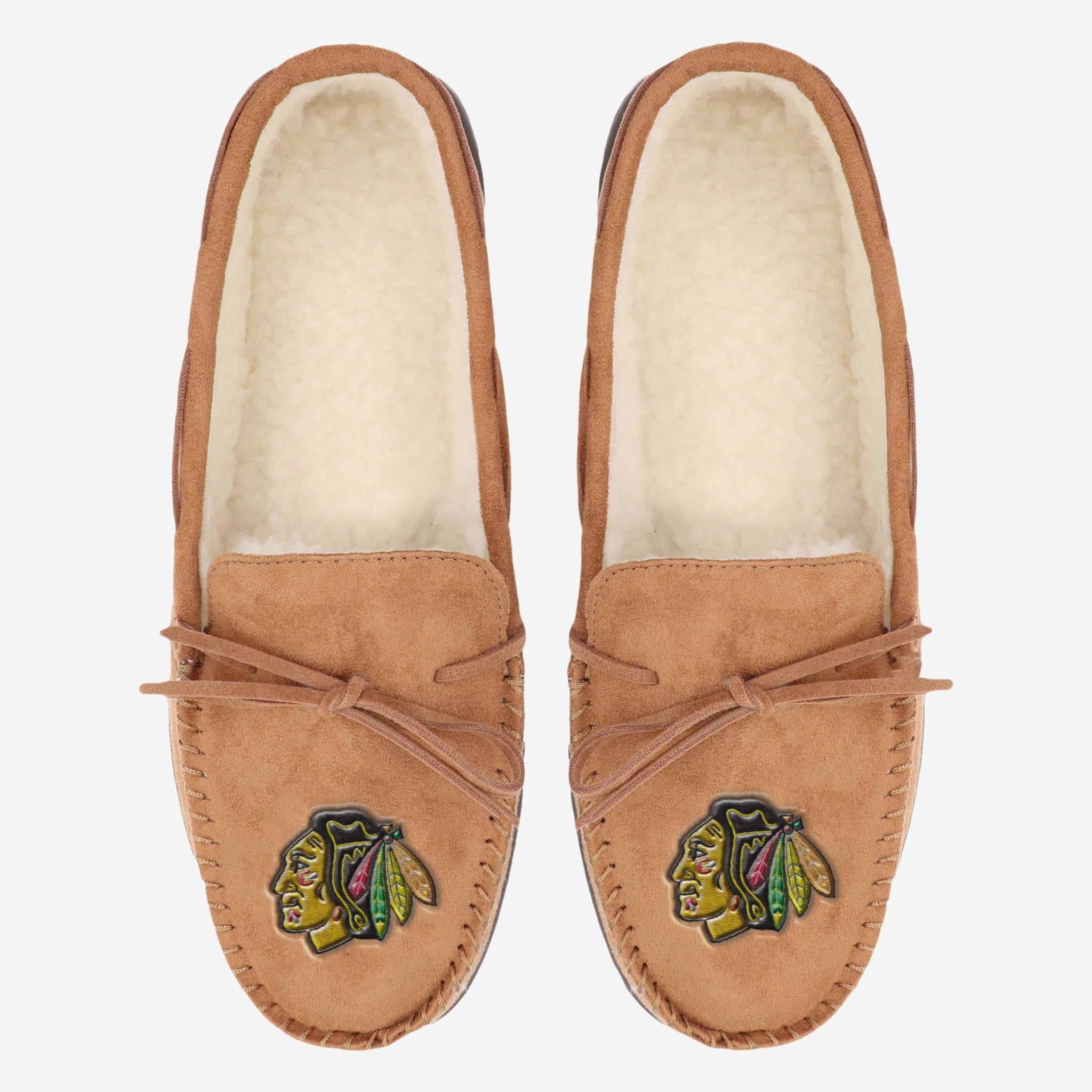 Moccasins? Cool. Comfy slippers? Also cool. Chicago Blackhawks Moccasin Slippers? Mind = blown. The future is now, friend.