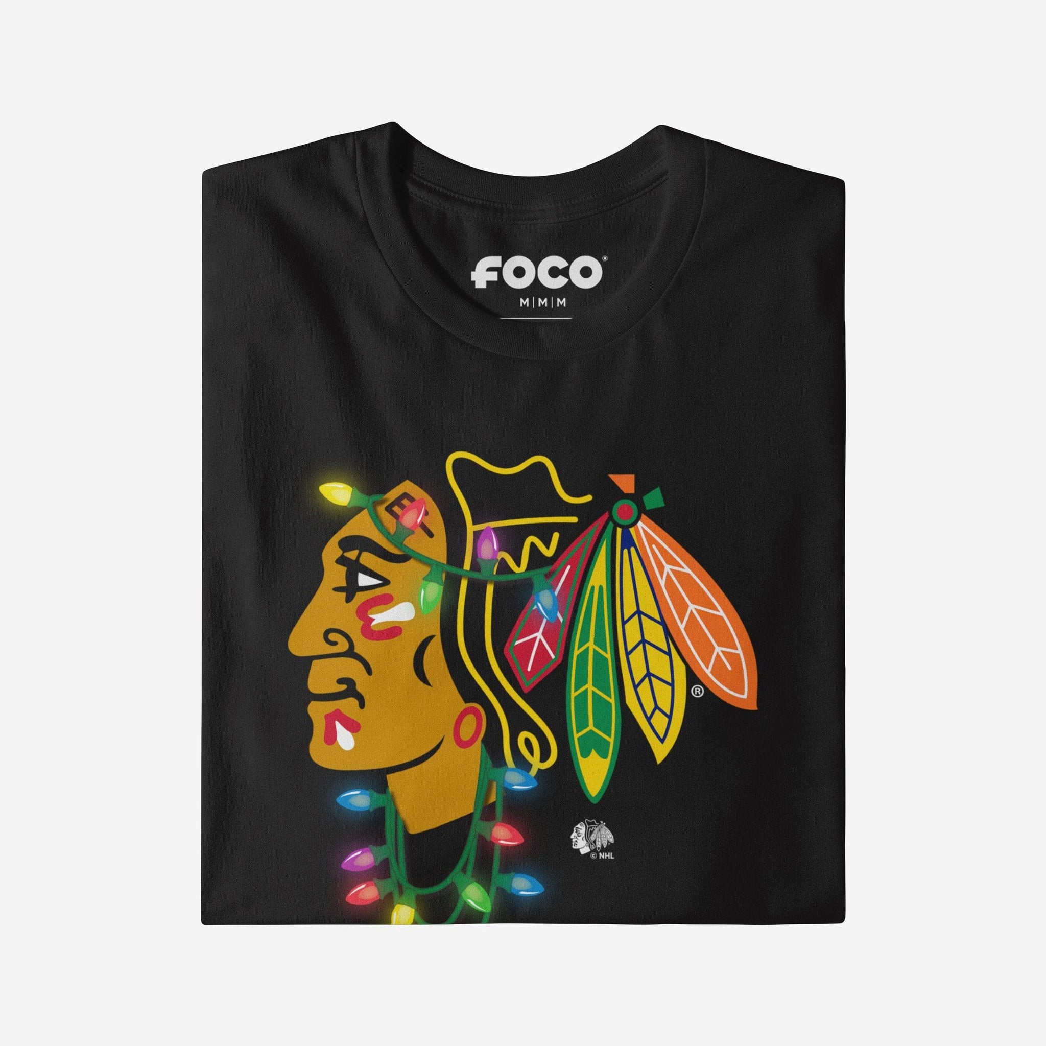 Chicago Blackhawks Primary Logo Holiday Lights T-Shirt FOCO S - FOCO.com