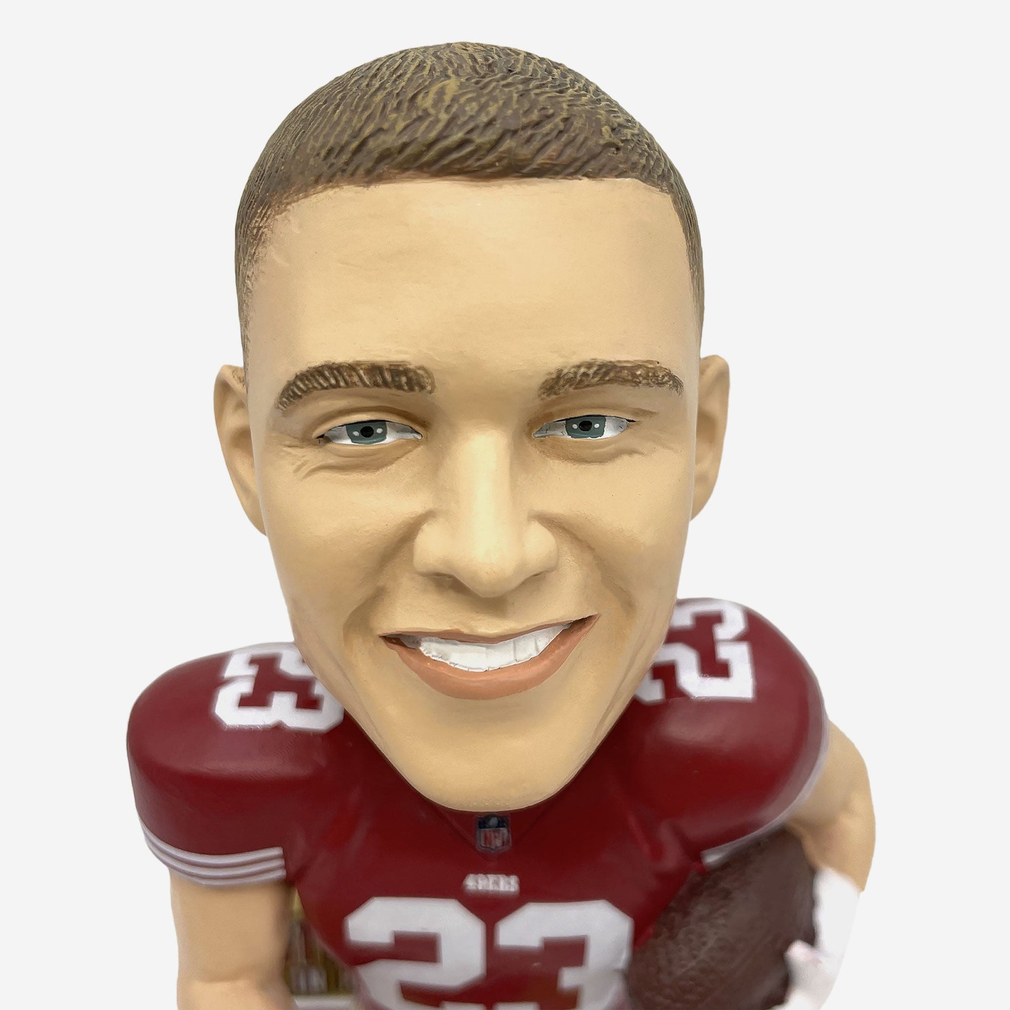 - Portrays McCaffrey wearing his red gameday uniform in an action pose, ready to add to that touchdown total
