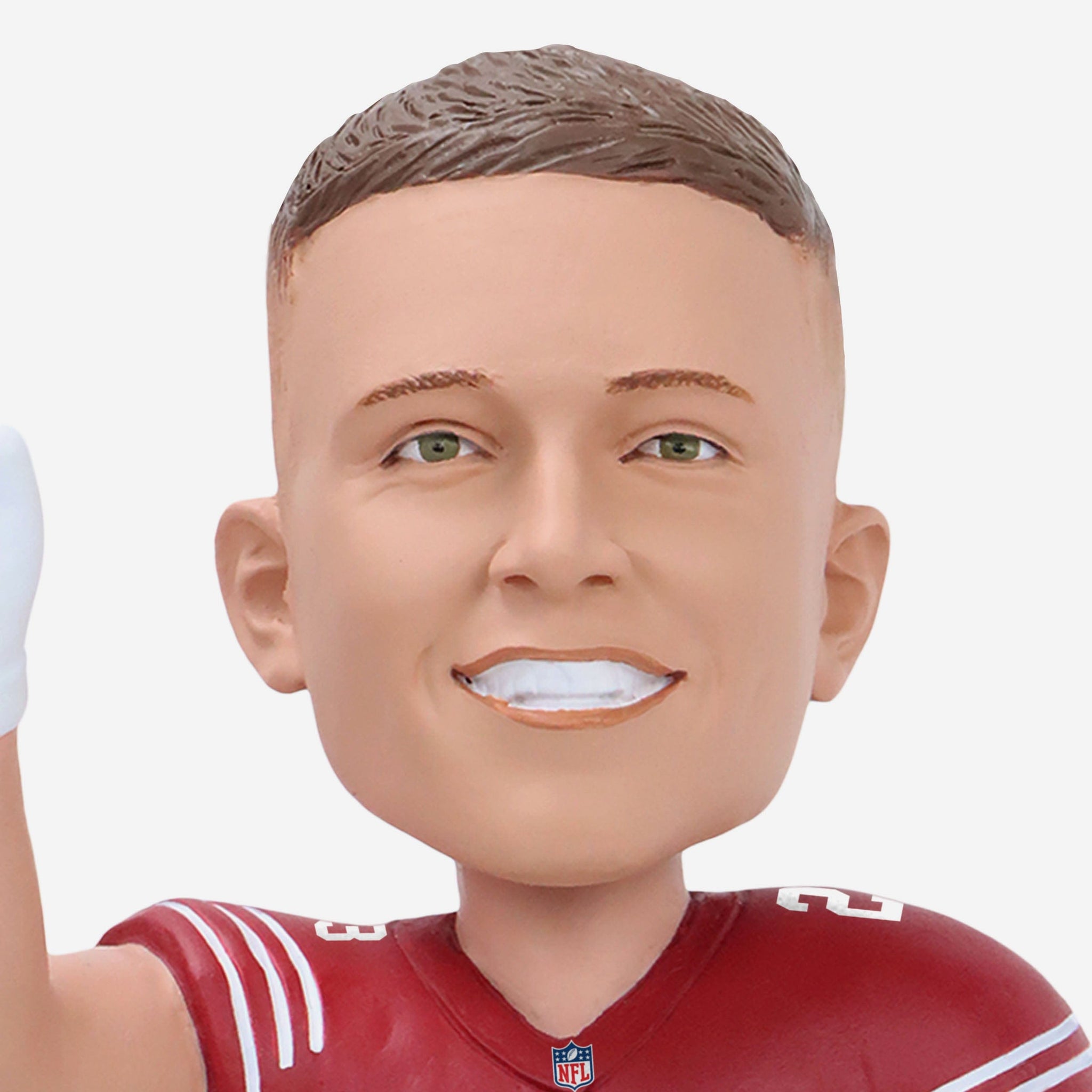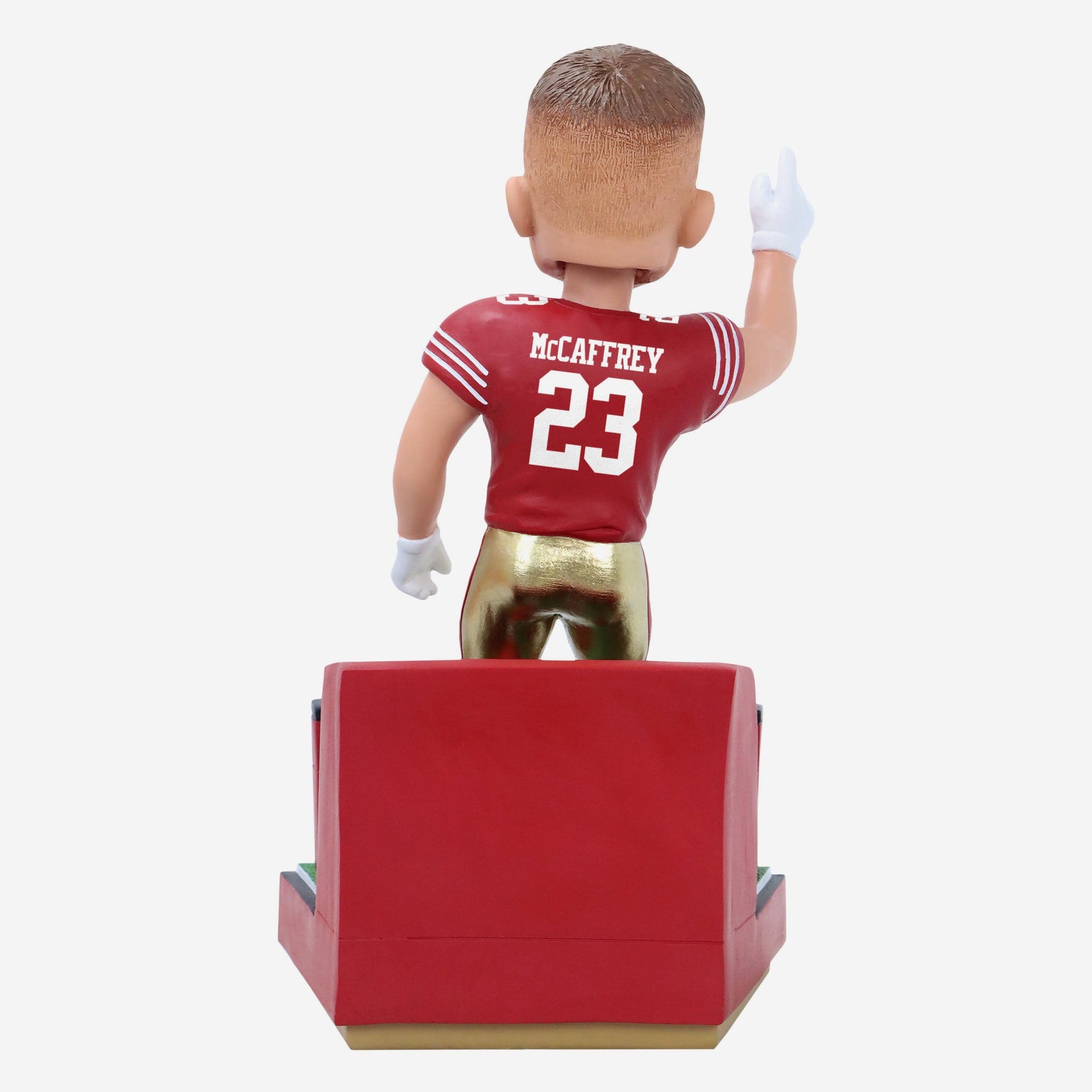 • Portrays McCaffrey posing in his red gameday uniform in an action pose, ready to take the field