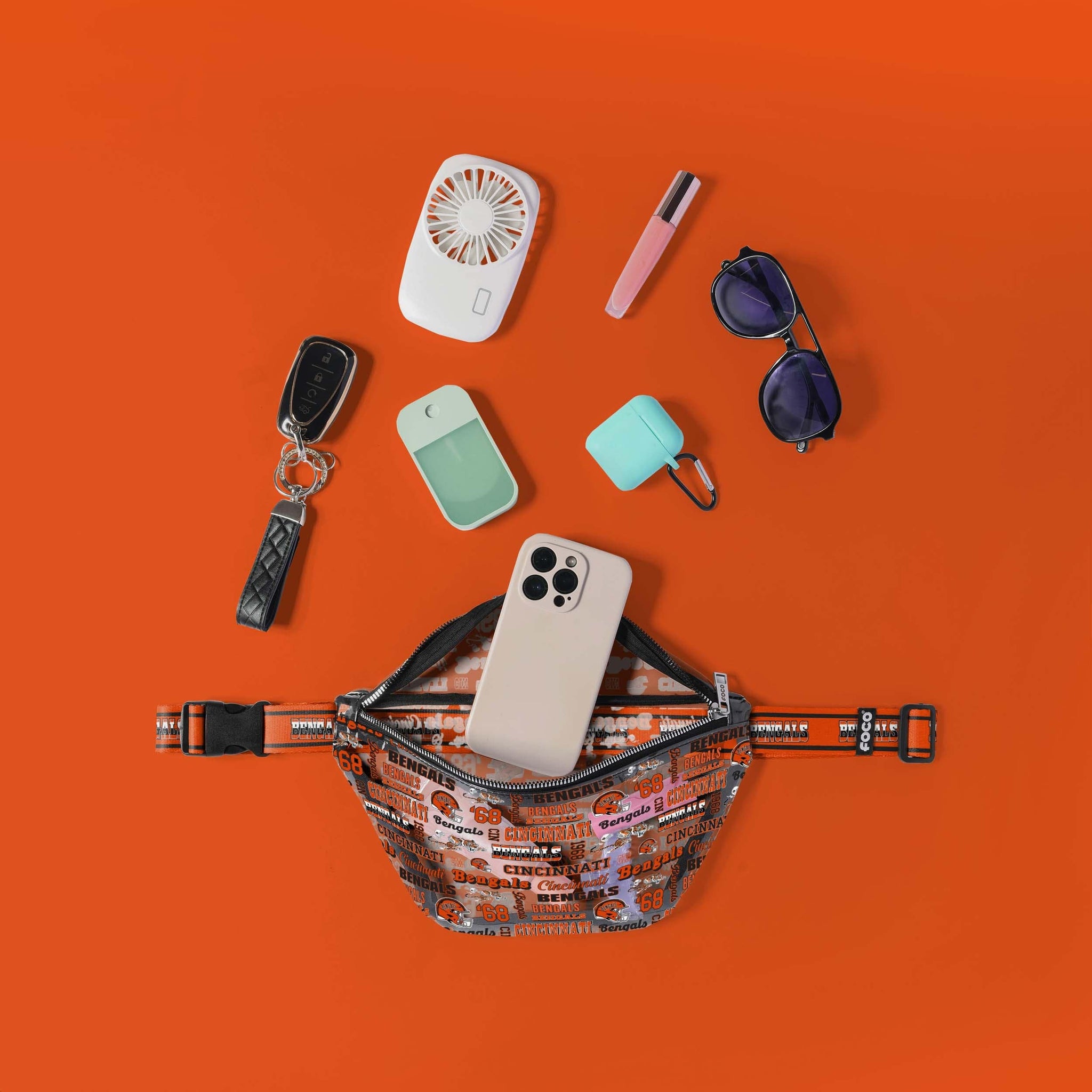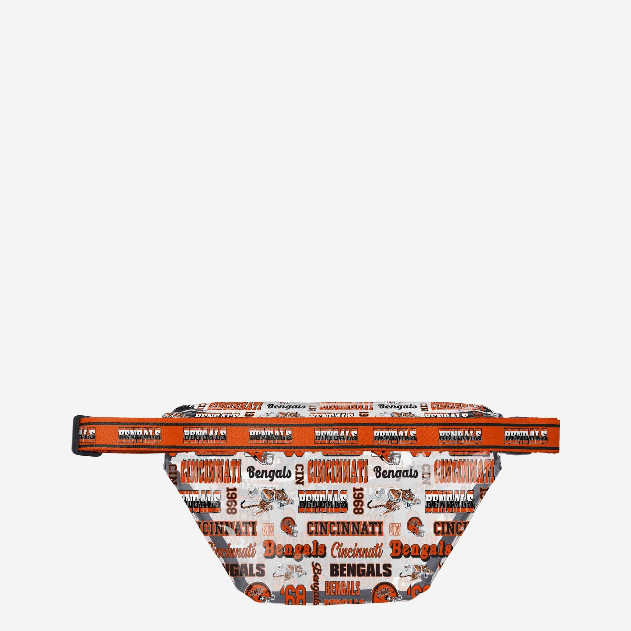 Looking for a fashionable bag for your fan fit? The answer is clear. You’ll have everything you need to be your best on gameday and every day with the Cincinnati Bengals Repeat Retro Print Clear Fanny Pack.