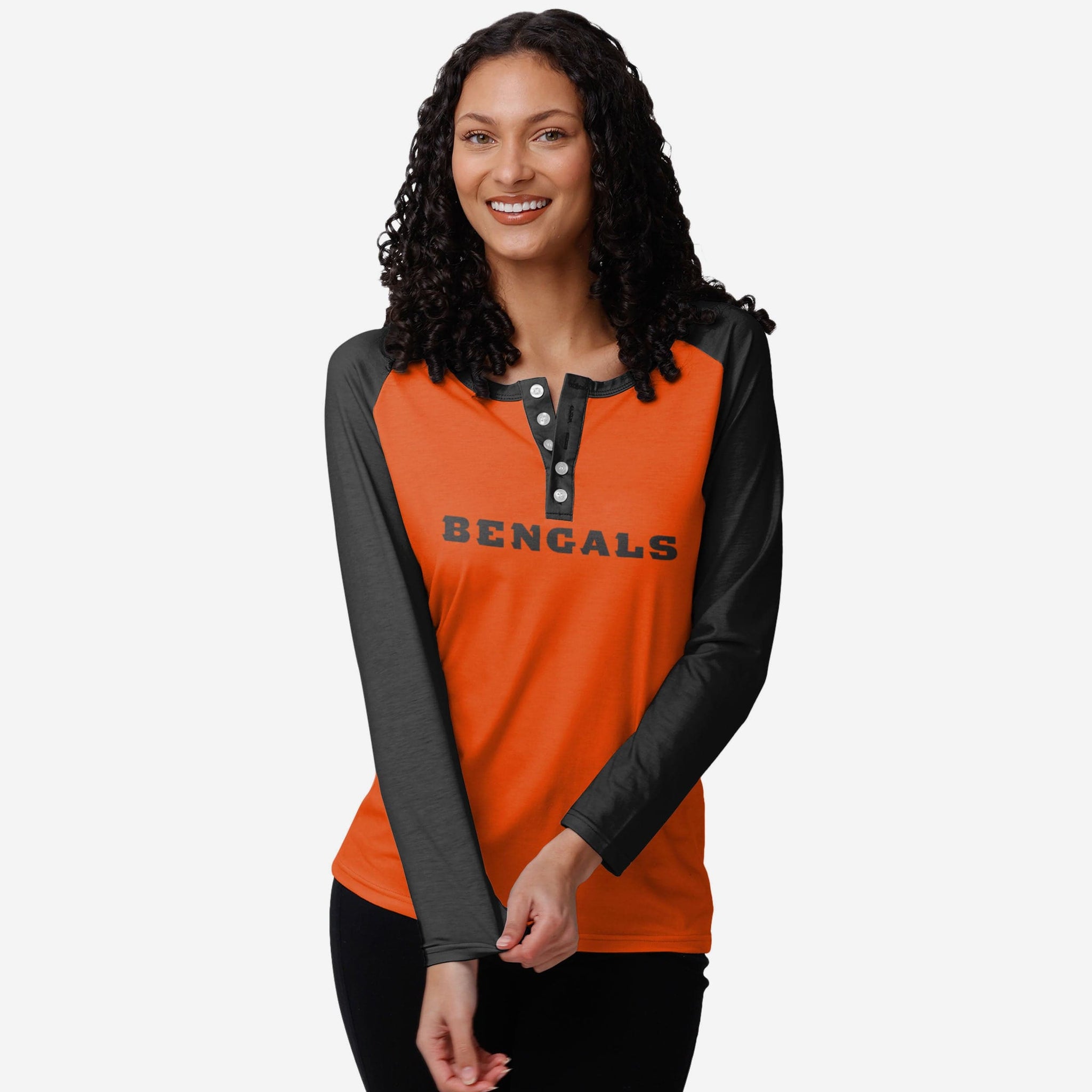Spread the word(mark)! Dress to impress and let your team spirit speak for itself by rocking this Cincinnati Bengals Women's Big Wordmark Long Sleeve Henley.