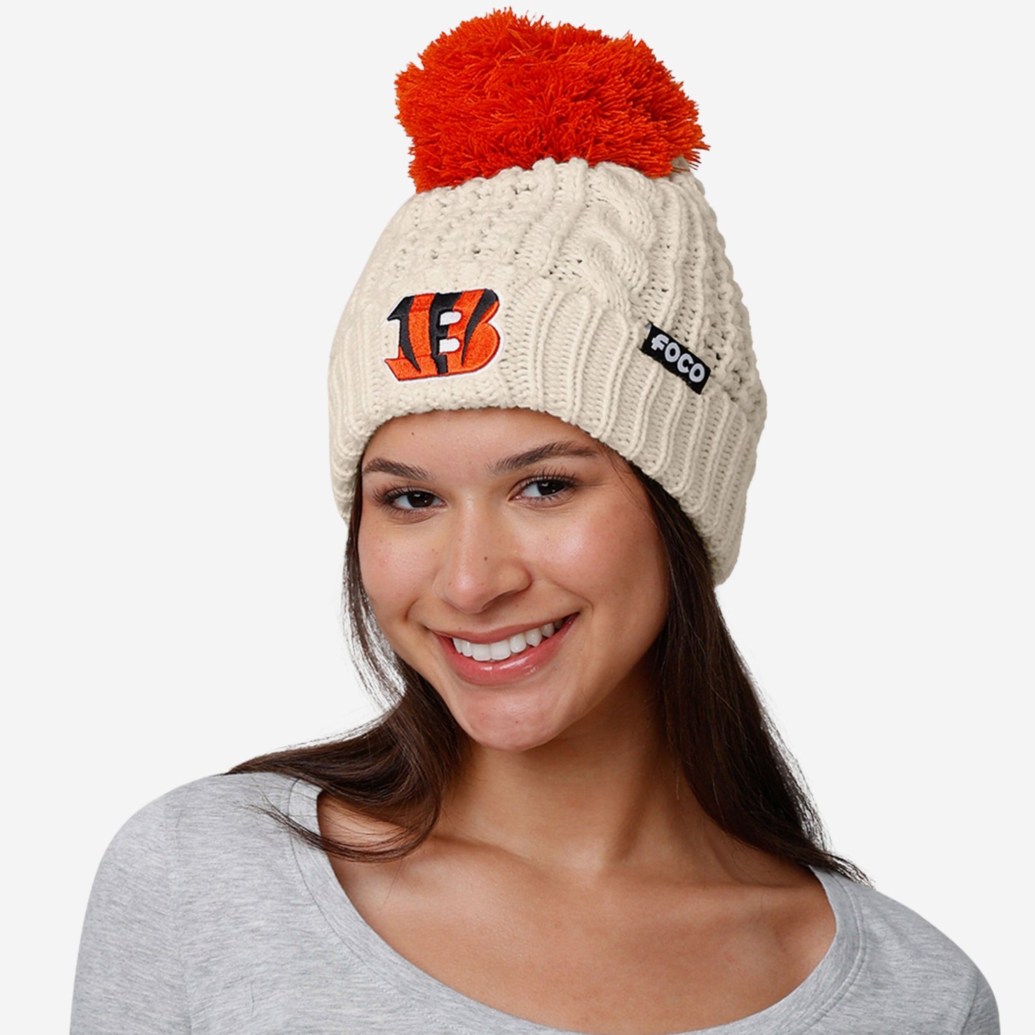 Cincinnati Bengals Womens Primary Logo White Cable Knit Pom Beanie FOCO - FOCO.com