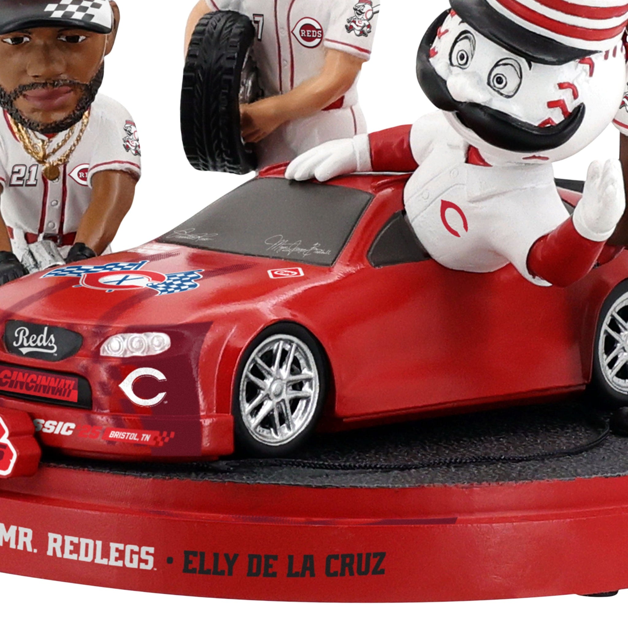 • Portrays Elly De La Cruz, Hunter Greene, Spencer Steer, and Mr. Redlegs wearing their game day uniforms, recreating a race car pit stop, ready to race their way to the top of their game