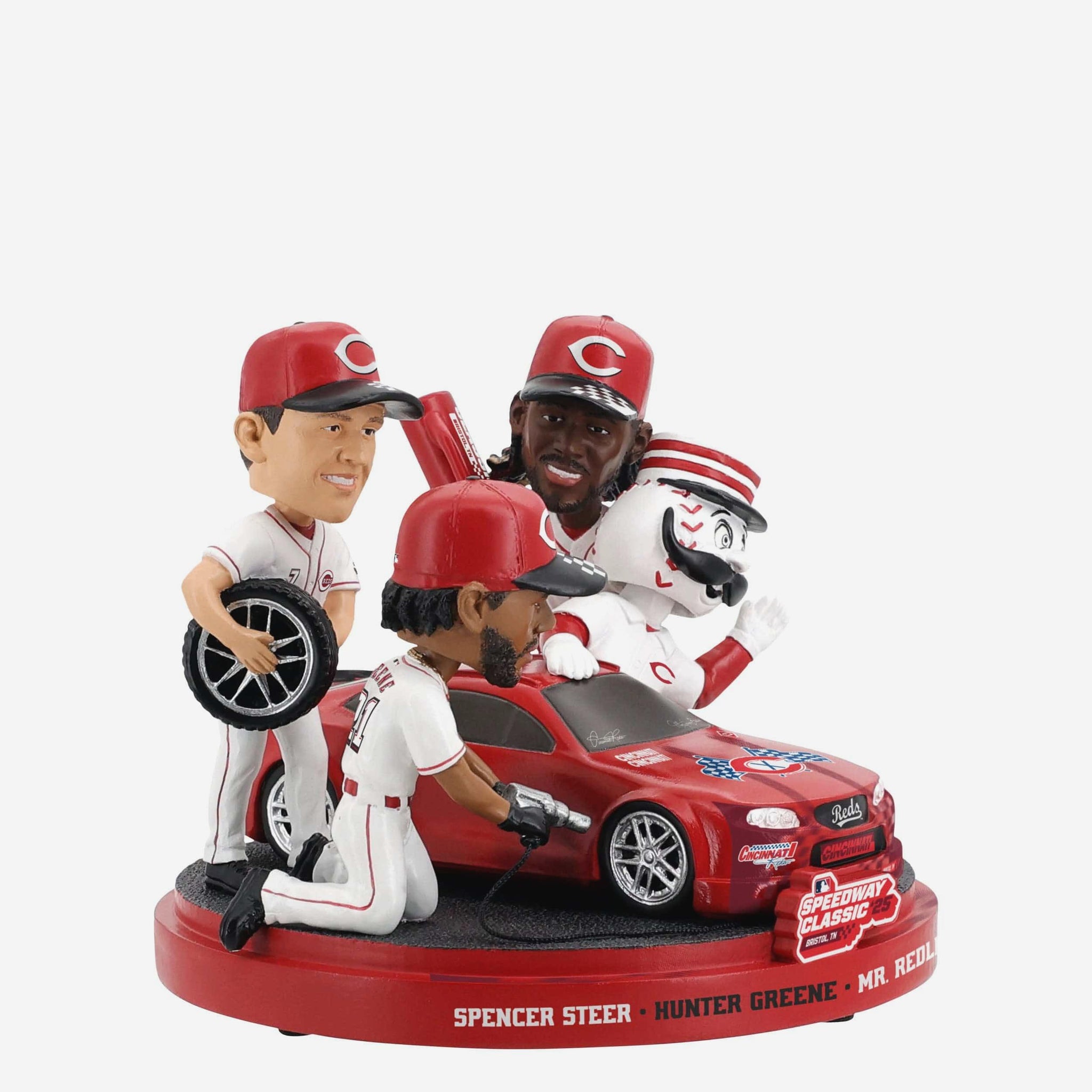 The Queen City crew! Show you ride with the Reds all the way to the finish line with this Cincinnati Reds 2025 MLB Speedway Classic Pit Crew Mini Bobblehead Scene.