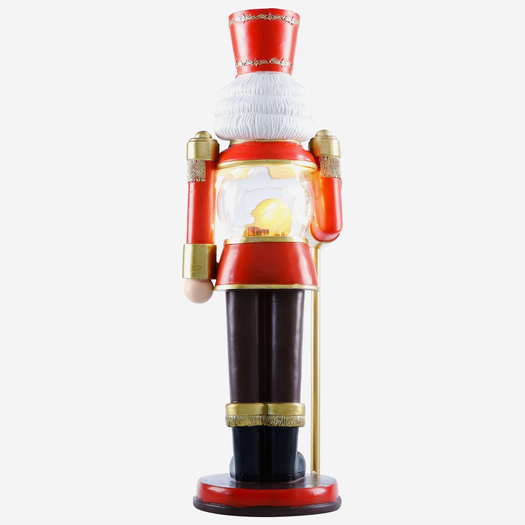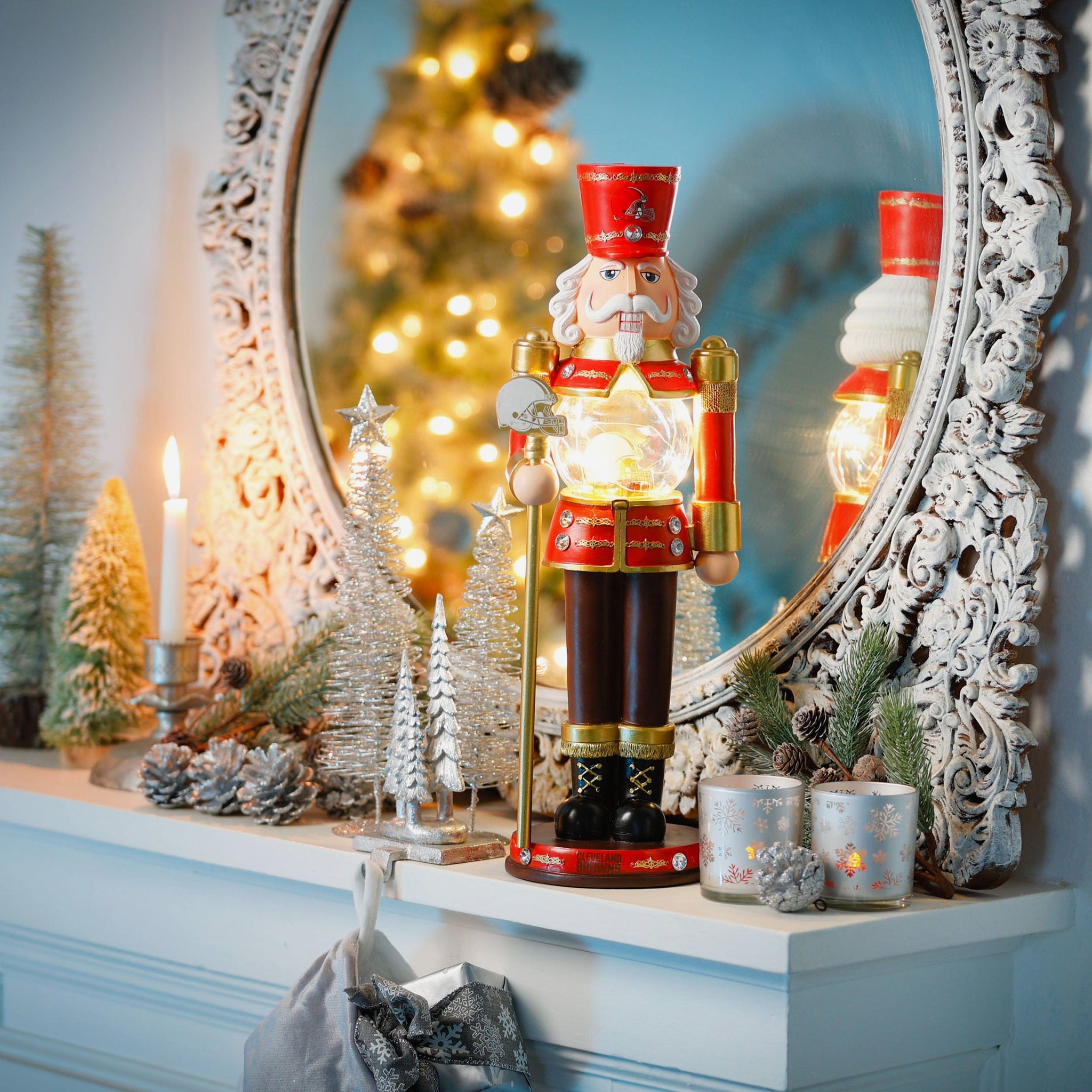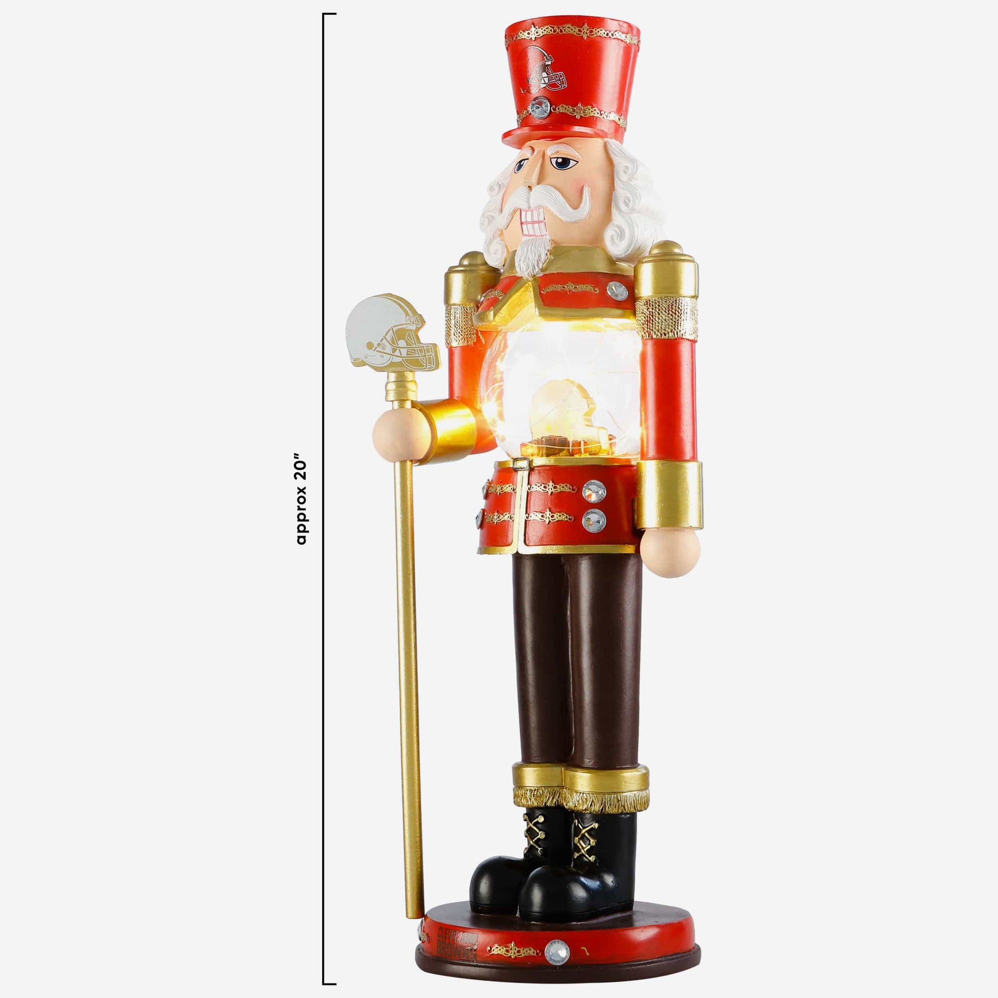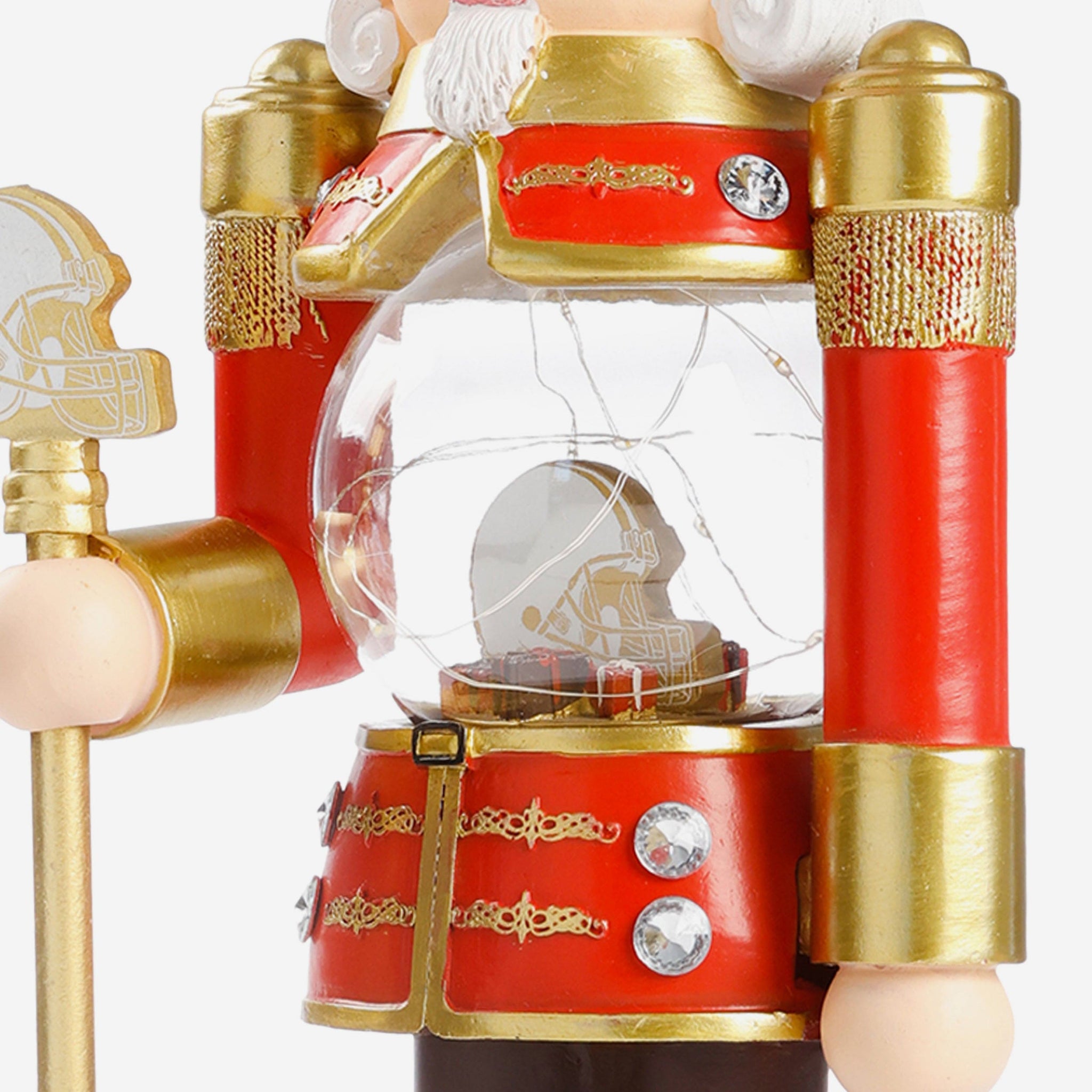 - Nutcracker's torso features clear globe with gold-colored team logo display, holiday gift accents, and light-up fairy lights for maximum holiday magic