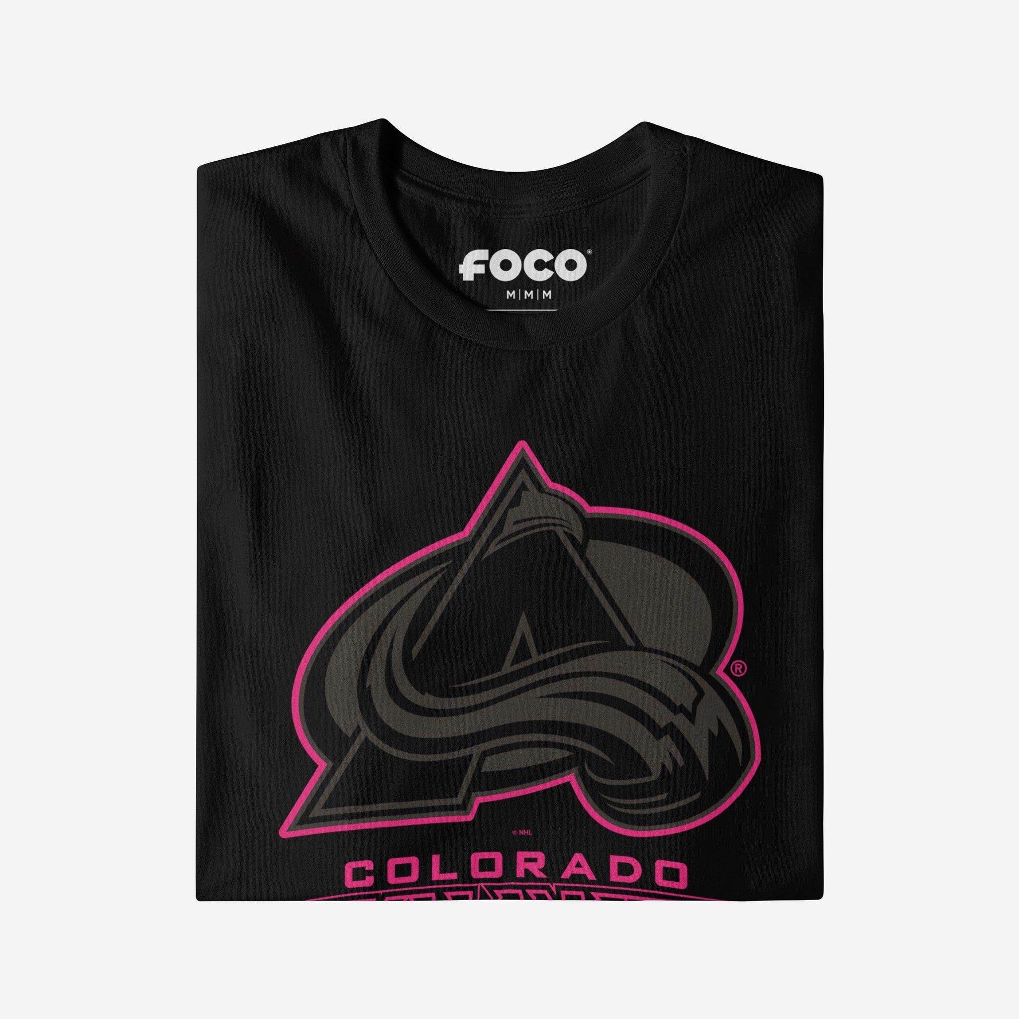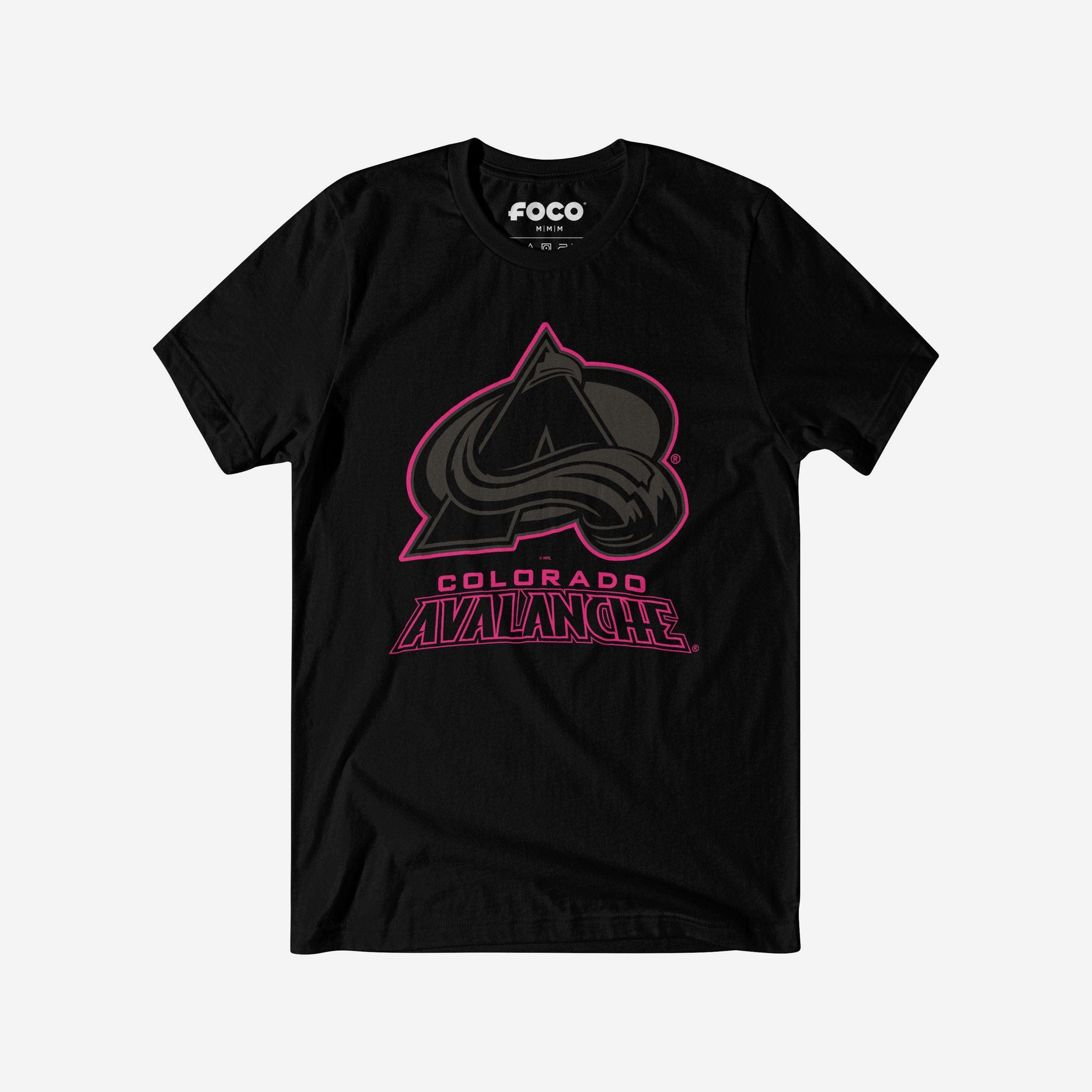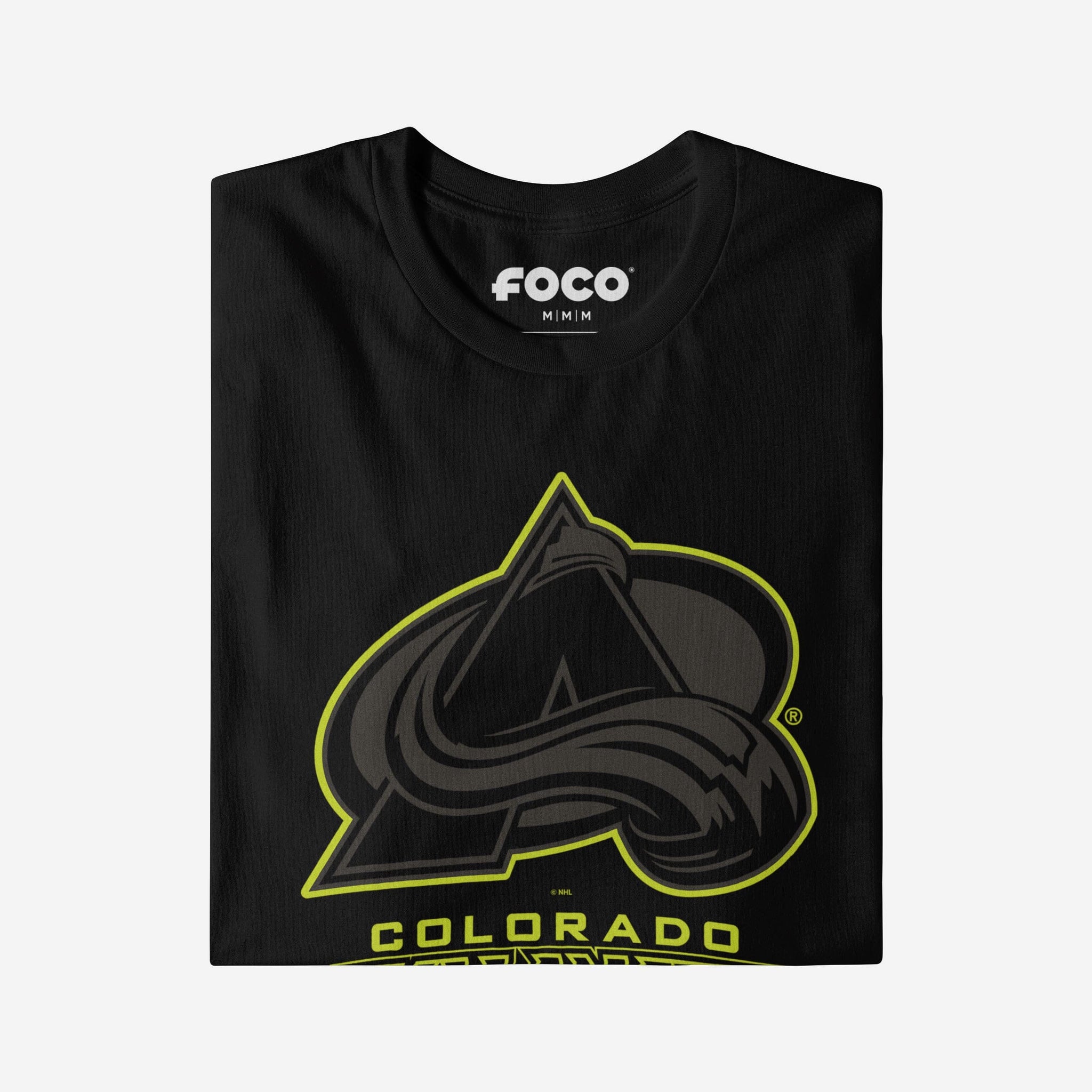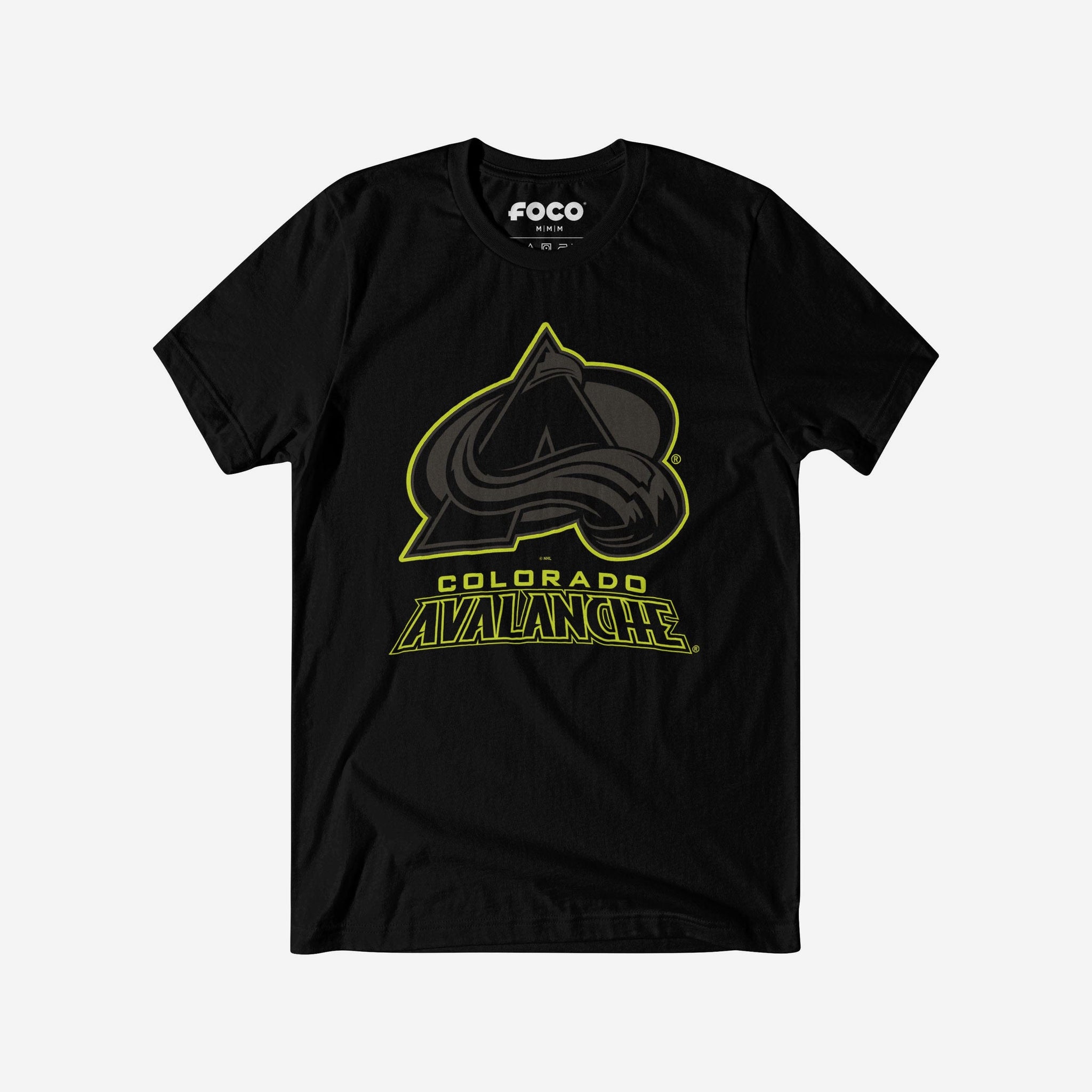 - Team logo display with highlight outline: The front of this apparel features a black Colorado Avalanche team logo display outlined in neon, and a neon wordmark team name display