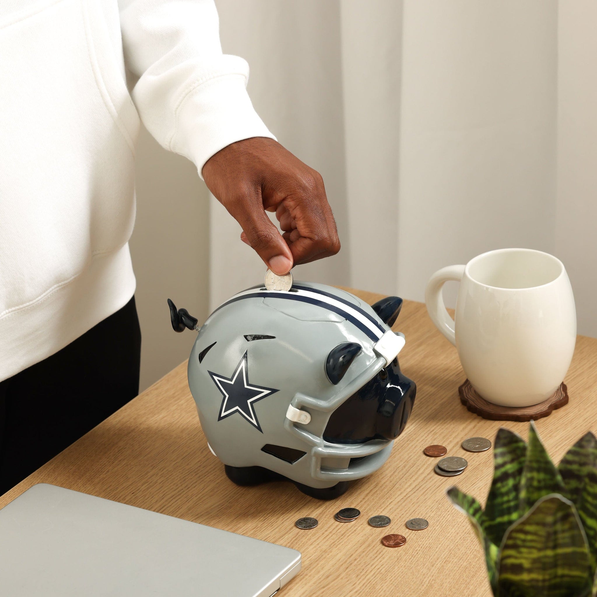 This piggy doesn't just carry the team spirit - This pig carries your change, too. Don't get what we're saying? It'll make "cents" when you've got this Dallas Cowboys Helmet Piggy Bank in your collection.