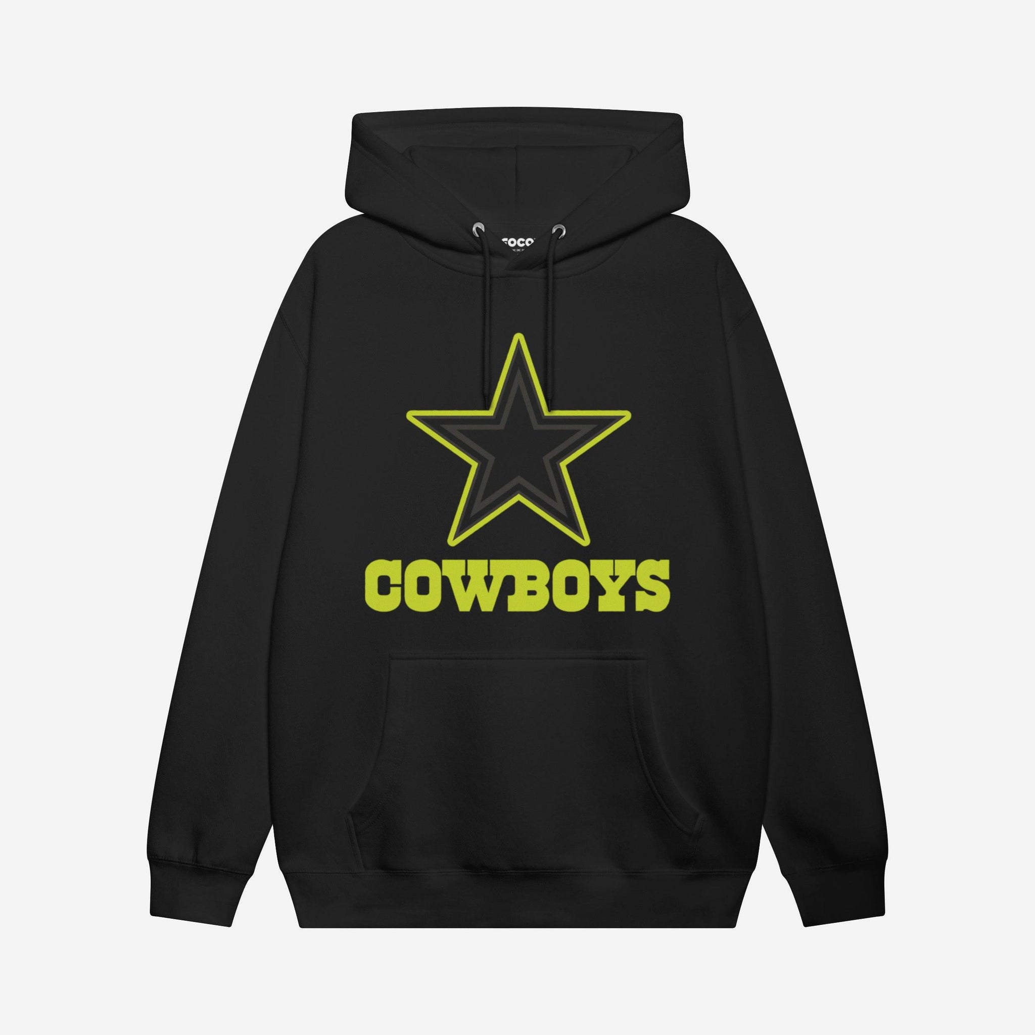 • Team logo display with highlight outline: The front of this apparel features a black Dallas Cowboys team logo display outlined in neon, and a neon team name display