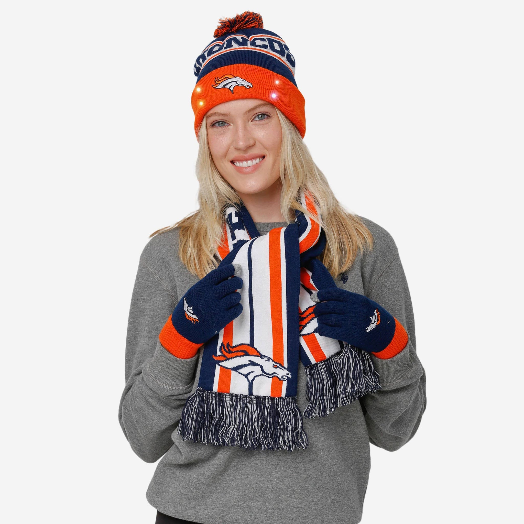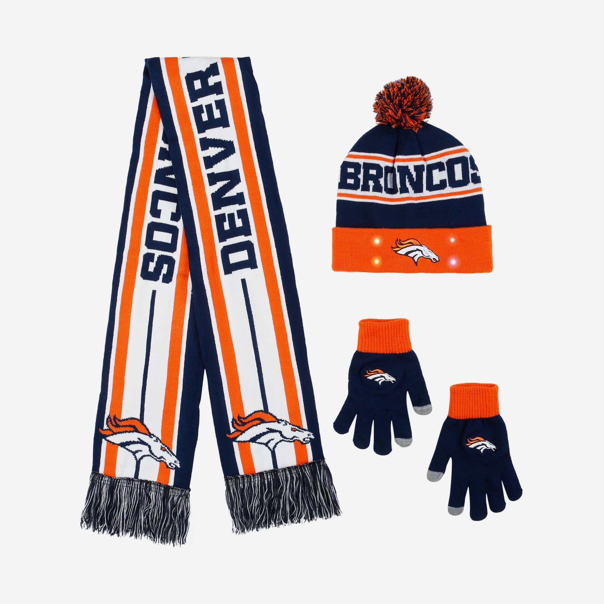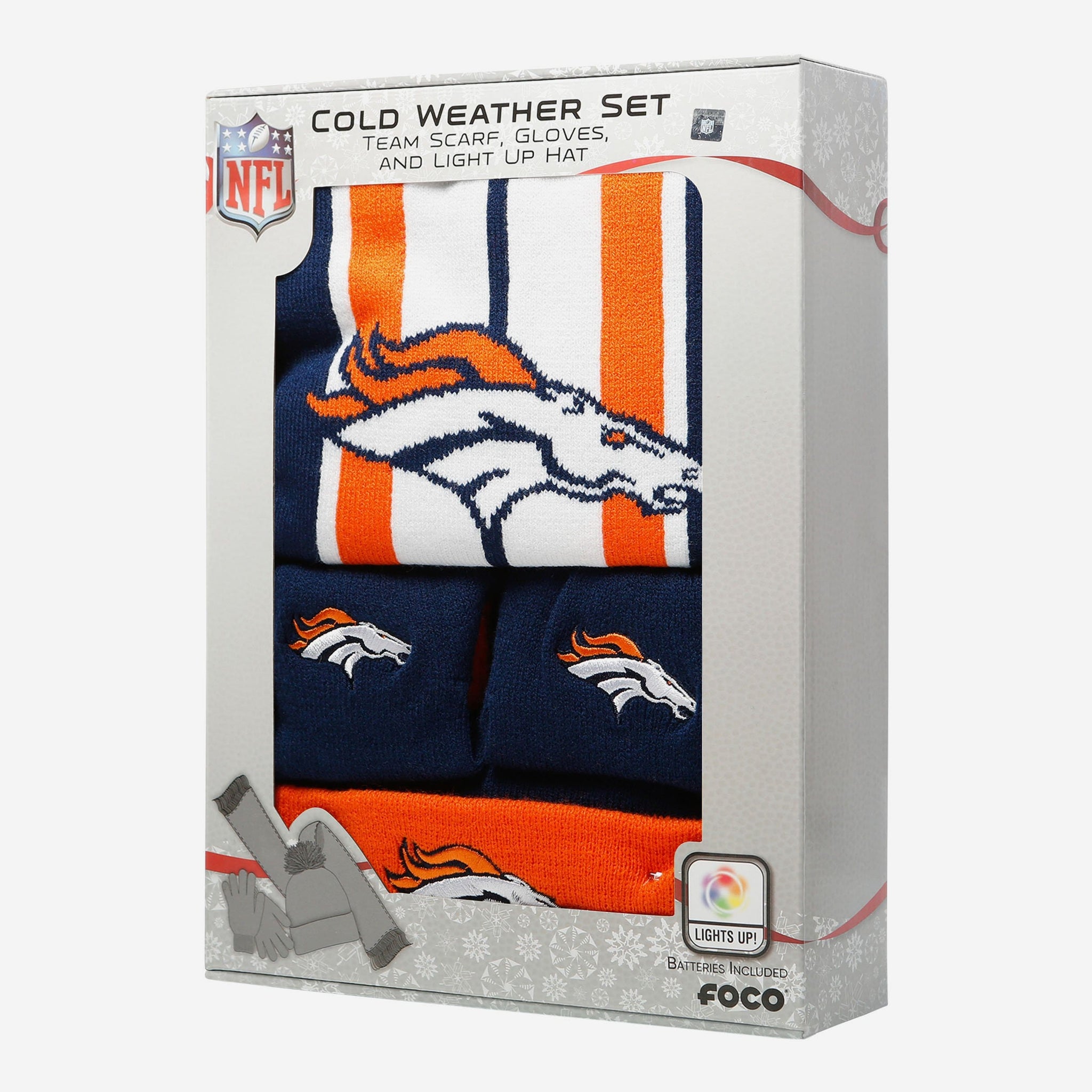 Scarf? Check. Gloves? Check. Light up beanie? You guessed it - Check. Show the snow who's boss with this Denver Broncos Snow Stealer Cold Weather Set!
