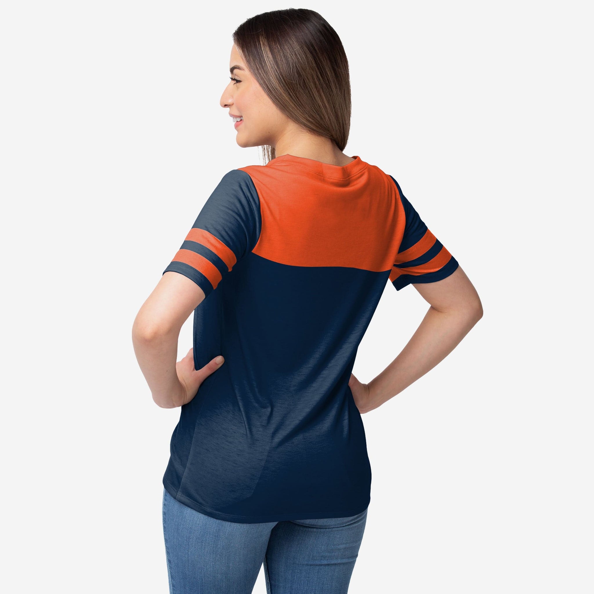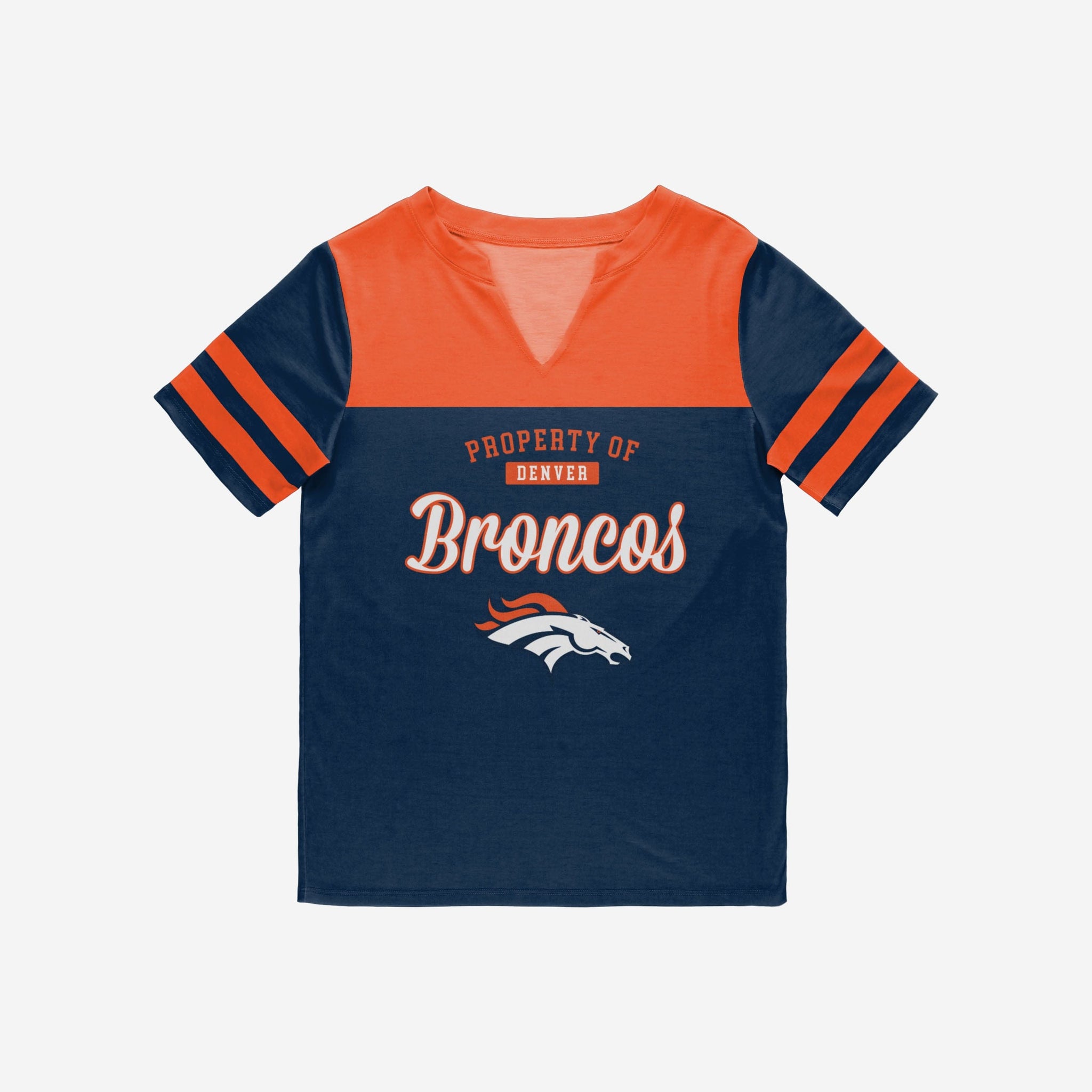 Ready. Set. Gameday! Dress to impress when you're chilling at the tailgate or cheering in the stadium with this Denver Broncos Women's Team Stripe Property Of V-Neck Shirt.