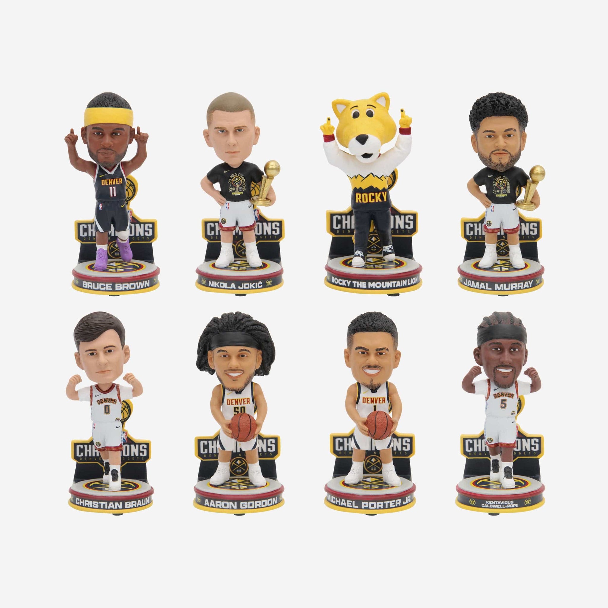 - Set includes Nikola Jokic and Jamal Murray wearing championship t-shirts, Aaron Gordon and Michael Porter Jr. wearing their white gameday uniforms, Christian Braun and Kentavious Caldwell-Pope wearing their City Edition gameday uniforms, and Bruce Brown and SuperMascot Rocky wearing their dark blue gameday uniforms so you can immortalize the championship with all your favorite stars