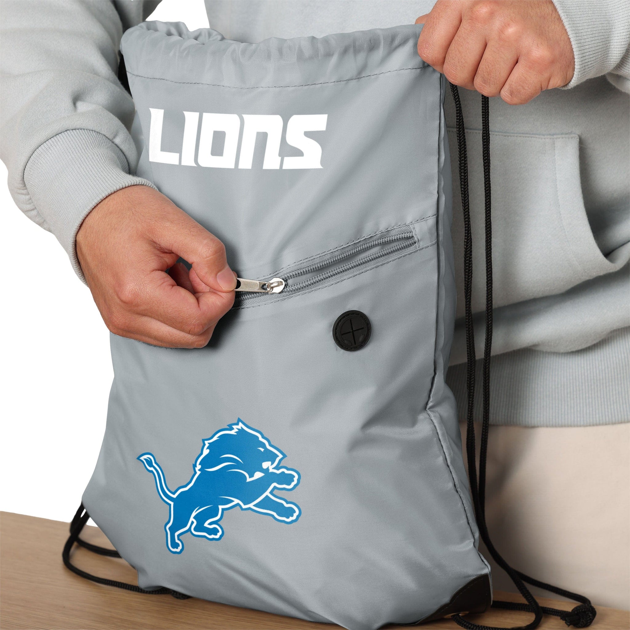 Lightweight, bold, and full of fandom. Get ready to show off your favorite franchise on any adventure with this Detroit Lions Pocket Drawstring Backpack.