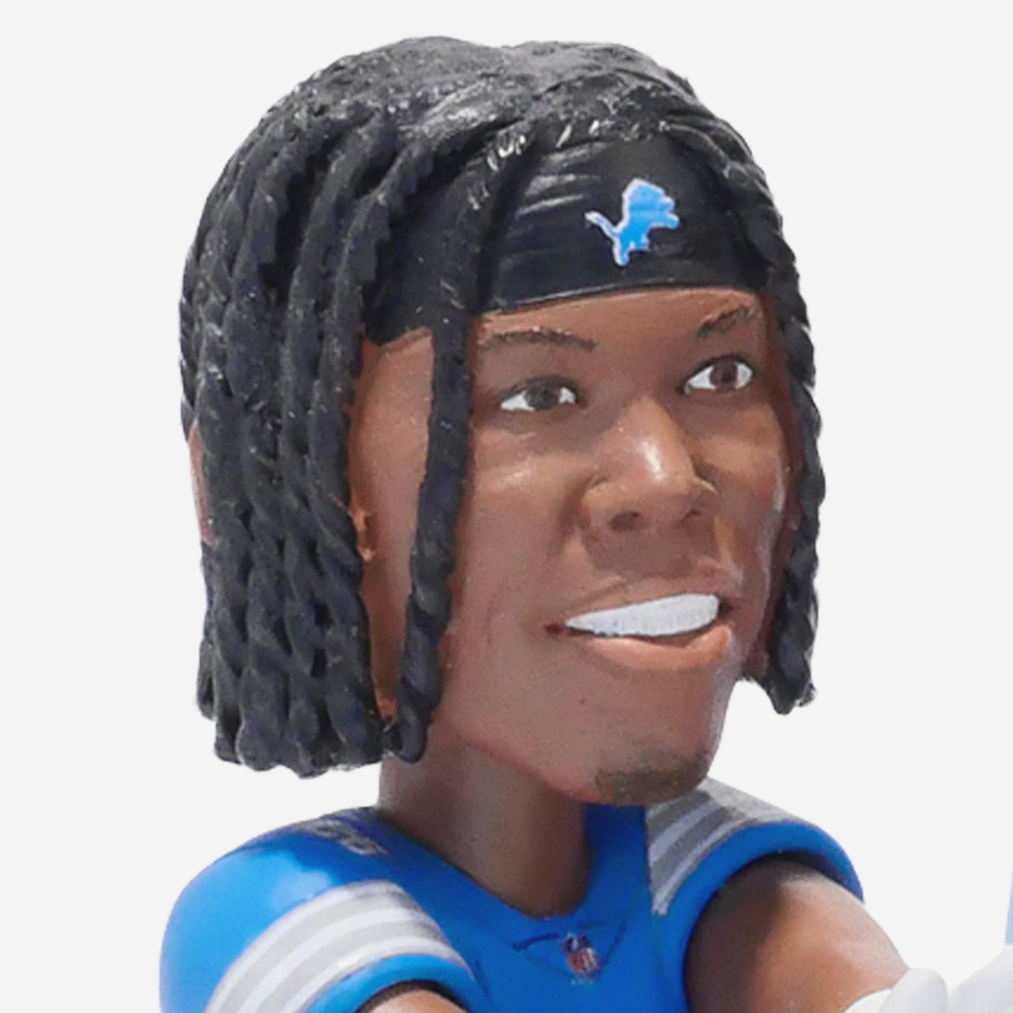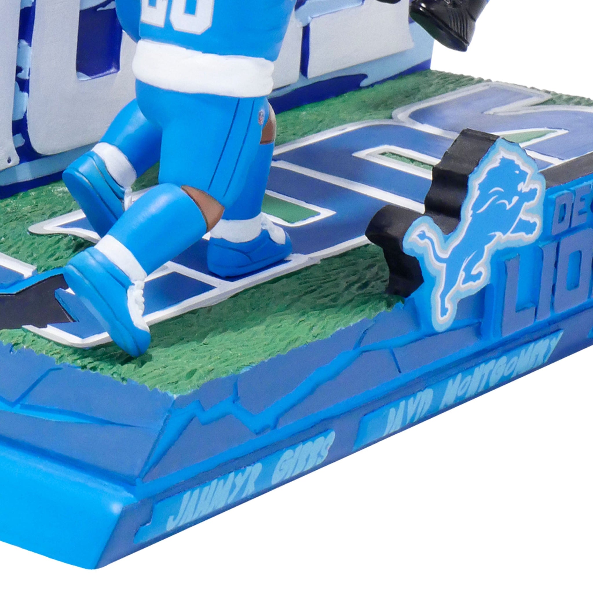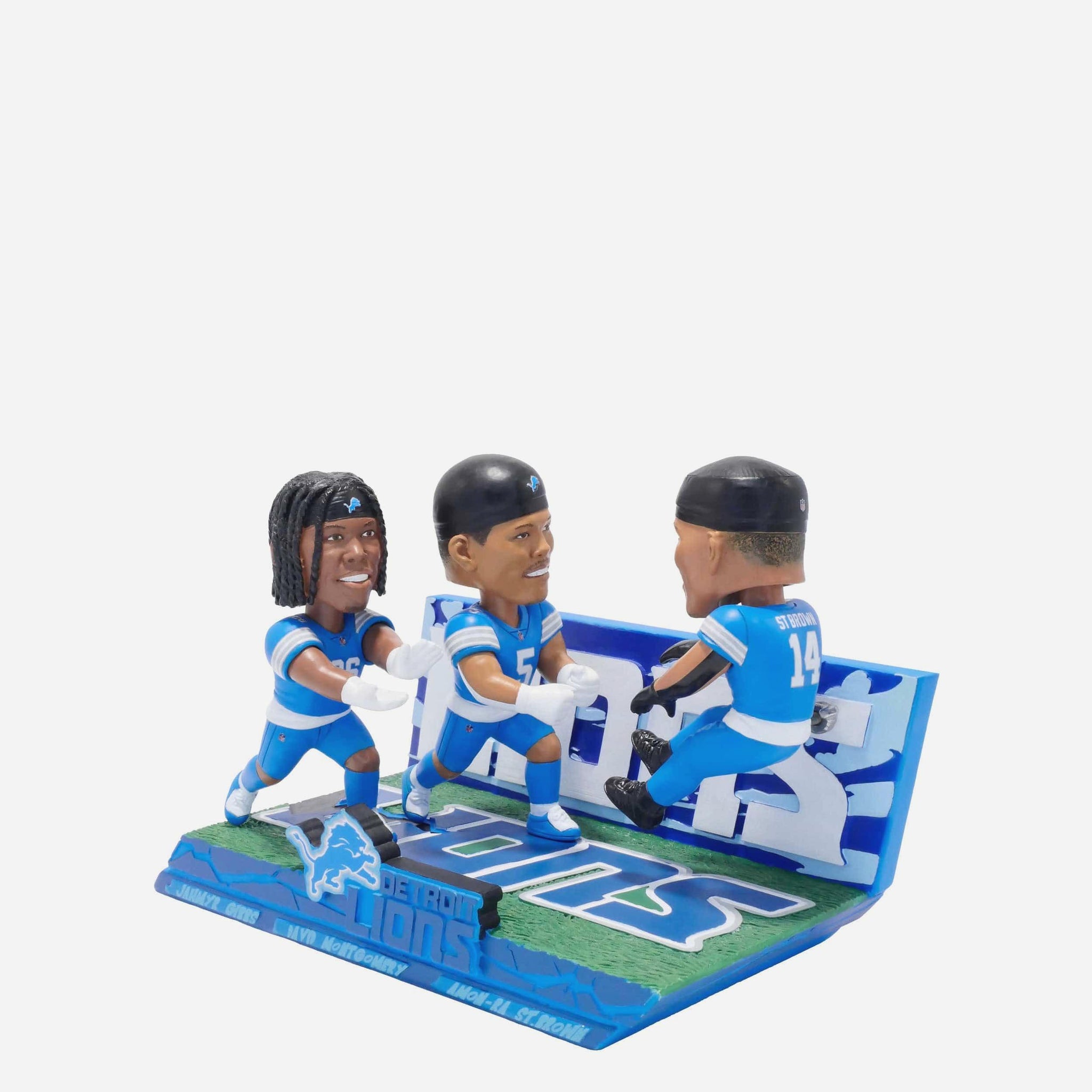 • Portrays Jahmyr Gibbs, David Montgomery, and Amon-Ra St. Brown wearing their blue gameday uniforms in action poses, ready to properly celebrate