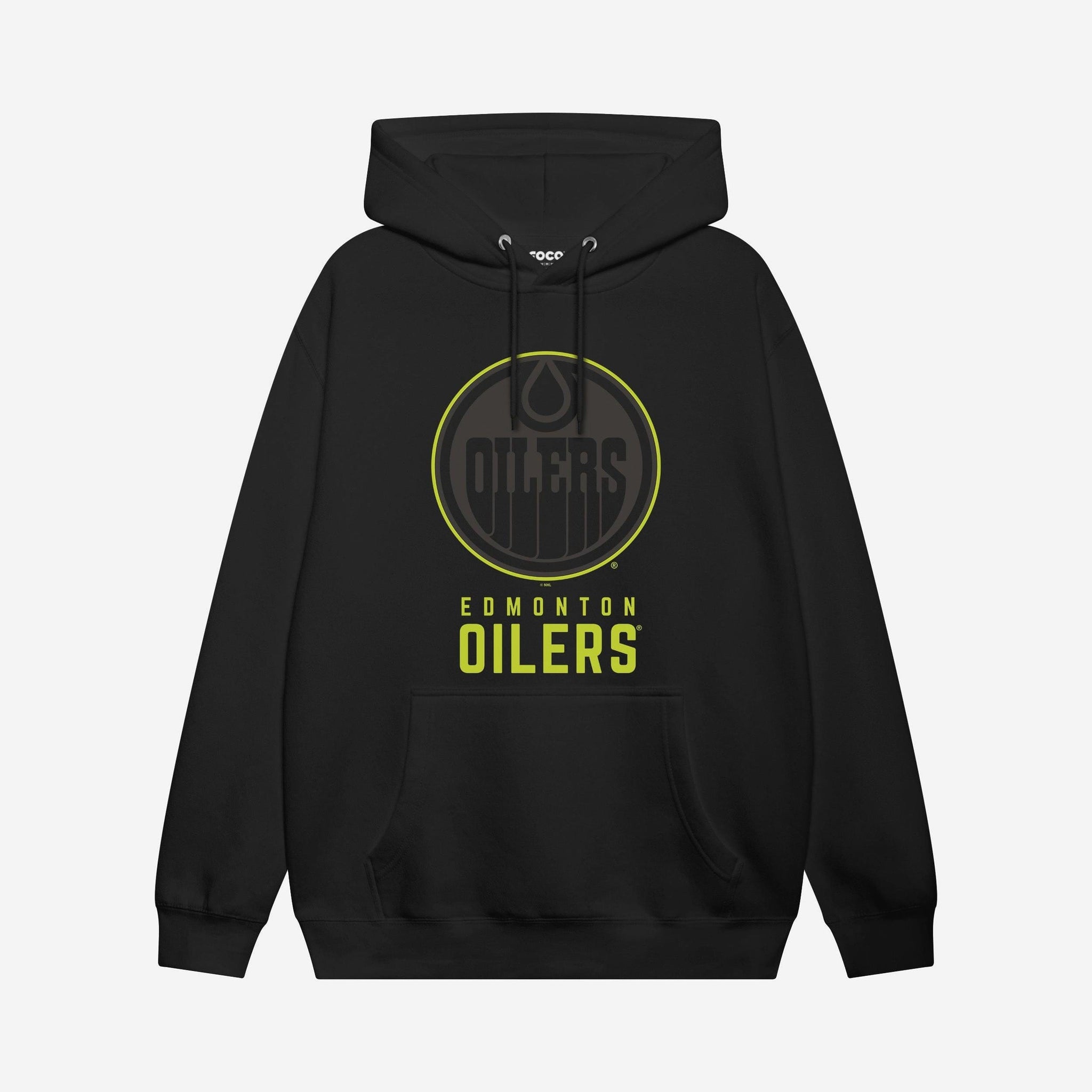 - Team logo display with highlight outline: The front of this apparel features a black Edmonton Oilers team logo display outlined in neon, and a neon team name display
