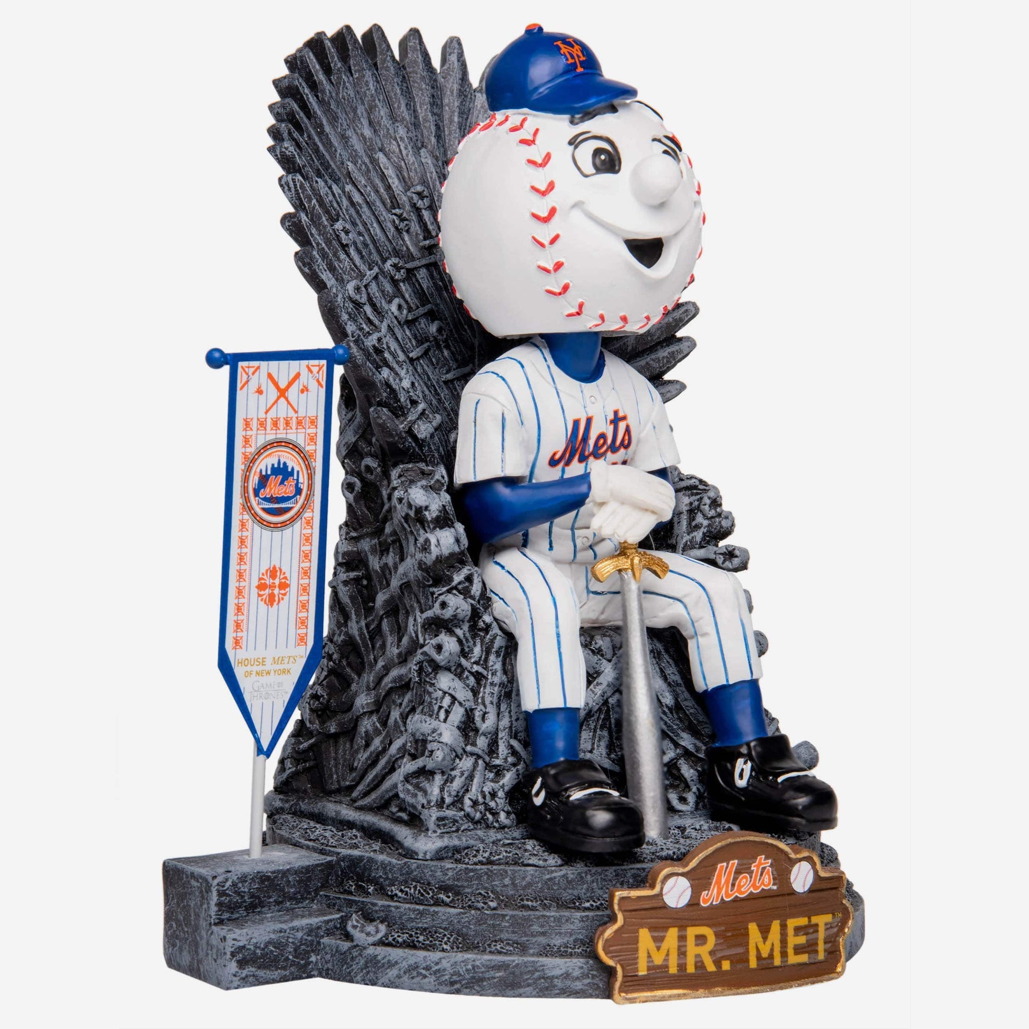 You know you're a legendary fan. We know you're a legendary fan. But does everyone else know? If not, they will when you show them this Mr. Met New York Mets Game of Thrones Mascot Bobblehead. Everyone will be bending the knee for your fandom.