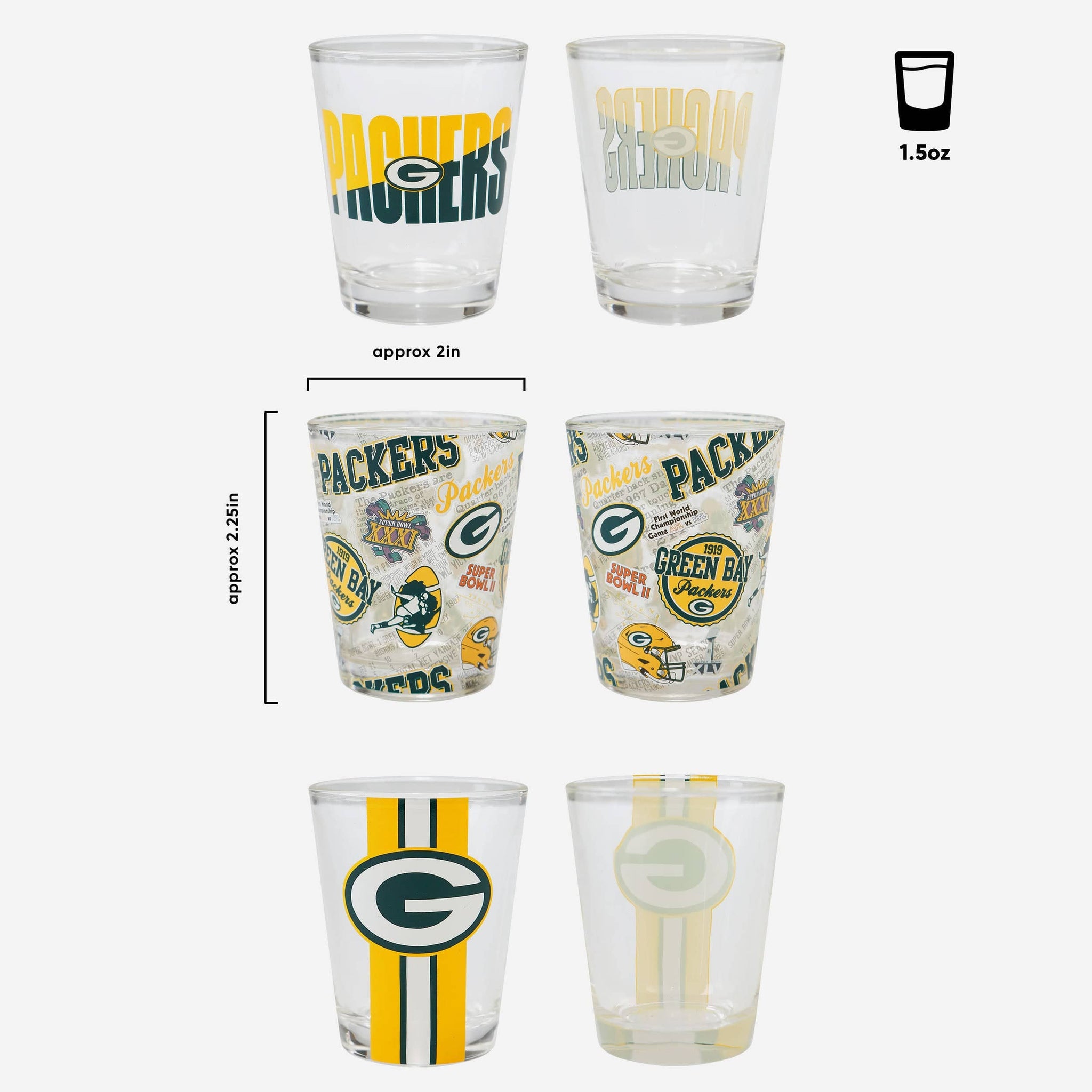 - Third glass features all-over repeat design with team logo displays and thematic team-specific elements throughout that will really get the party started