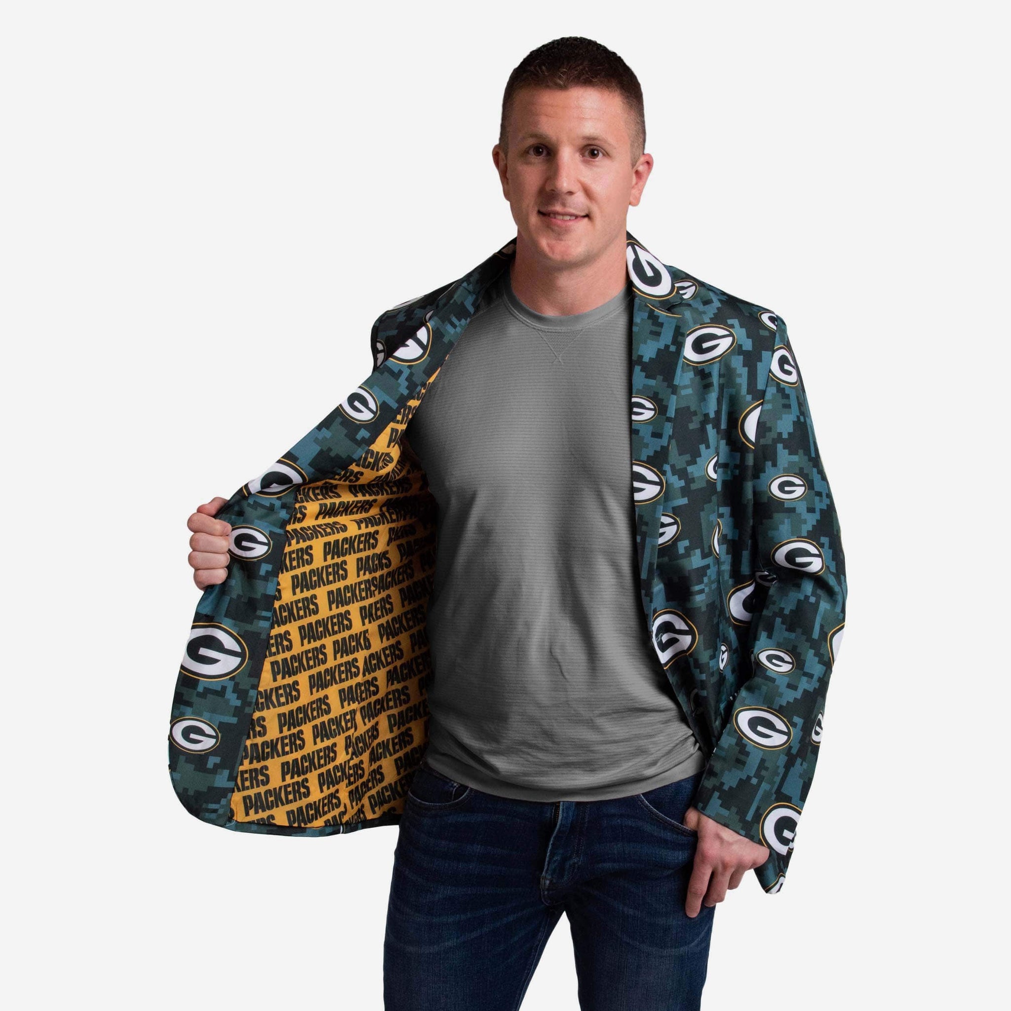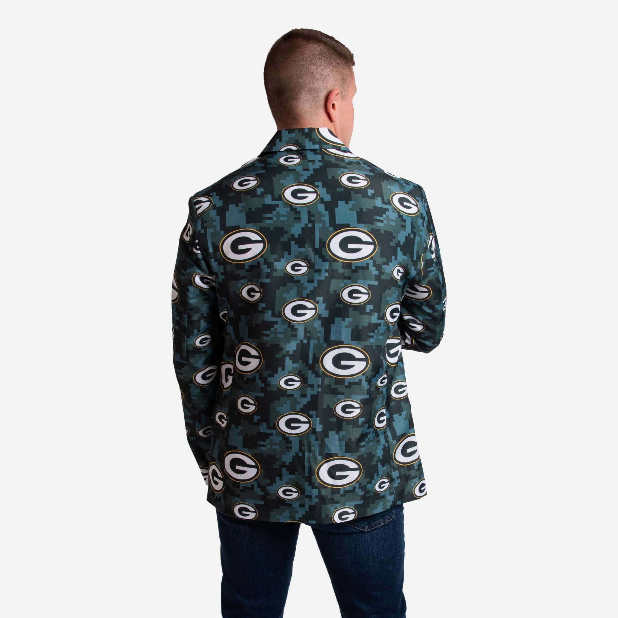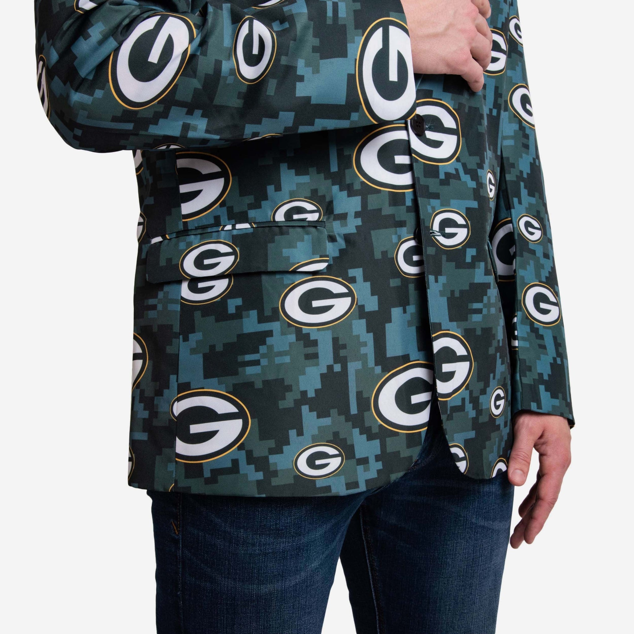 This Green Bay Packers Digital Camo Suit Jacket may feature a team-colored camouflage design, but we promise it won't hide your legendary fandom. Nothing can hide that kind of bold team spirit.