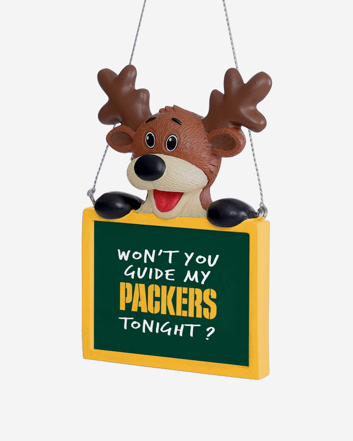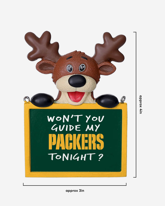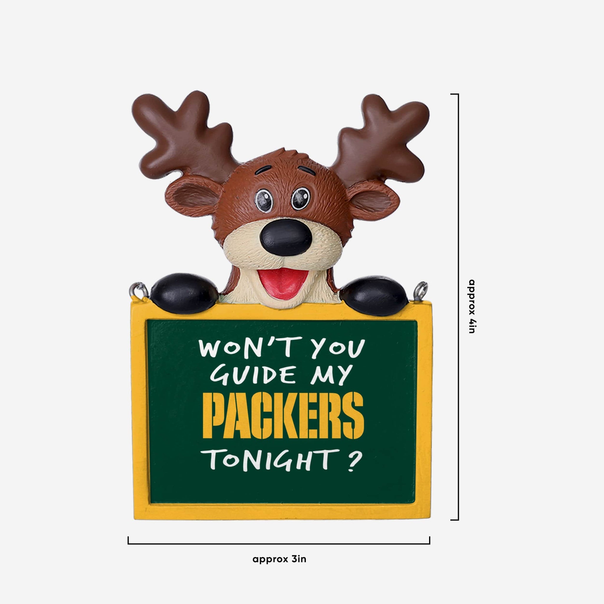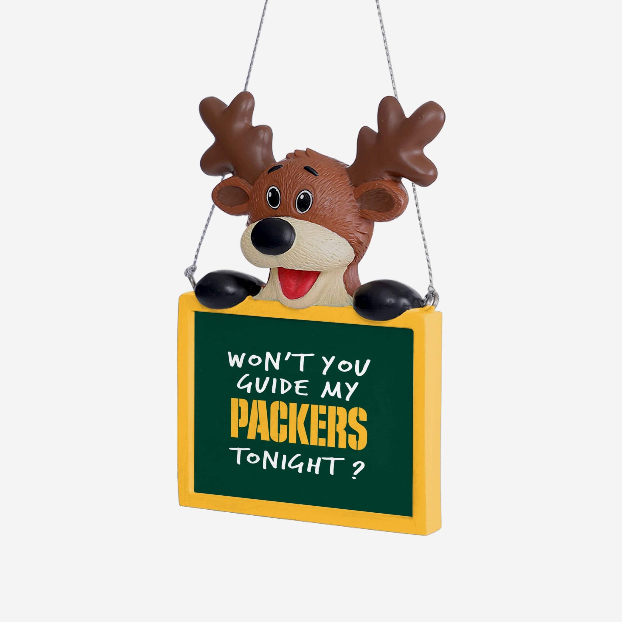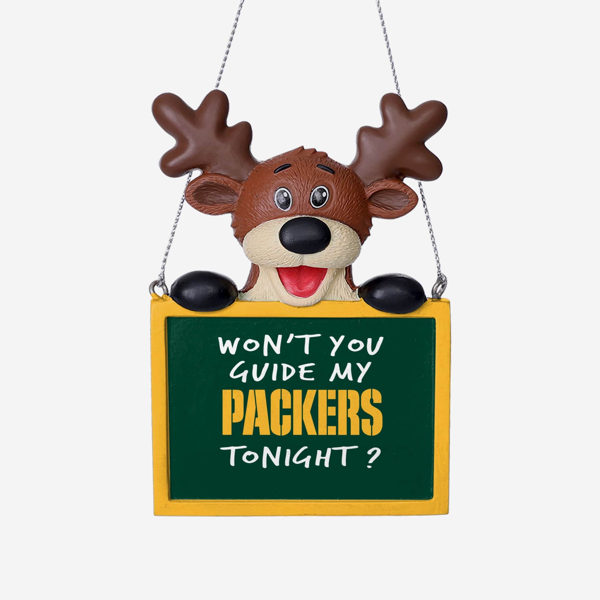 Tired: Dasher. Dancer. Prancer. Vixen. Wired: This Green Bay Packers Reindeer with Sign Ornament.