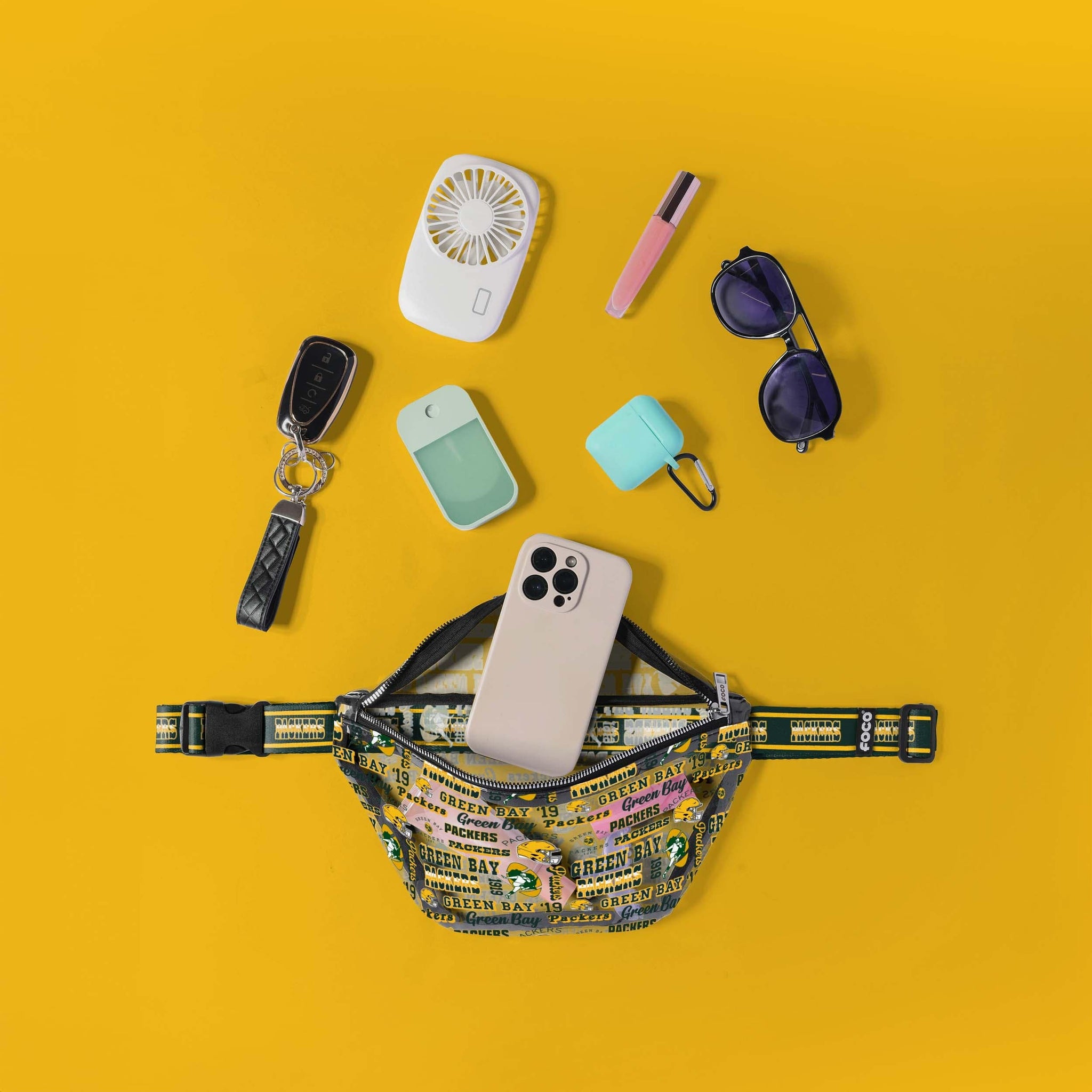 • Repeat Green Bay Packers current and retro team logo and wordmark displays on the fanny pack, in case there were any doubts where your allegiances lie