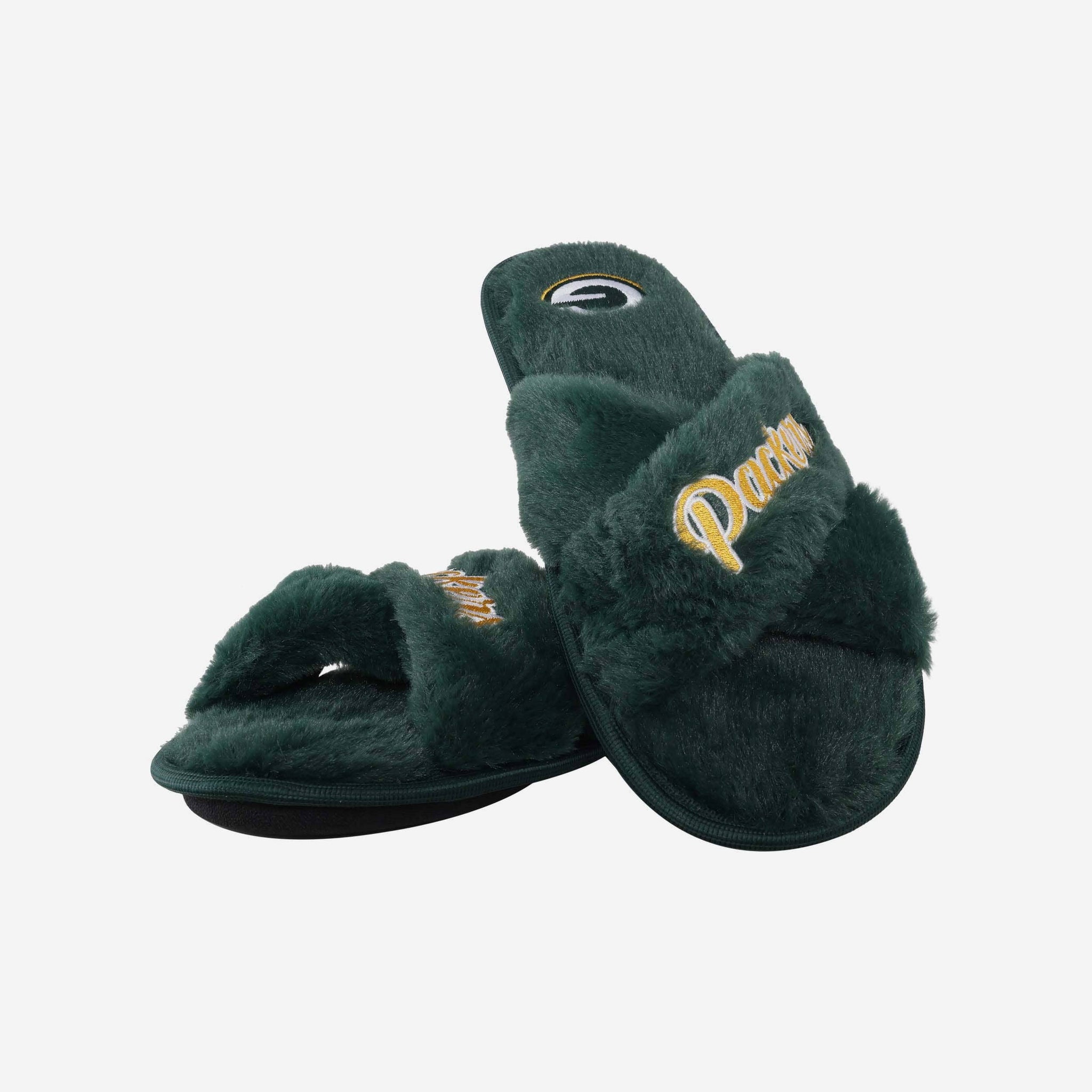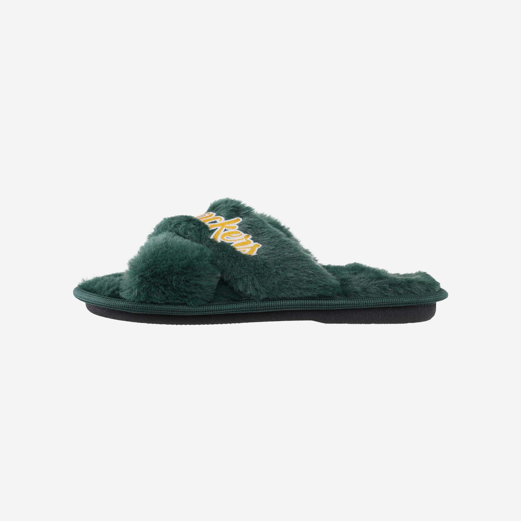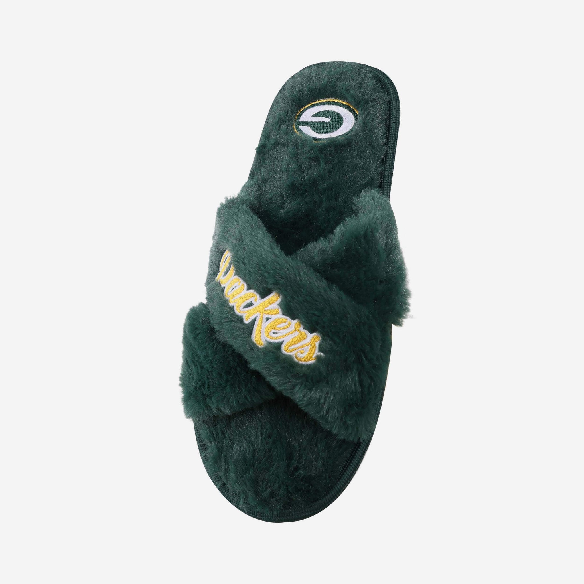 Slip in to something fuzzy, festive, and oh, so fan-tastic on your relaxing days at home. These Green Bay Packers Women's Script Wordmark Fur Cross Slides are the best way to rep the team while you kick back and watch the game on TV.