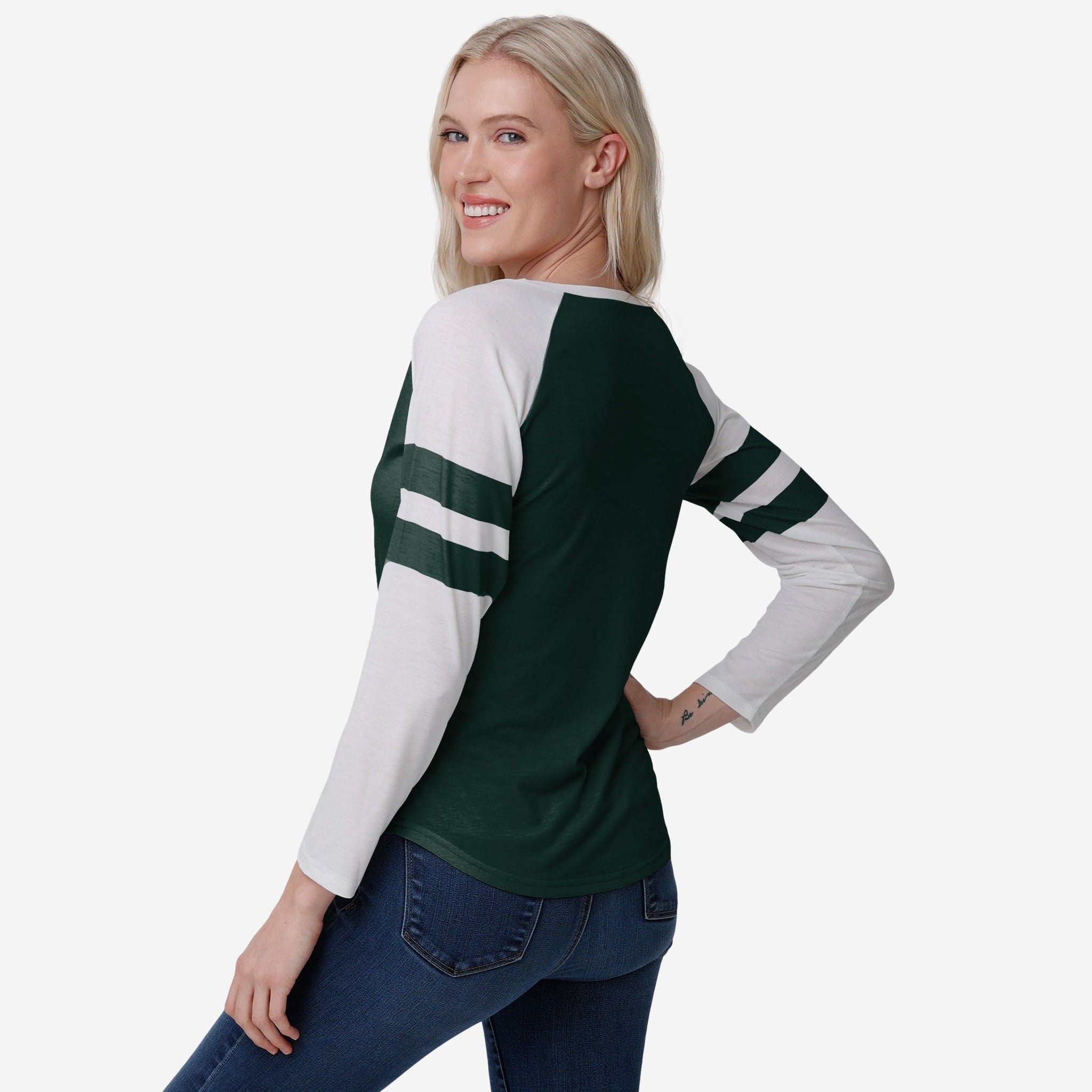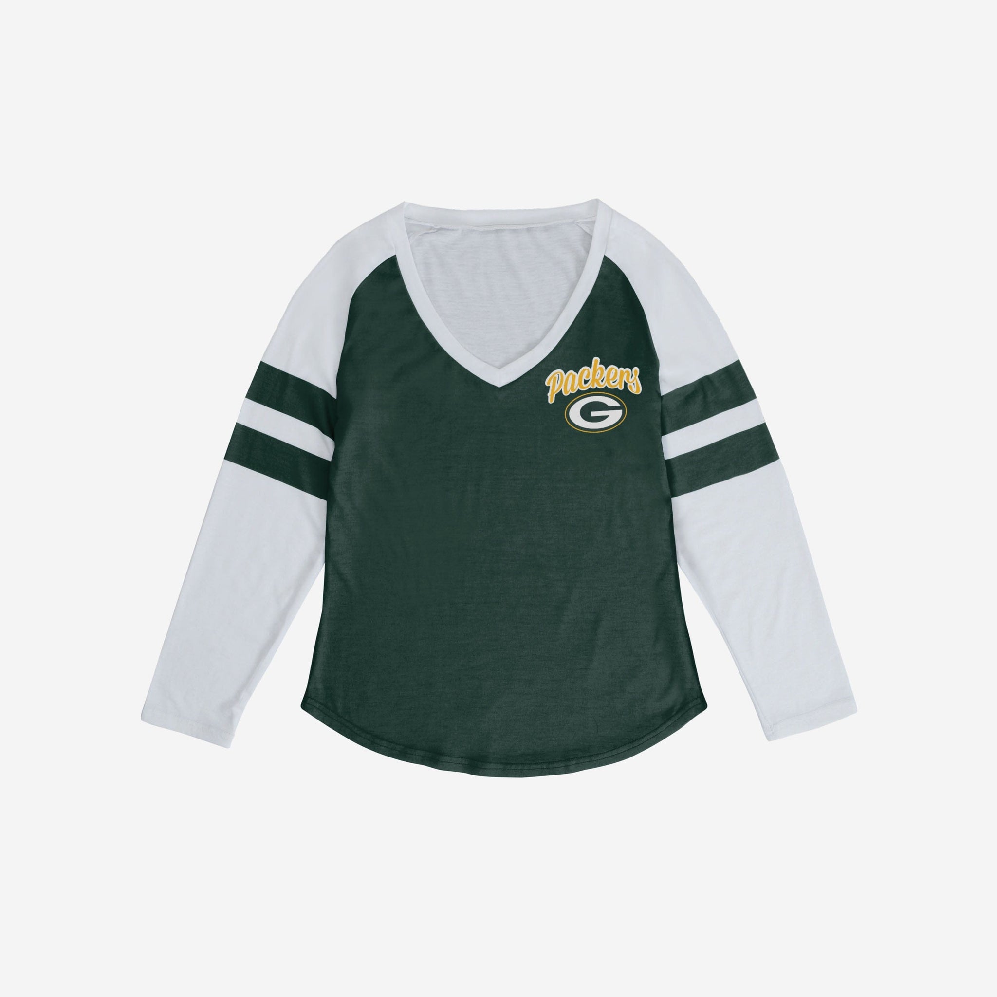 Green Bay Packers Womens Script Wordmark Striped Sleeve Raglan T-Shirt FOCO S - FOCO.com