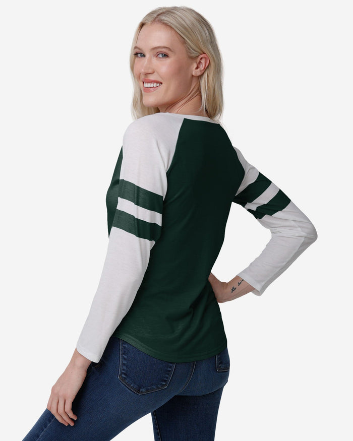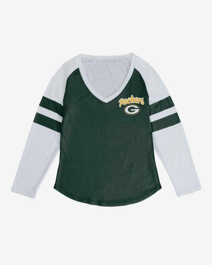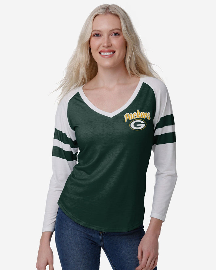 Green Bay Packers Womens Script Wordmark Striped Sleeve Raglan T-Shirt