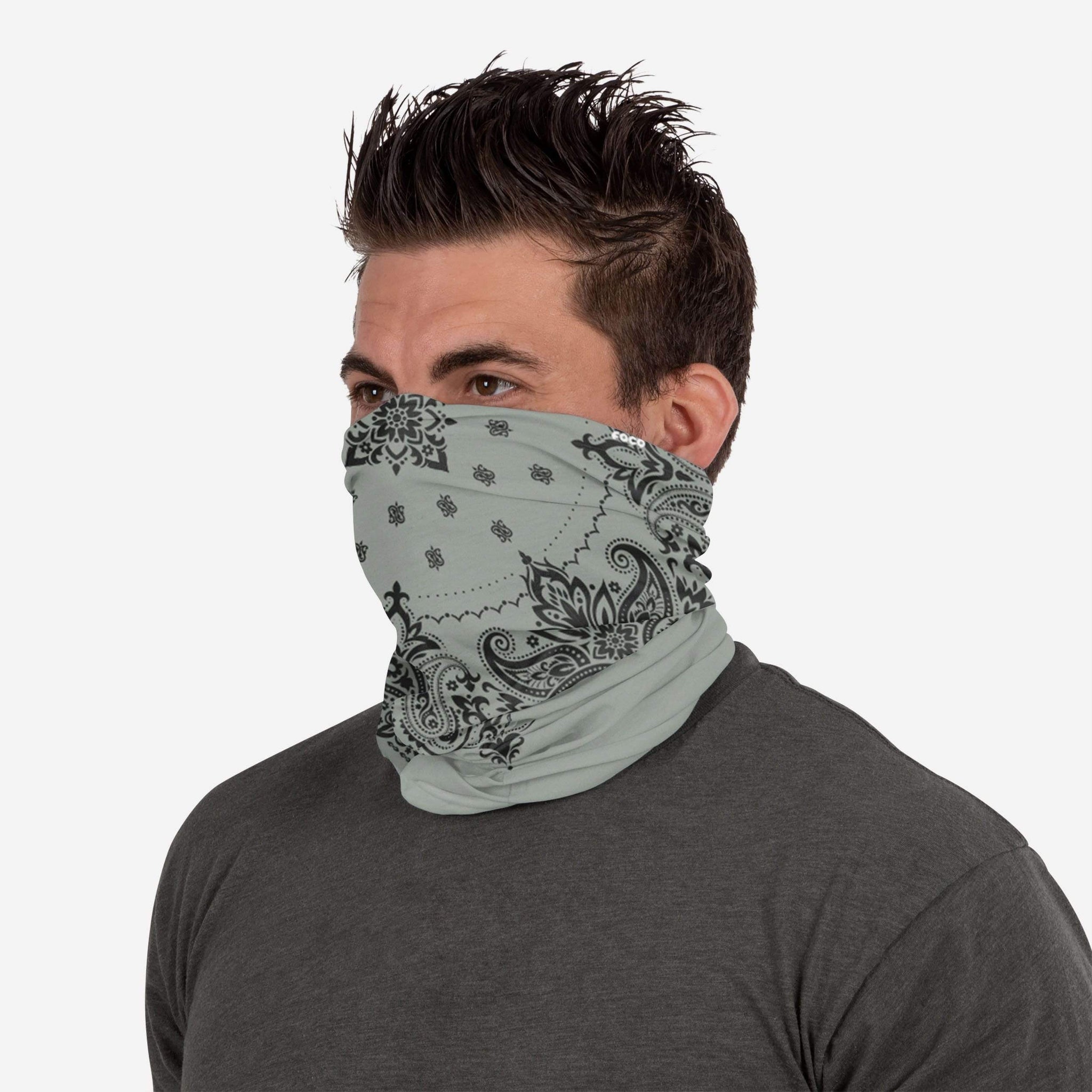 This Grey and Black Bandana Printed Gaiter Scarf will keep your neck covered with lightweight, breathable material and help you cover up in style whenever you put it on!