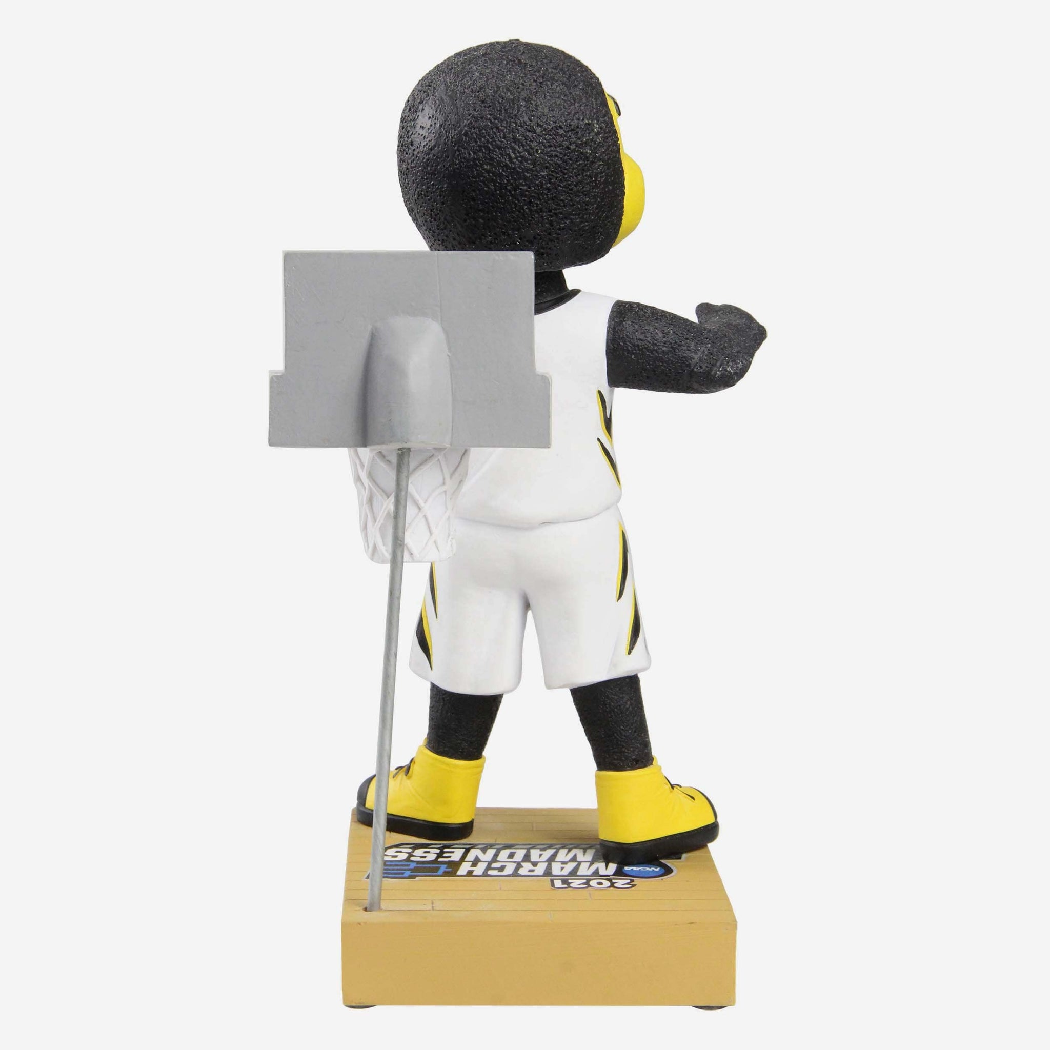 - Portrays mascot posing in front of a miniature basketball hoop, ready to ring in the madness