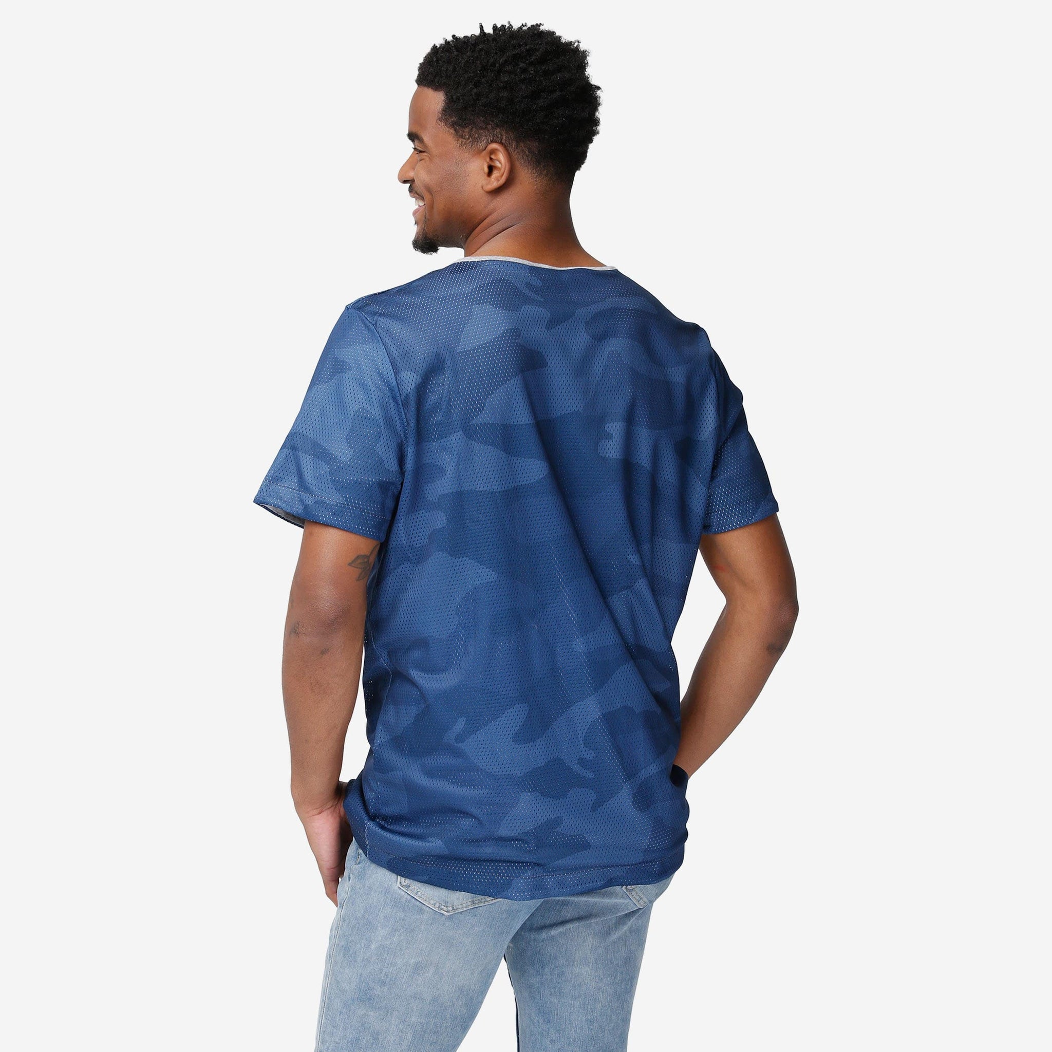 - Side two features team-colored camo mesh design with team logo display on left chest for even more gameday goodness