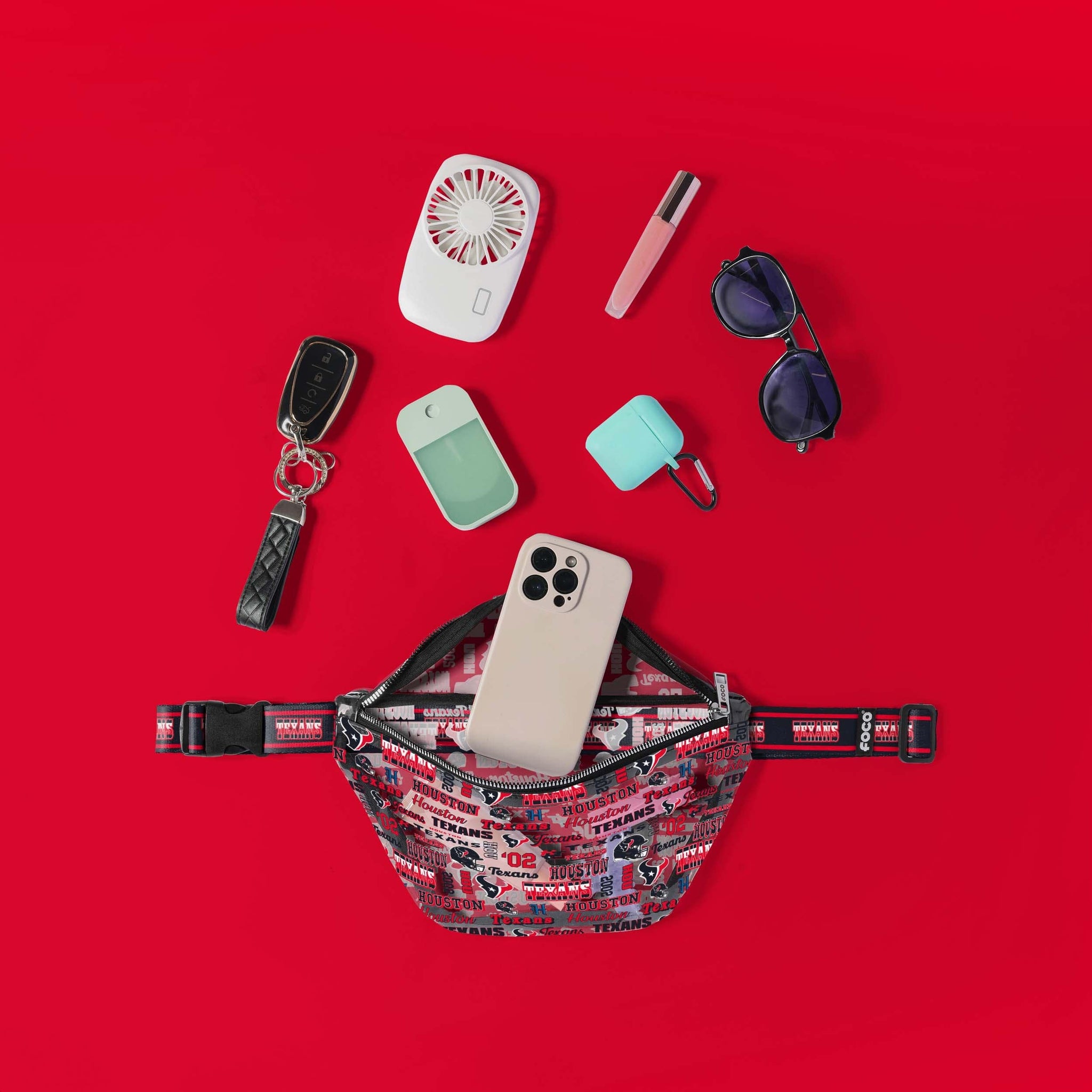 - Repeat Houston Texans current and retro team logo and wordmark displays on the fanny pack, in case there were any doubts where your allegiances lie