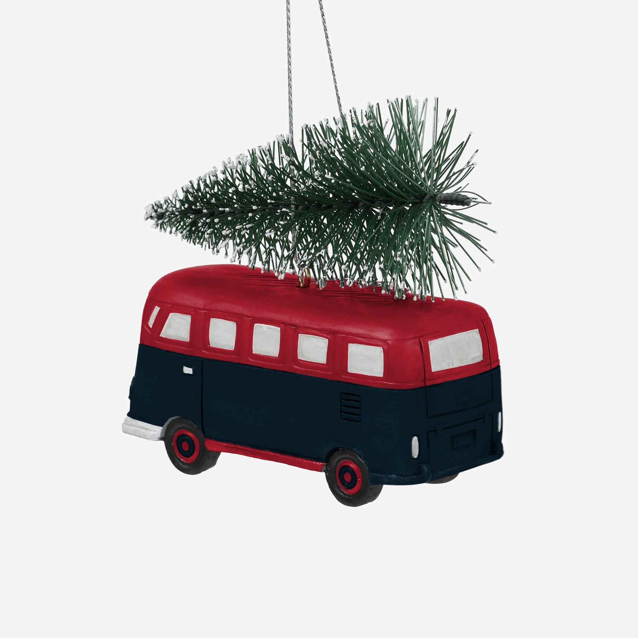 • Team-colored retro bus with Christmas tree and wreath accents to get you in the holiday spirit
