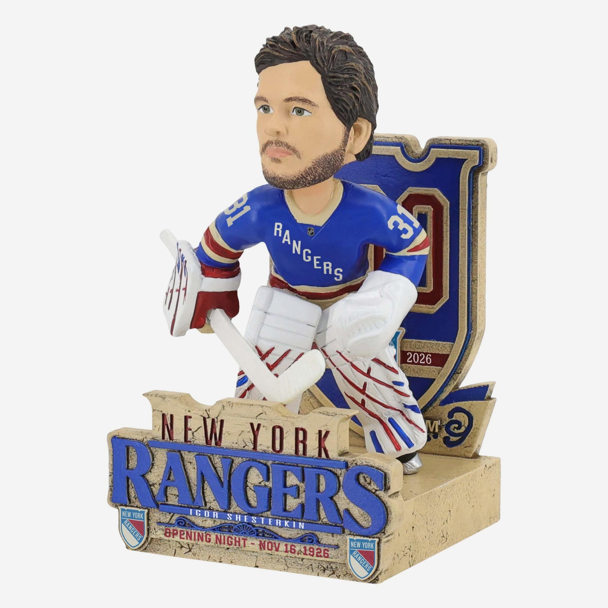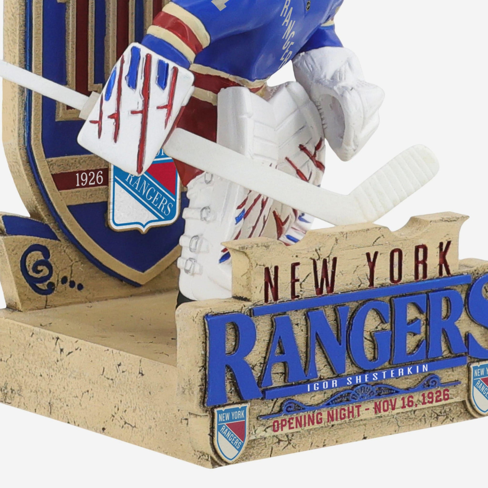 Stand tall in the blue paint! Celebrate a century of Blueshirts on the ice with this Igor Shesterkin New York Rangers Centennial Bobblehead.