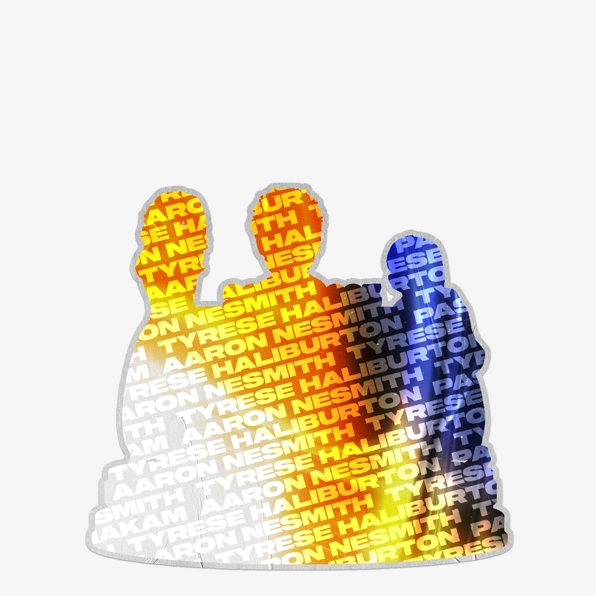 - Portrays Tyrese Haliburton, Aaron Nesmith, and Pascal Siakam wearing their yellow gameday uniforms in action poses, ready to make the plays of the game