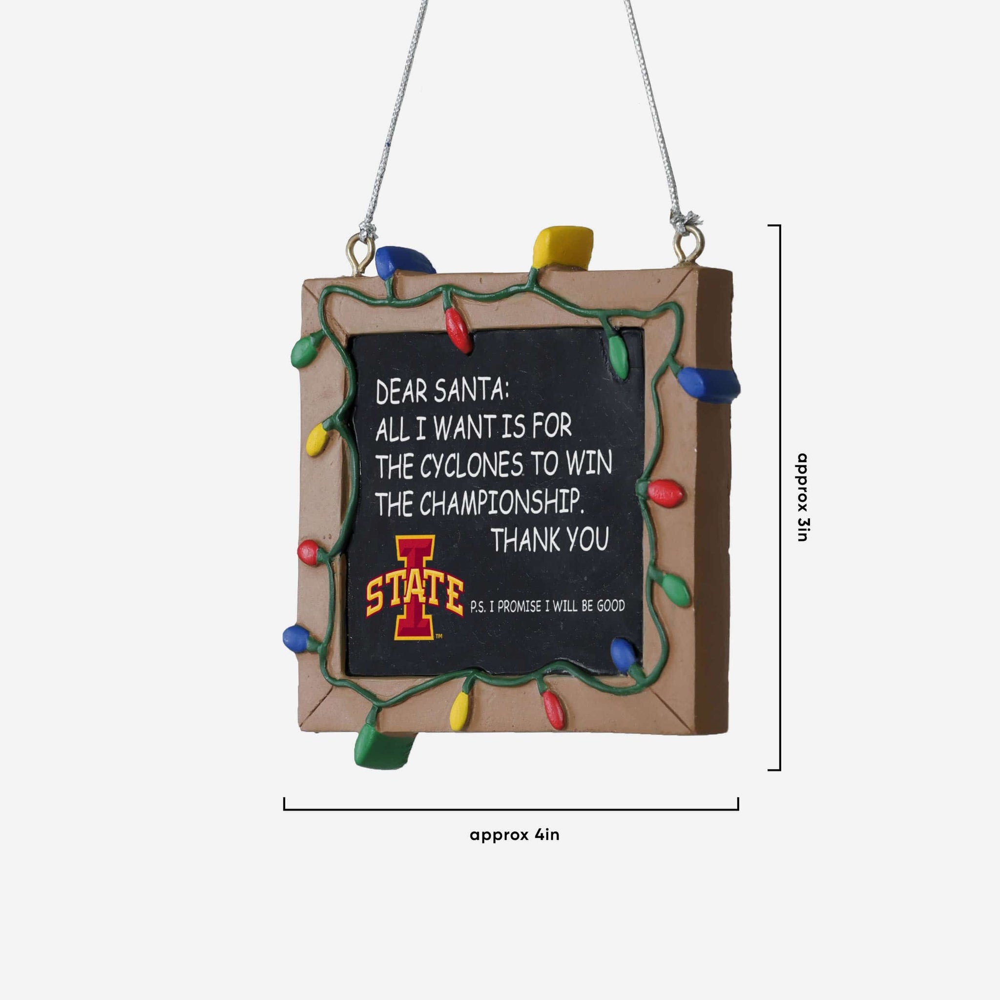 So, you made your list and sent it to jolly ol' Fanta Claus, asking him for a championship. But sometimes letters can get lost in the mail. Just in case, put this Iowa State Cyclones Chalkboard Sign Ornament on your tree to let him know how good you've been this year, and that all you want for the holidays is a trophy.