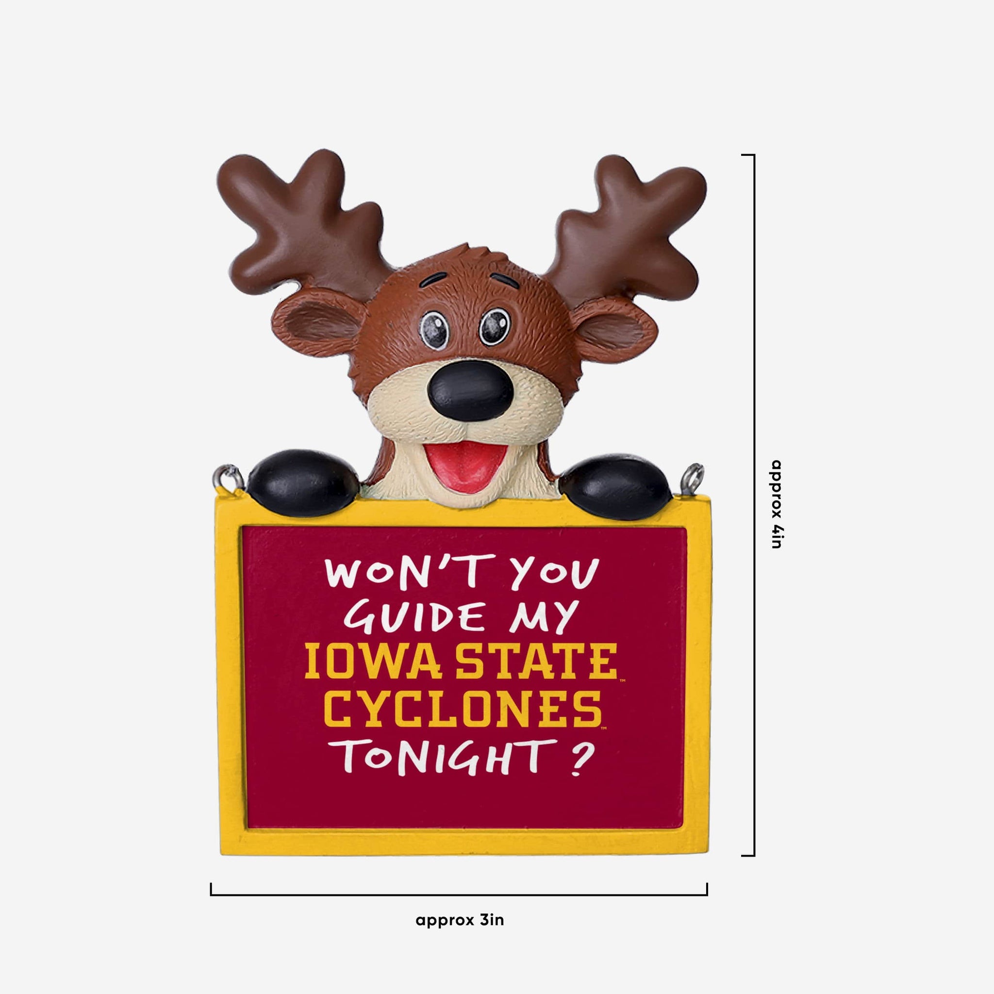 Tired: Dasher. Dancer. Prancer. Vixen. Wired: This Iowa State Cyclones Reindeer with Sign Ornament.
