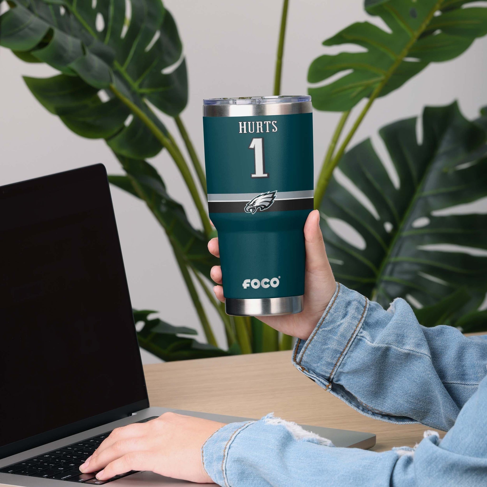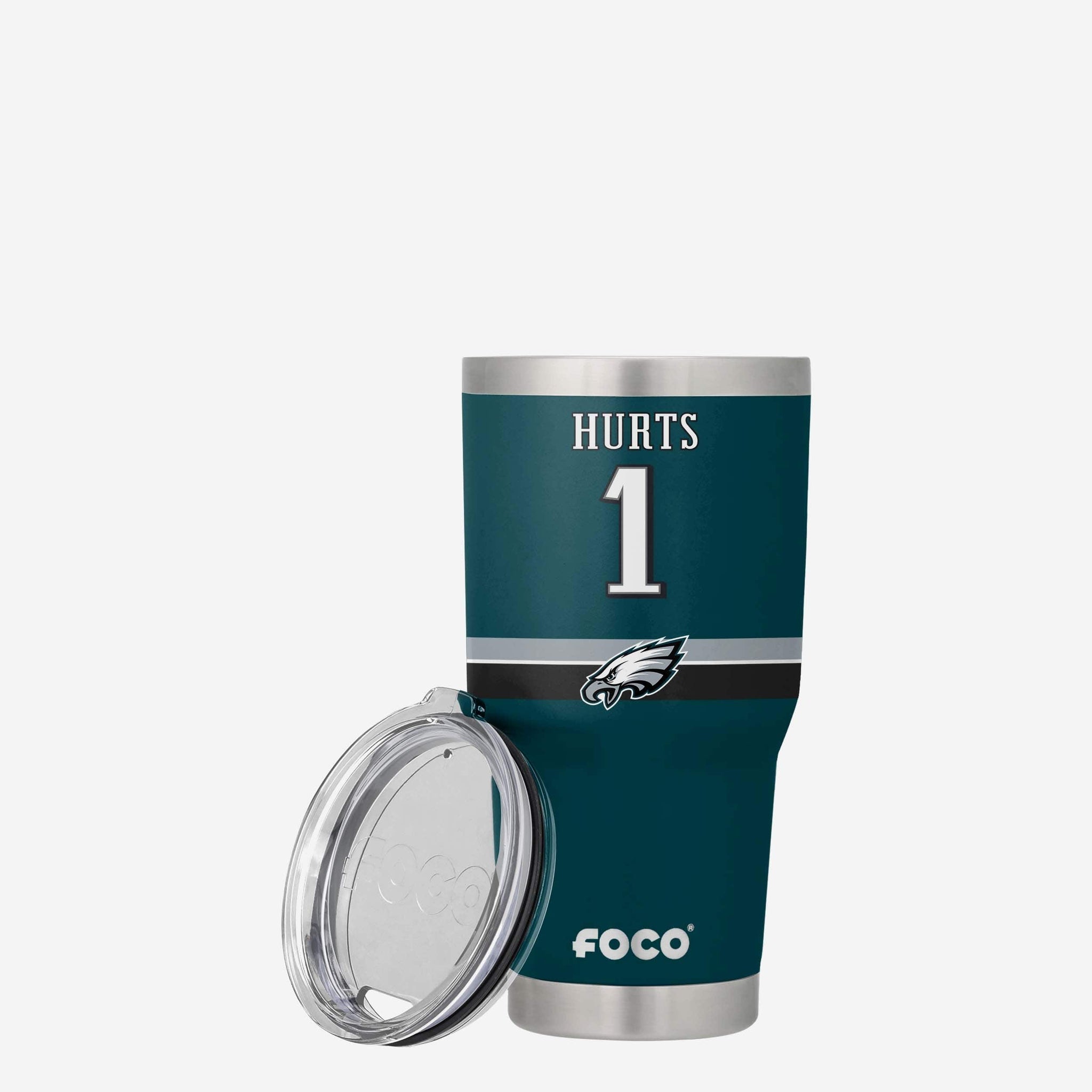Sip with the support of your favorite star! Whether it’s keeping your coffee warm on a cold, winter day or keeping your water nice and cool in the dog days of summer, this Jalen Hurts Philadelphia Eagles Team Logo 30 oz. Player Tumbler is here to keep your drink just how you like it.