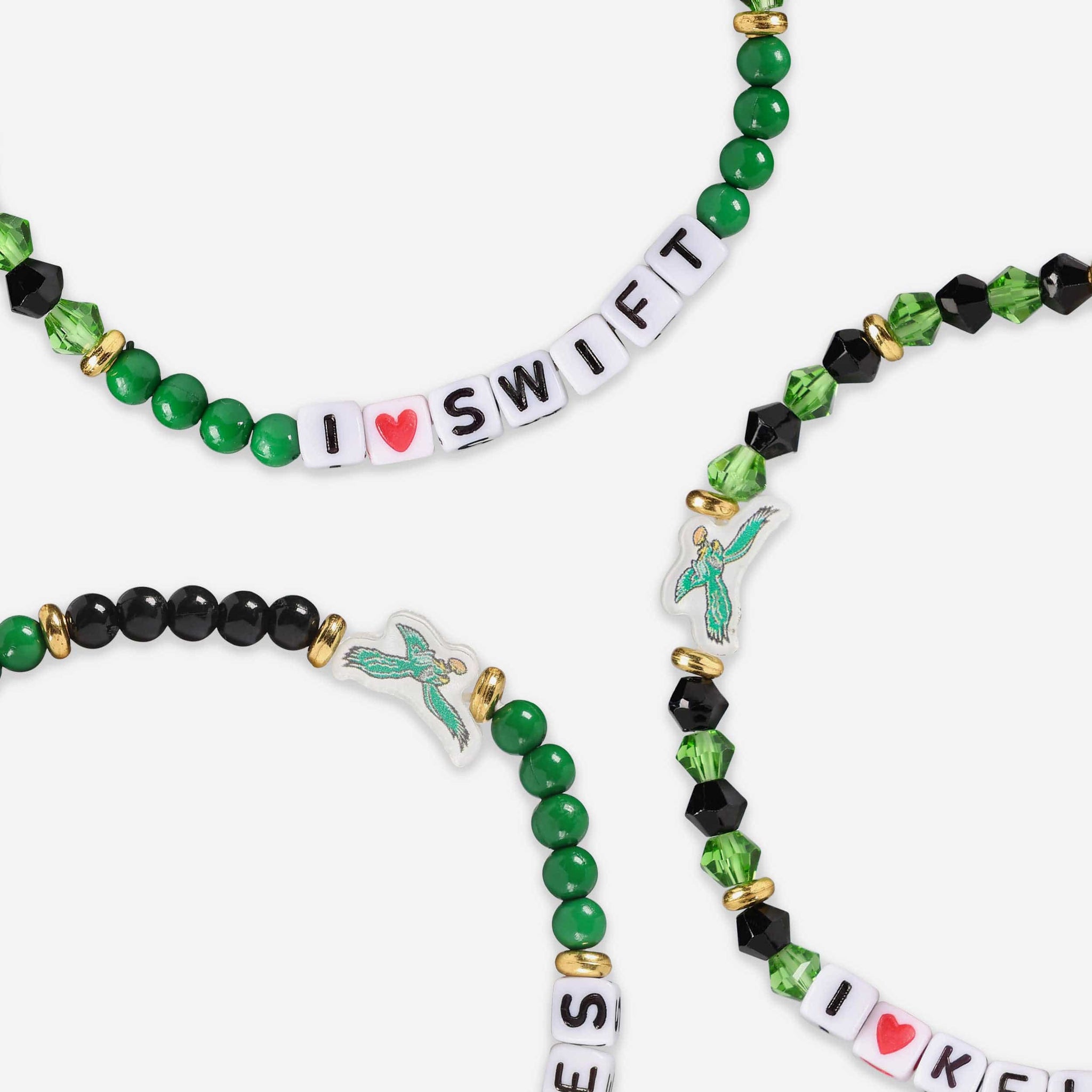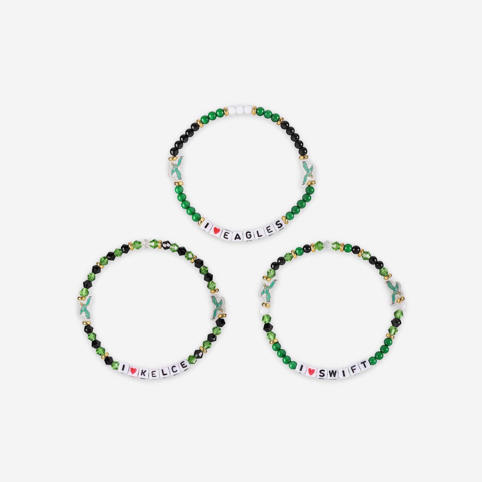 Accessorize and maximize your fandom while impressing your fellow fans with this Jason Kelce & D'Andre Swift Philadelphia Eagles Retro Kelly Green 3 Pack Friendship Bracelet. These matching friendship bracelets have an all-over team-colored design and team logo displays, which makes them the perfect way to show your support for the Philadelphia Eagles and get in on the latest accessory craze.