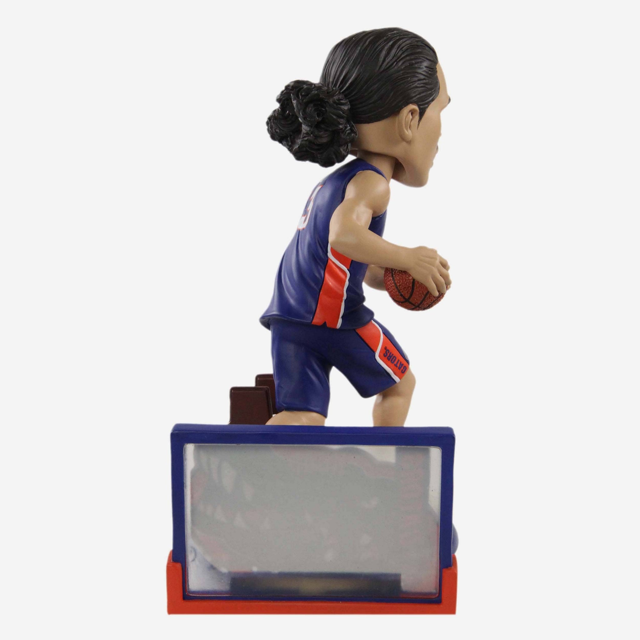 - Backboard-style backdrop with player name, jersey number, and multiple team logo displays, leaving no doubt where your allegiances lie