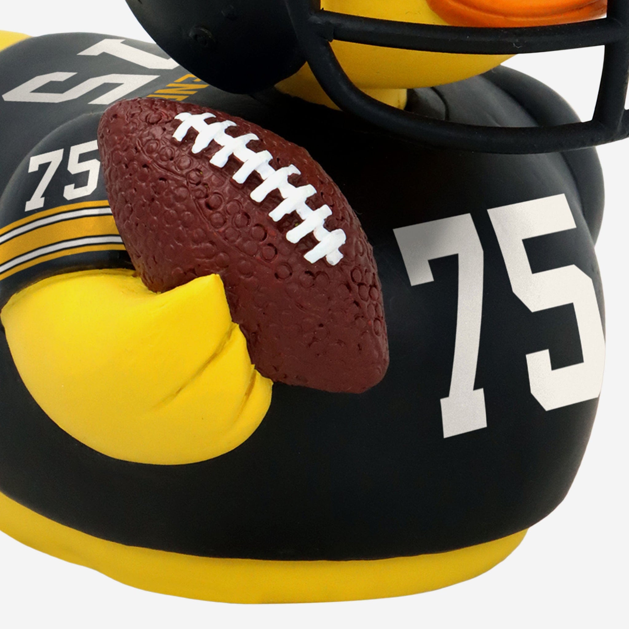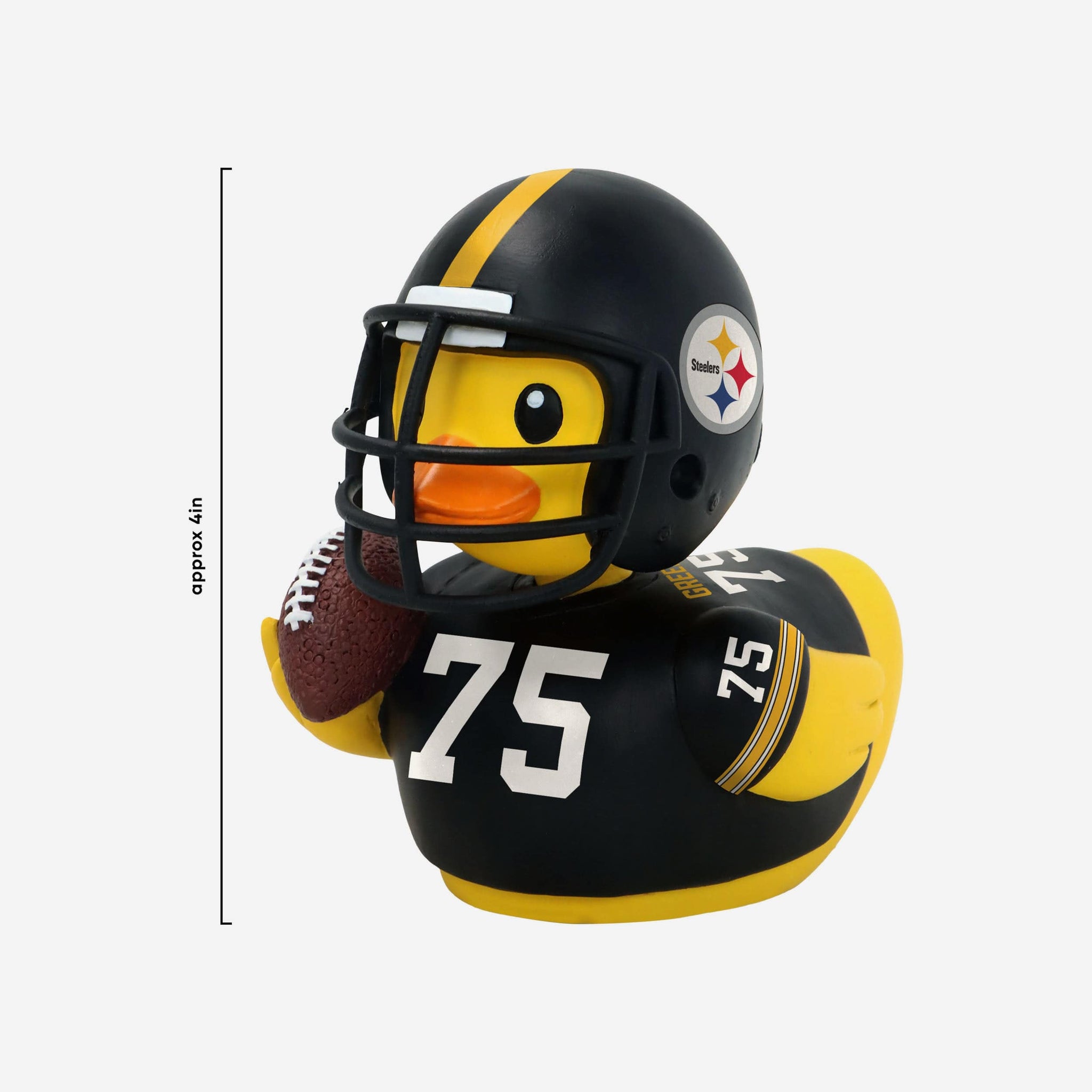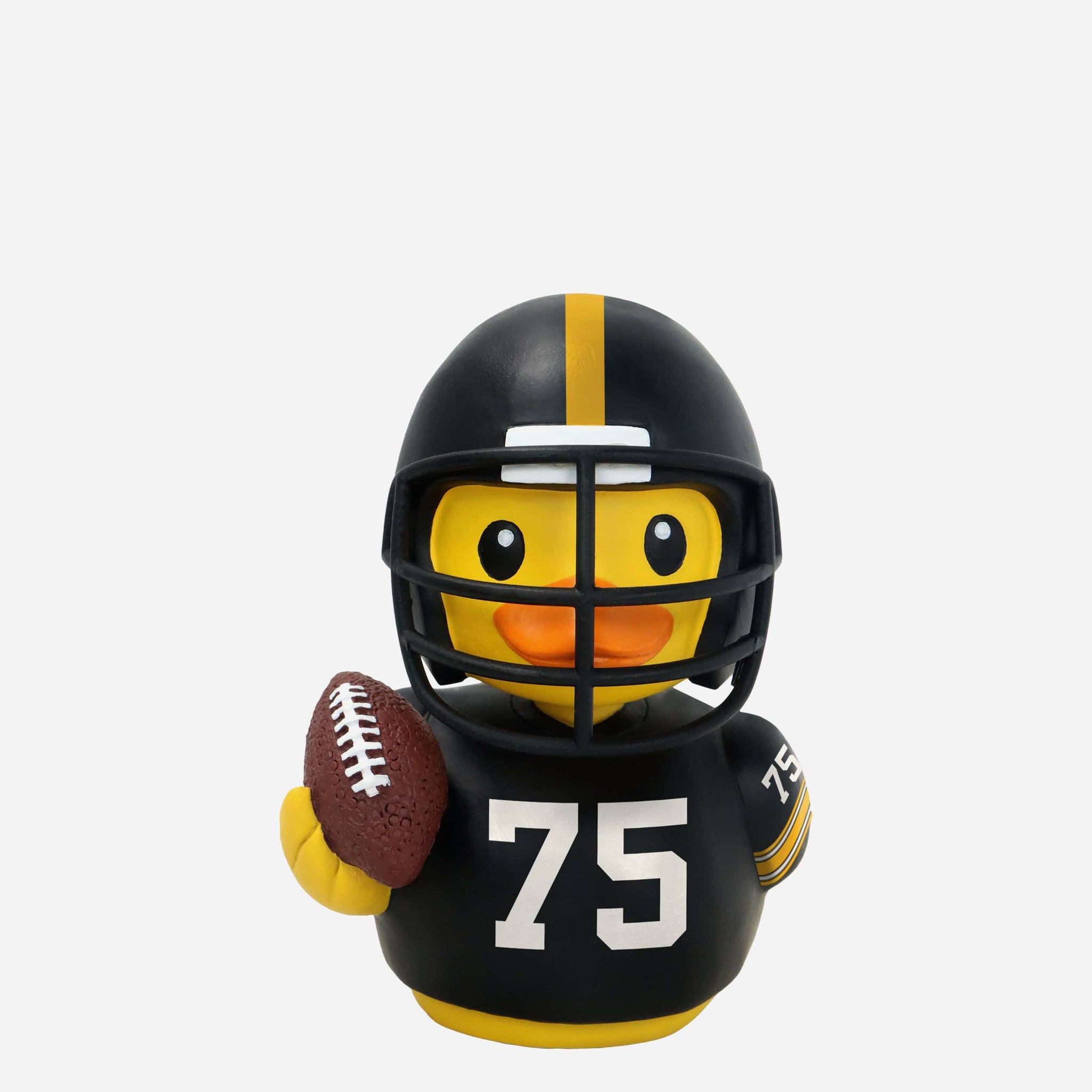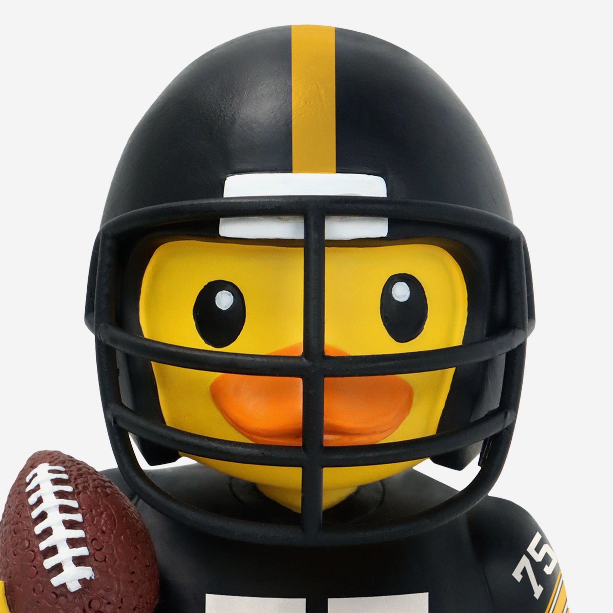- Portrays duck wearing Joe Greene’s black gameday uniform and helmet with team logo, ready to make a splash in your collection