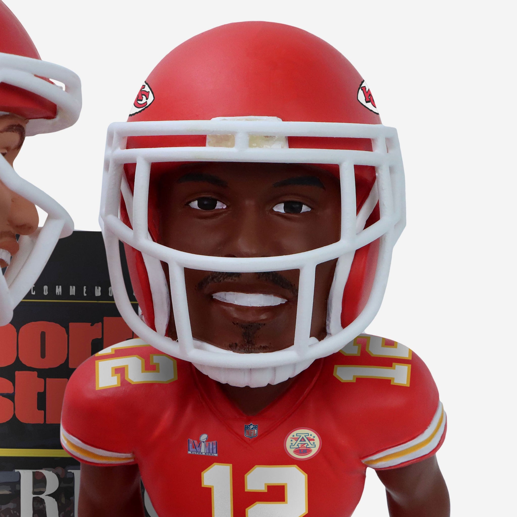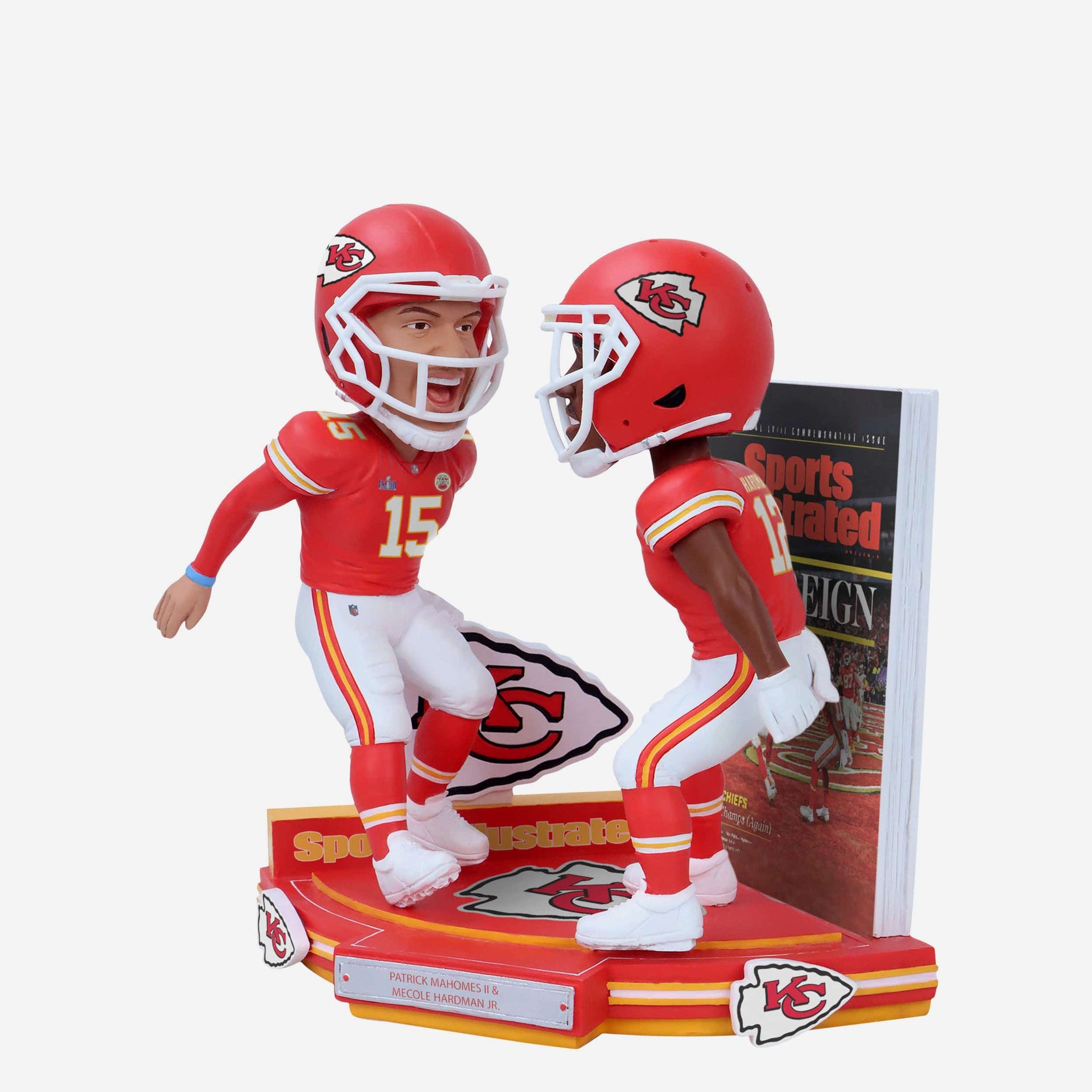 • Portrays Patrick Mahomes and Mecole Hardman wearing their red gameday uniforms, re-creating their famous Sports Illustrated cover